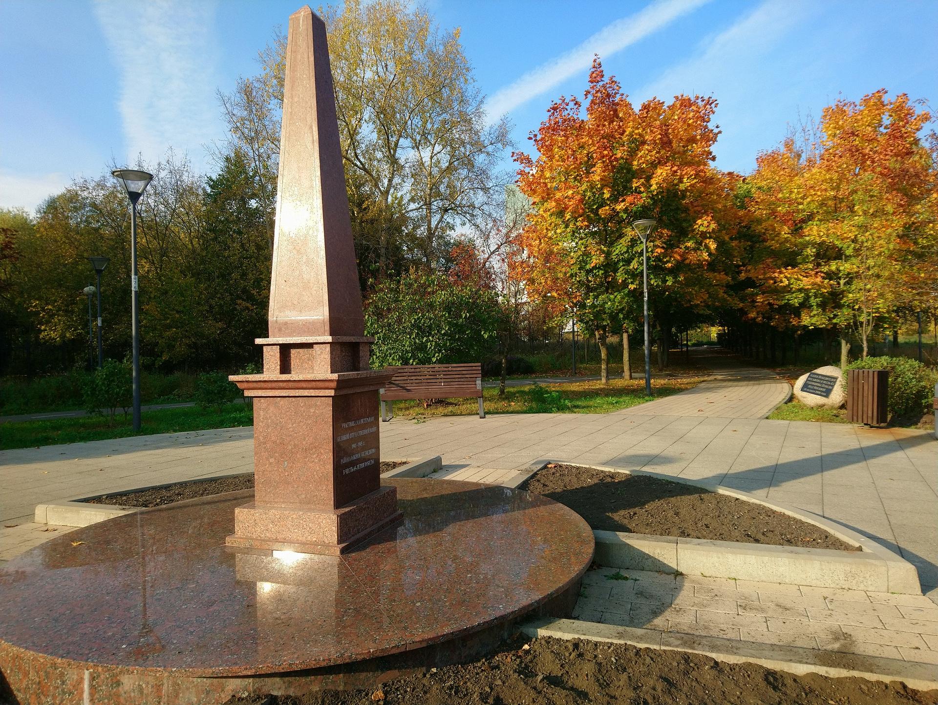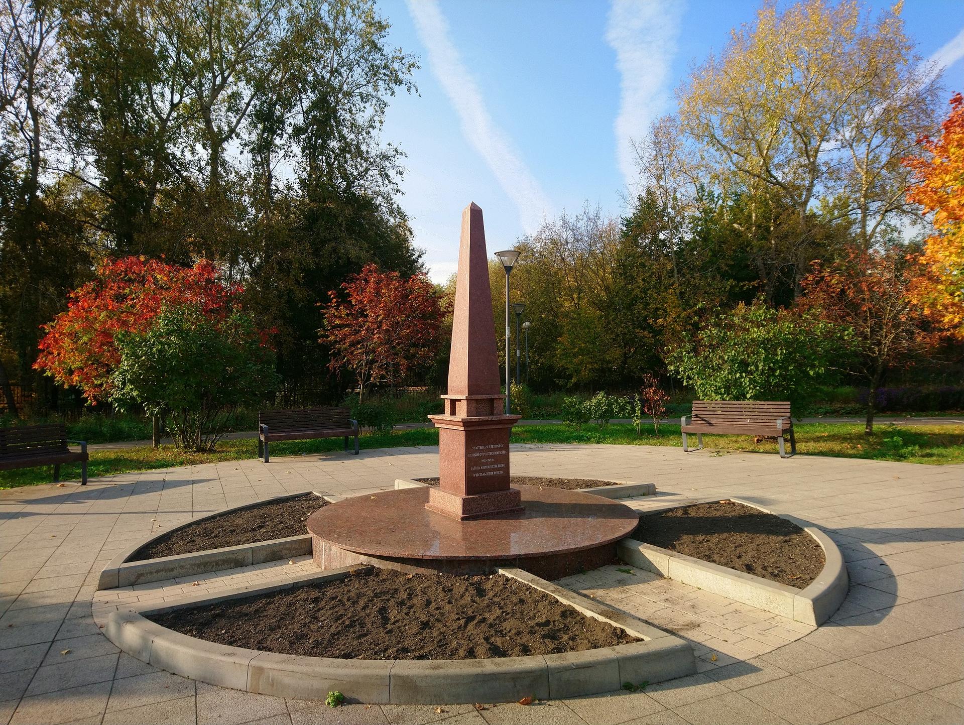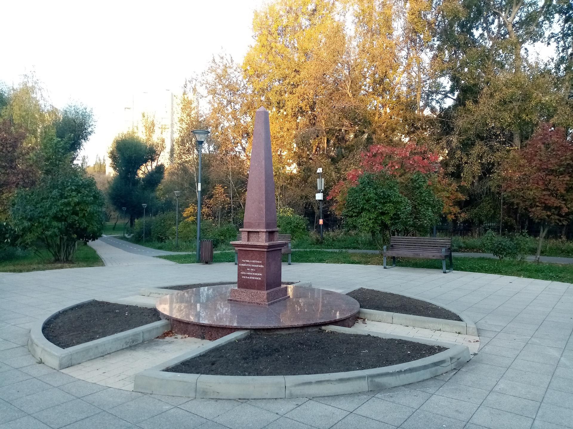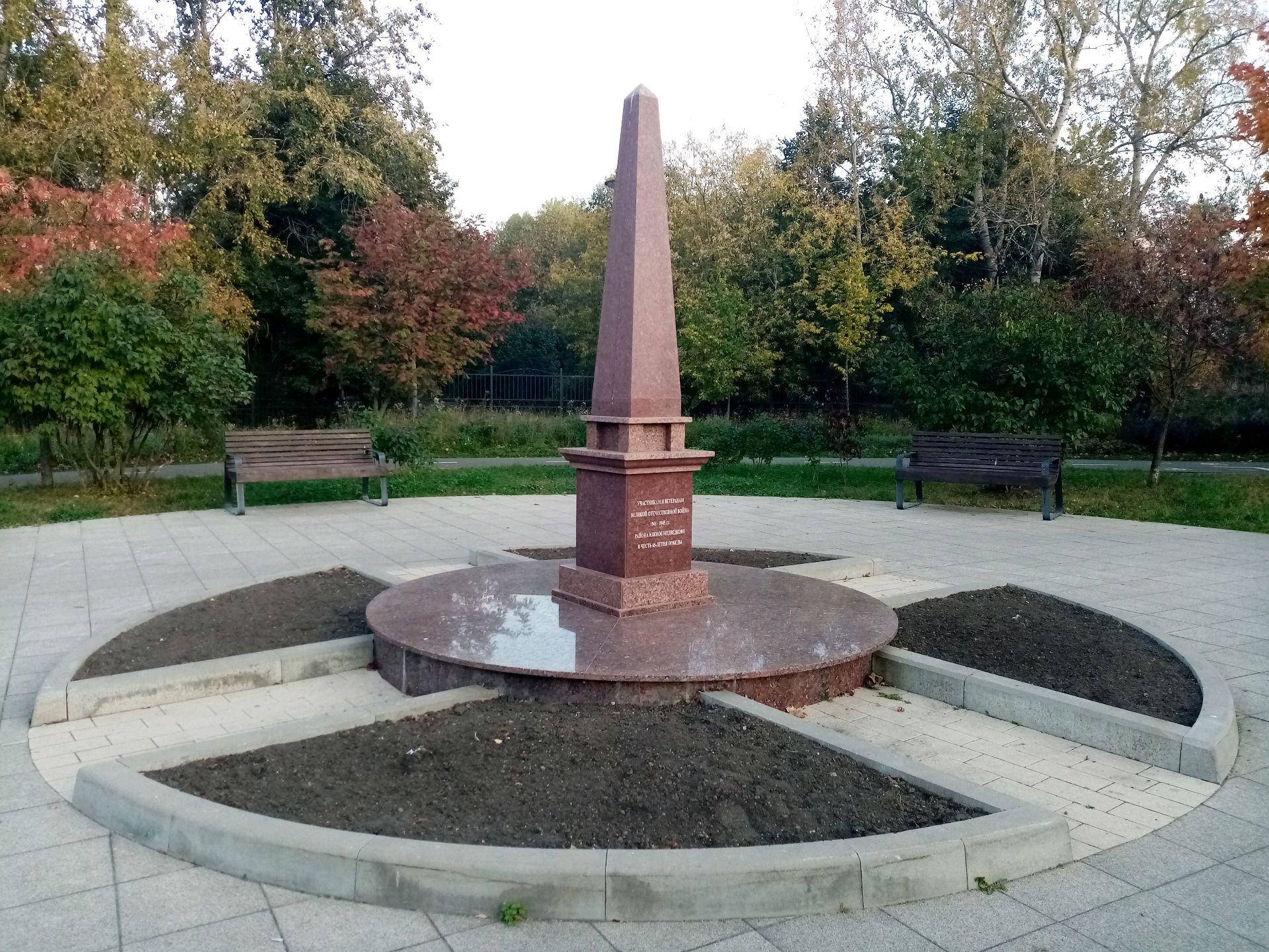 Памятник «В честь 65-летия Победы в Великой Отечественной войне» установлен в мае 2010 г. на территории Певческого поля. Представляет собой обелиск из плит полированного гранита. На одной из его сторон вырезана надпись: «Участникам и ветеранам Великой Отечественной войны 1941-1945 гг. Южного Медведкова в честь 65-летия Победы», на другой — «Помнит мир спасенный, мир вечный, мир живой...».