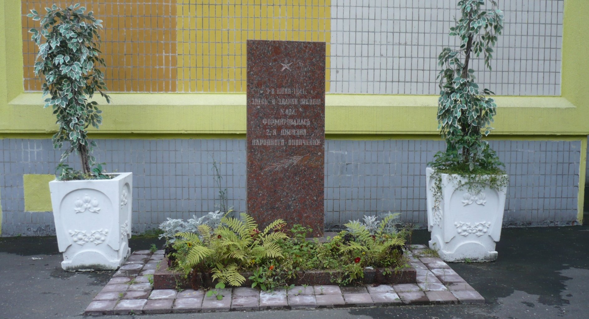 Памятник представляет собой плиту из красного гранита, установленную вертикально на гранитное основание. В верхней части стелы прорезана пятиконечная звезда, в нижней — лавровая ветвь. В центральной части лицевого фасада выполнена посвятительная надпись прорезными буквами: «3-8 июля 1941 г. здесь в здании школы № 434 формировалась 2-я дивизия народного ополчения».