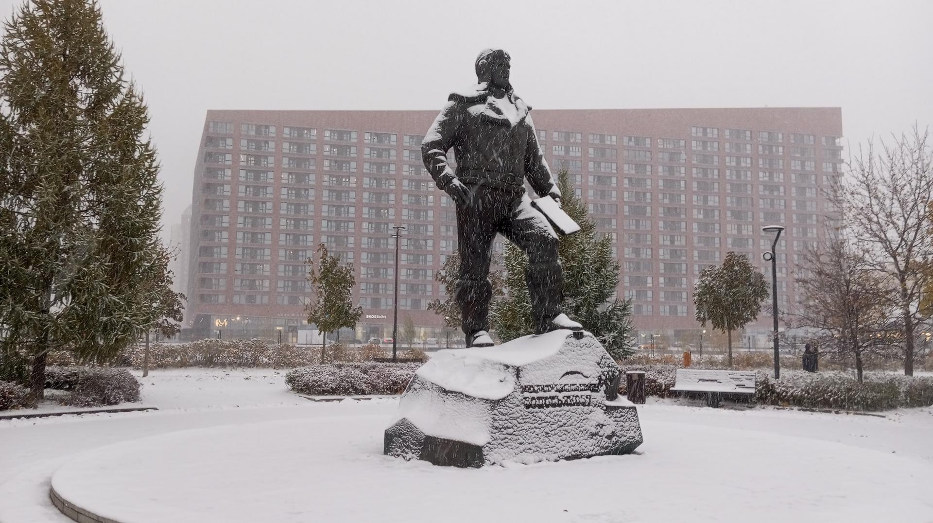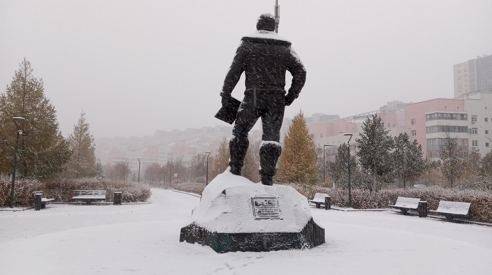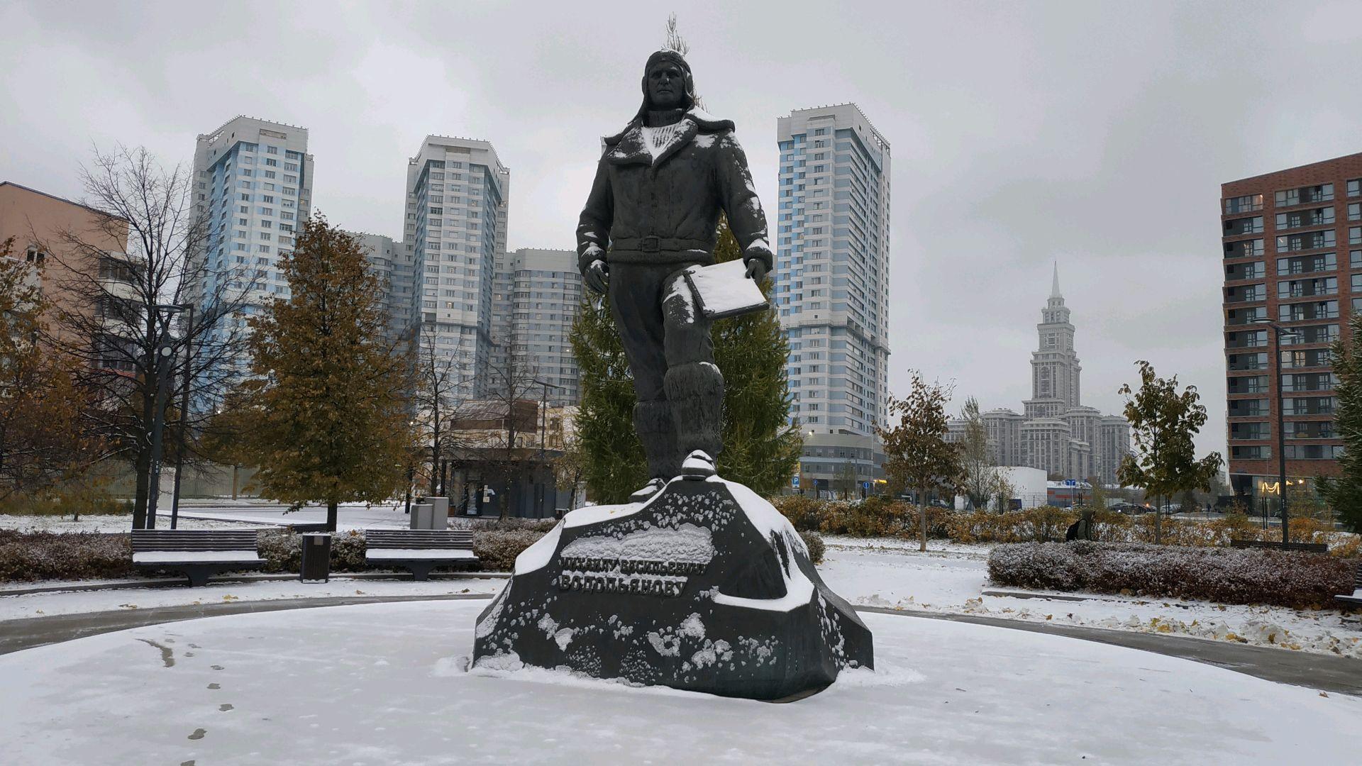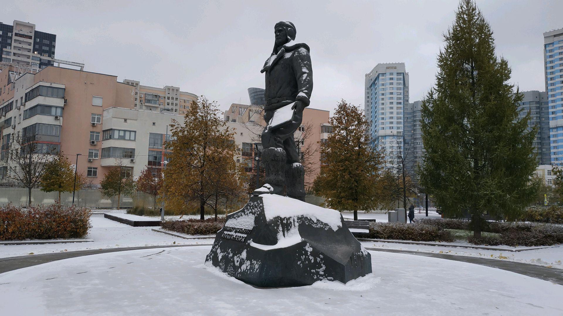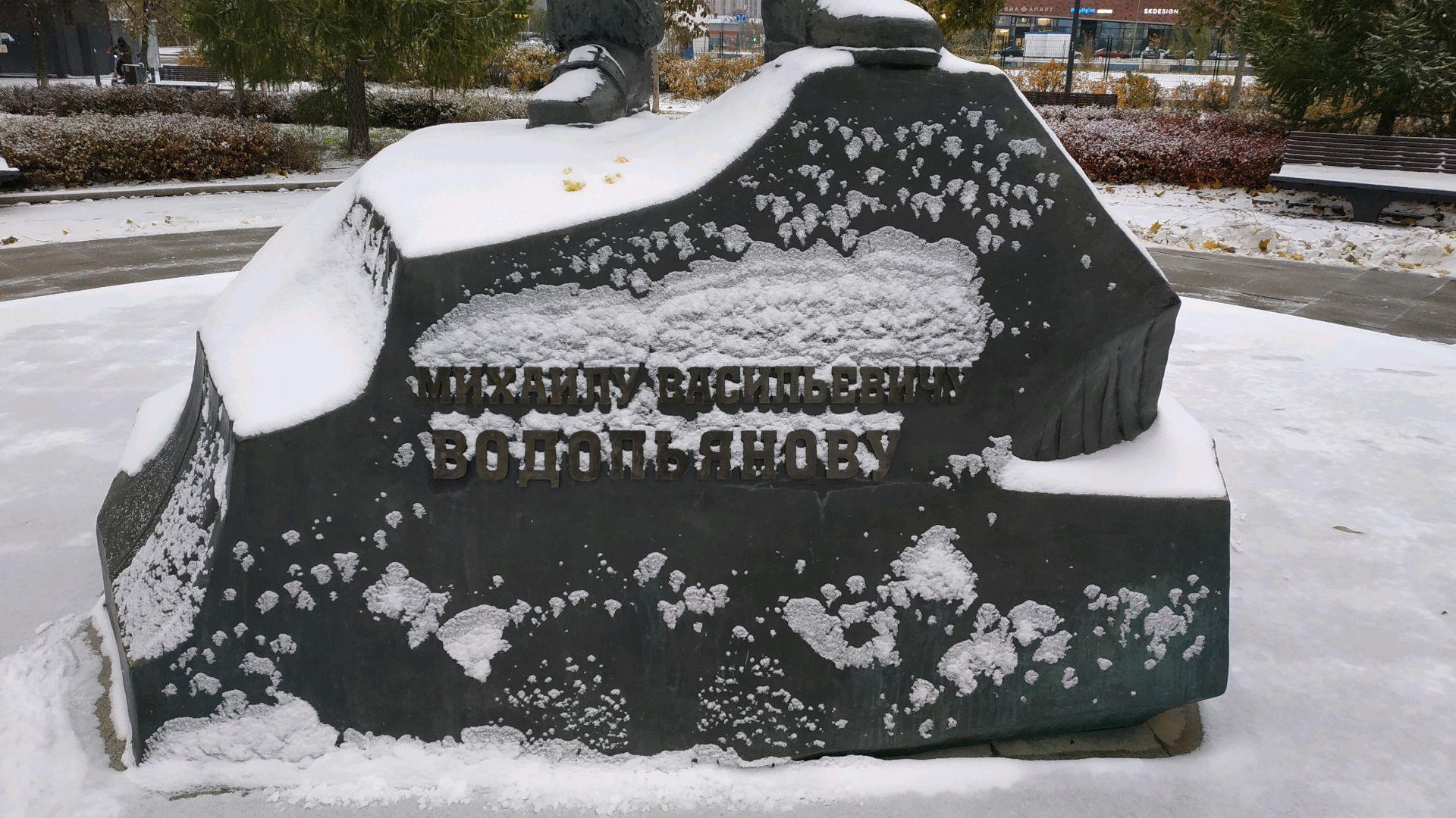 Памятник представляет собой бронзовую фигуру на гранитном постаменте, стилизованном под «глыбу льда». М. В. Водопьянов изображен в форме летчика, в его руке карта. Памятник посвящен первому в истории приземлению на льды Северного полюса, осуществленному Водопьяновым в 1936 г.