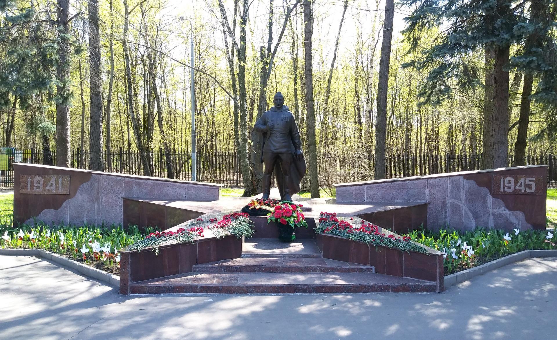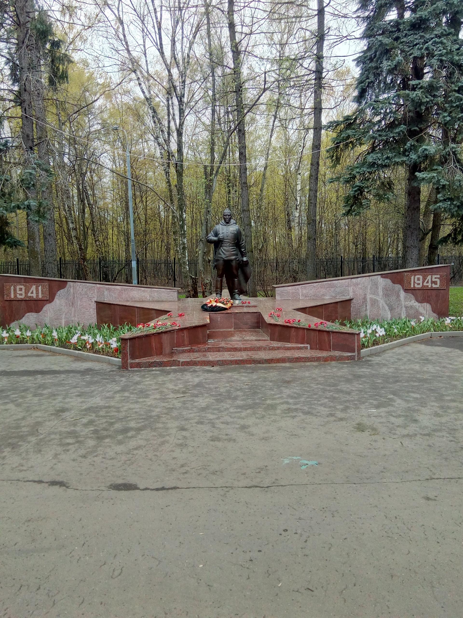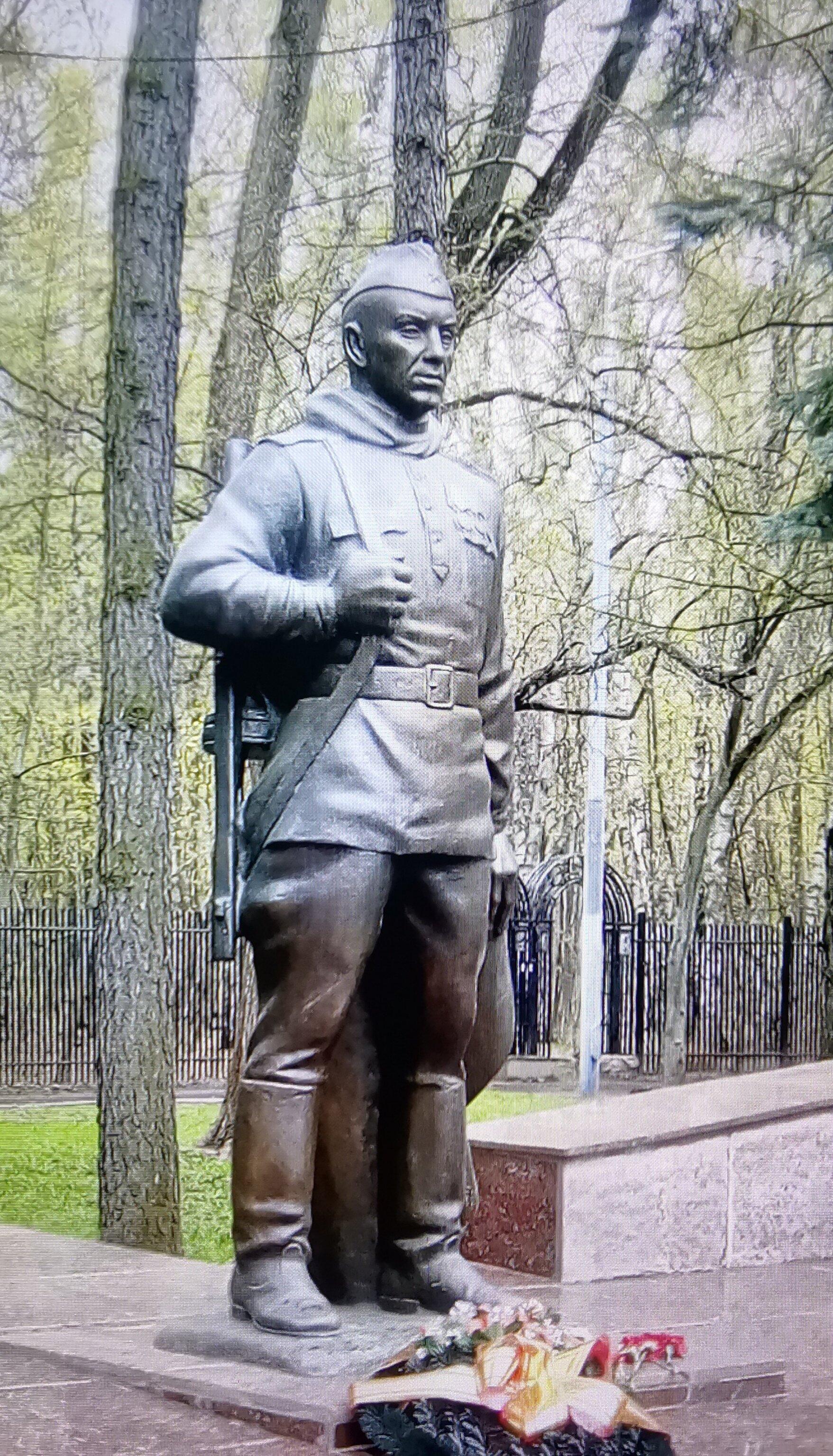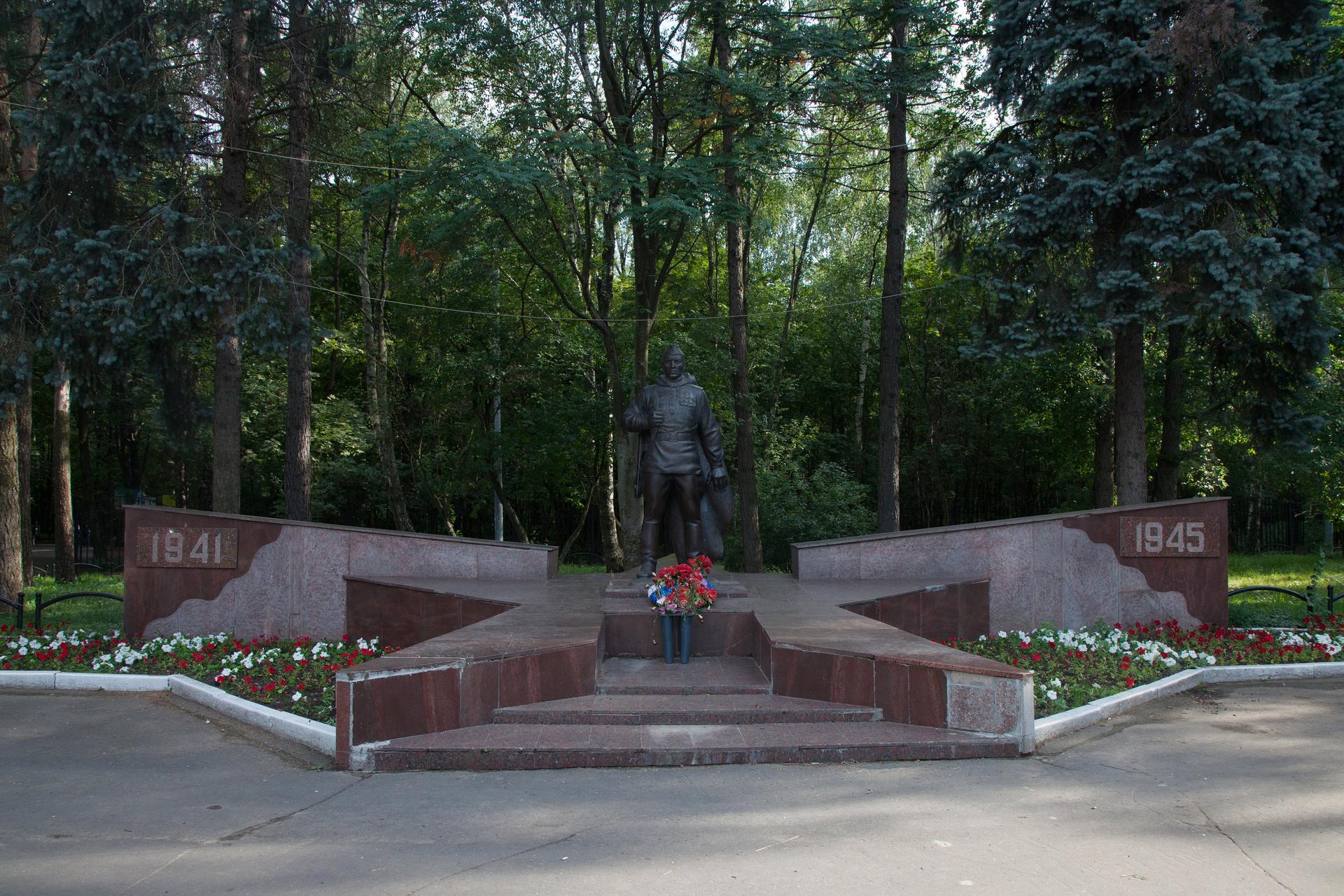 Памятник представляет собой бронзовую фигуру советского солдата-пехотинца в пилотке и плащ-палатке. За правым плечом воина автомат, ремень которого он поддерживает рукой. Скульптура установлена на постаменте в форме пятиконечной звезды — символа Советской армии, облицованном плитами красного полированного гранита. Справа и слева от постамента расположены две подпорные стены, также облицованные плитами красного гранита. На стенах установлены гранитные накладные доски с нанесенными на них в технике плоскостного орнамента датами начала и окончания ВОВ.