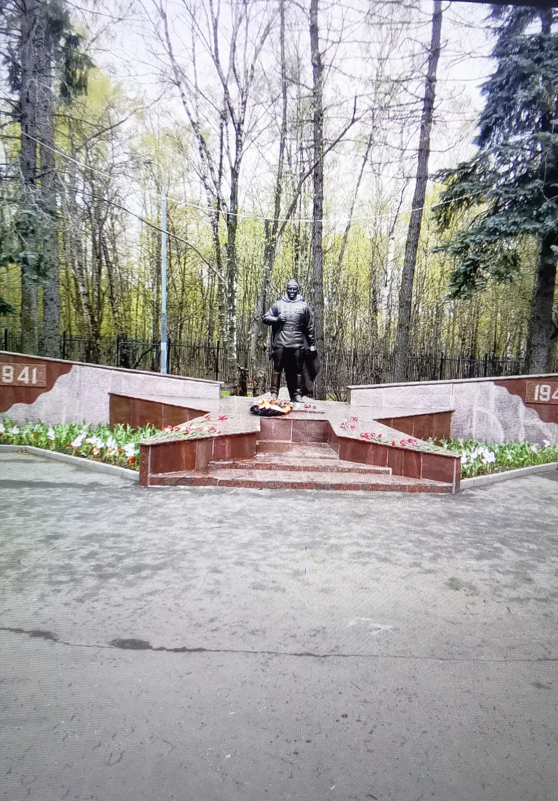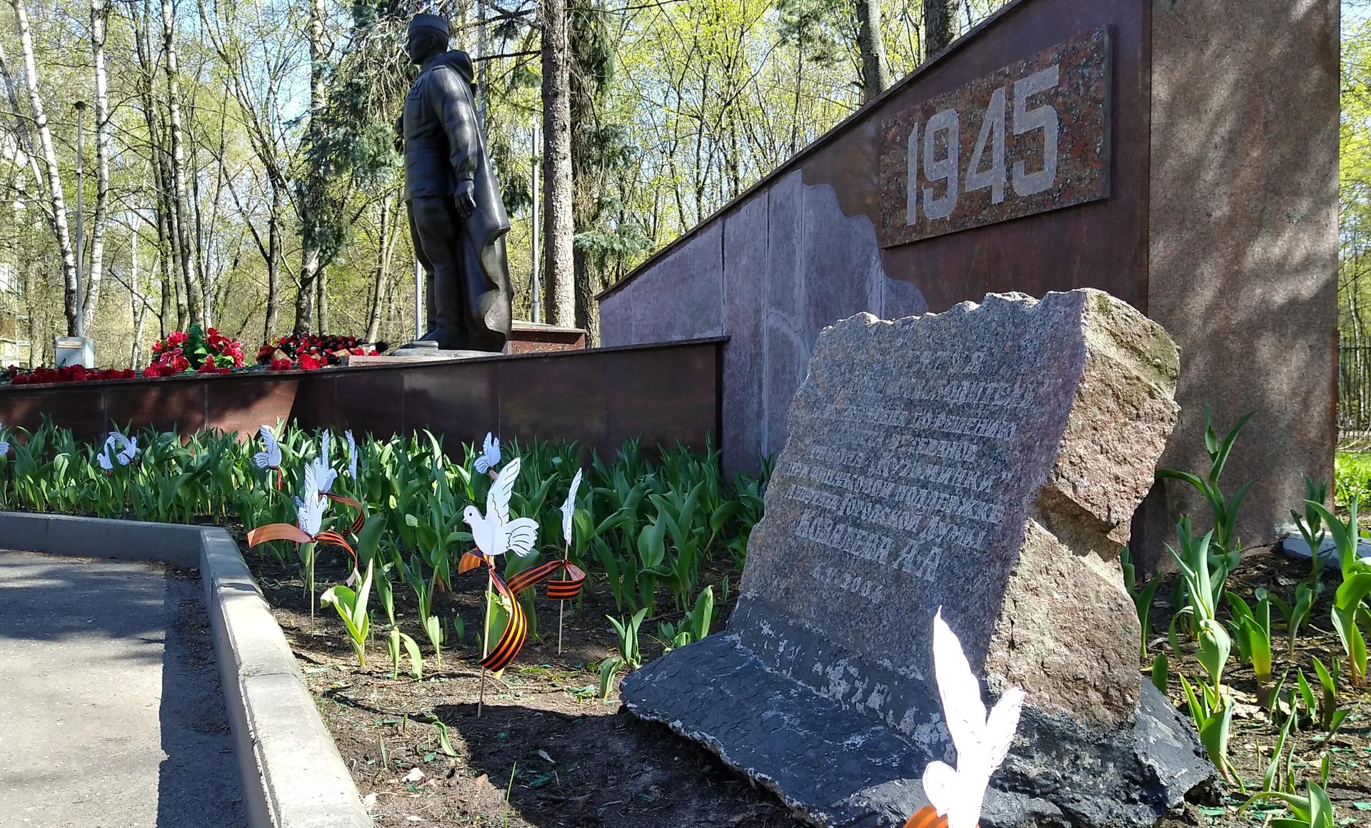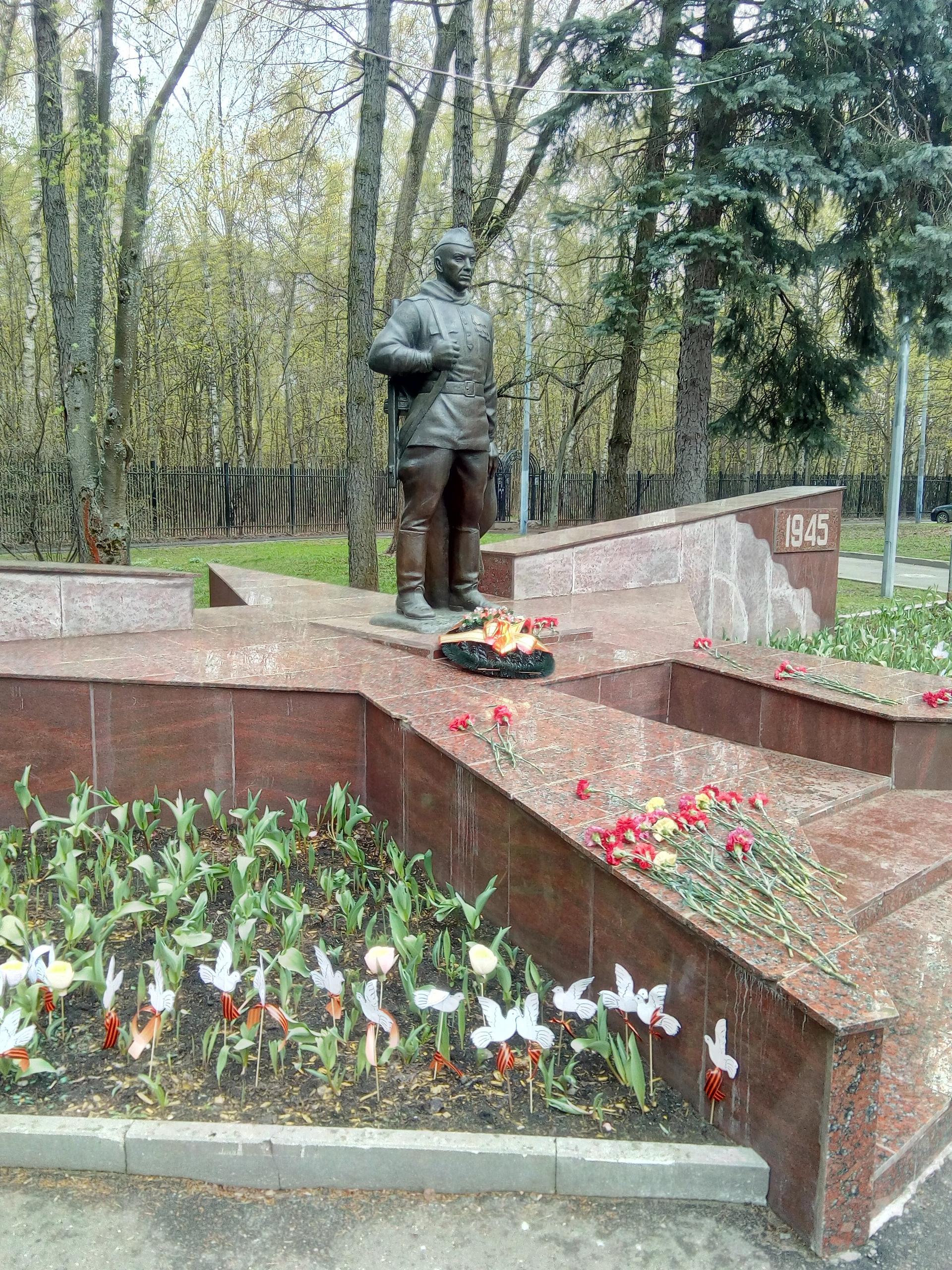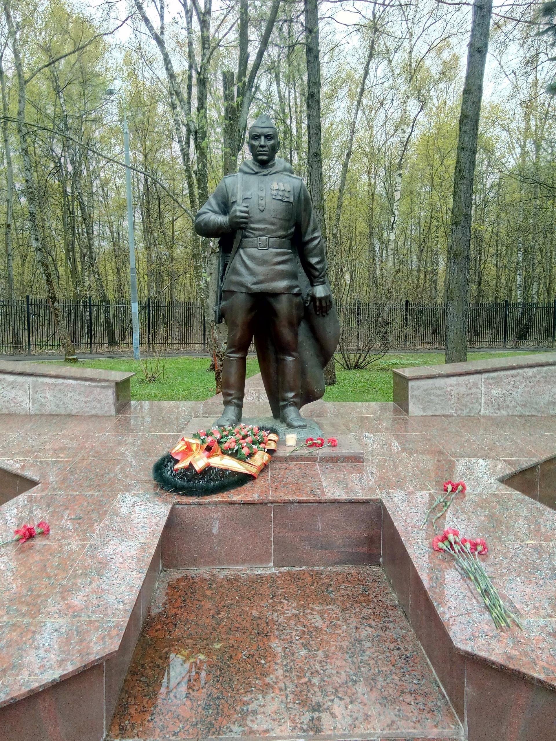 Памятник представляет собой бронзовую фигуру советского солдата-пехотинца в пилотке и плащ-палатке. За правым плечом воина автомат, ремень которого он поддерживает рукой. Скульптура установлена на постаменте в форме пятиконечной звезды — символа Советской армии, облицованном плитами красного полированного гранита. Справа и слева от постамента расположены две подпорные стены, также облицованные плитами красного гранита. На стенах установлены гранитные накладные доски с нанесенными на них в технике плоскостного орнамента датами начала и окончания ВОВ.