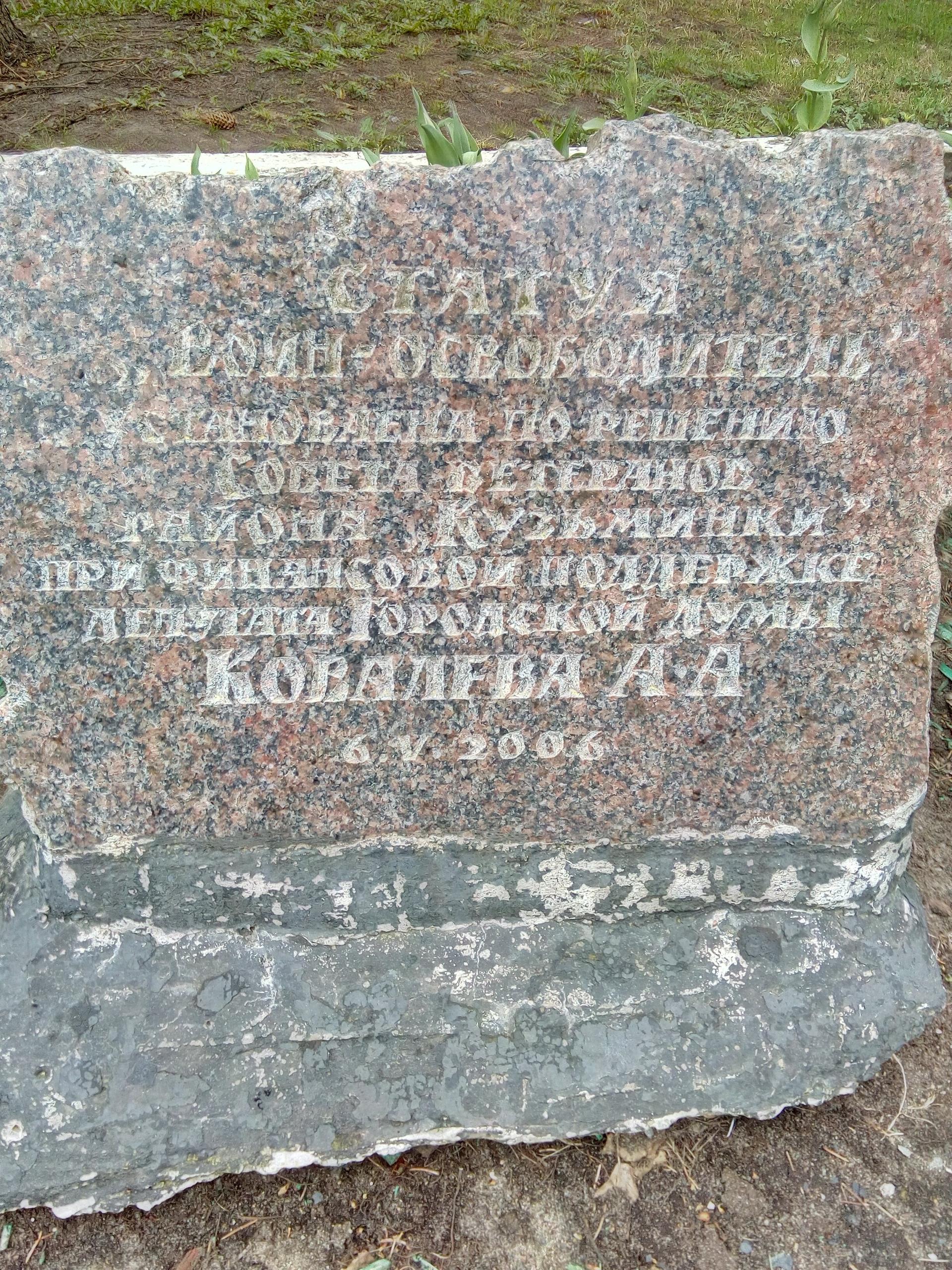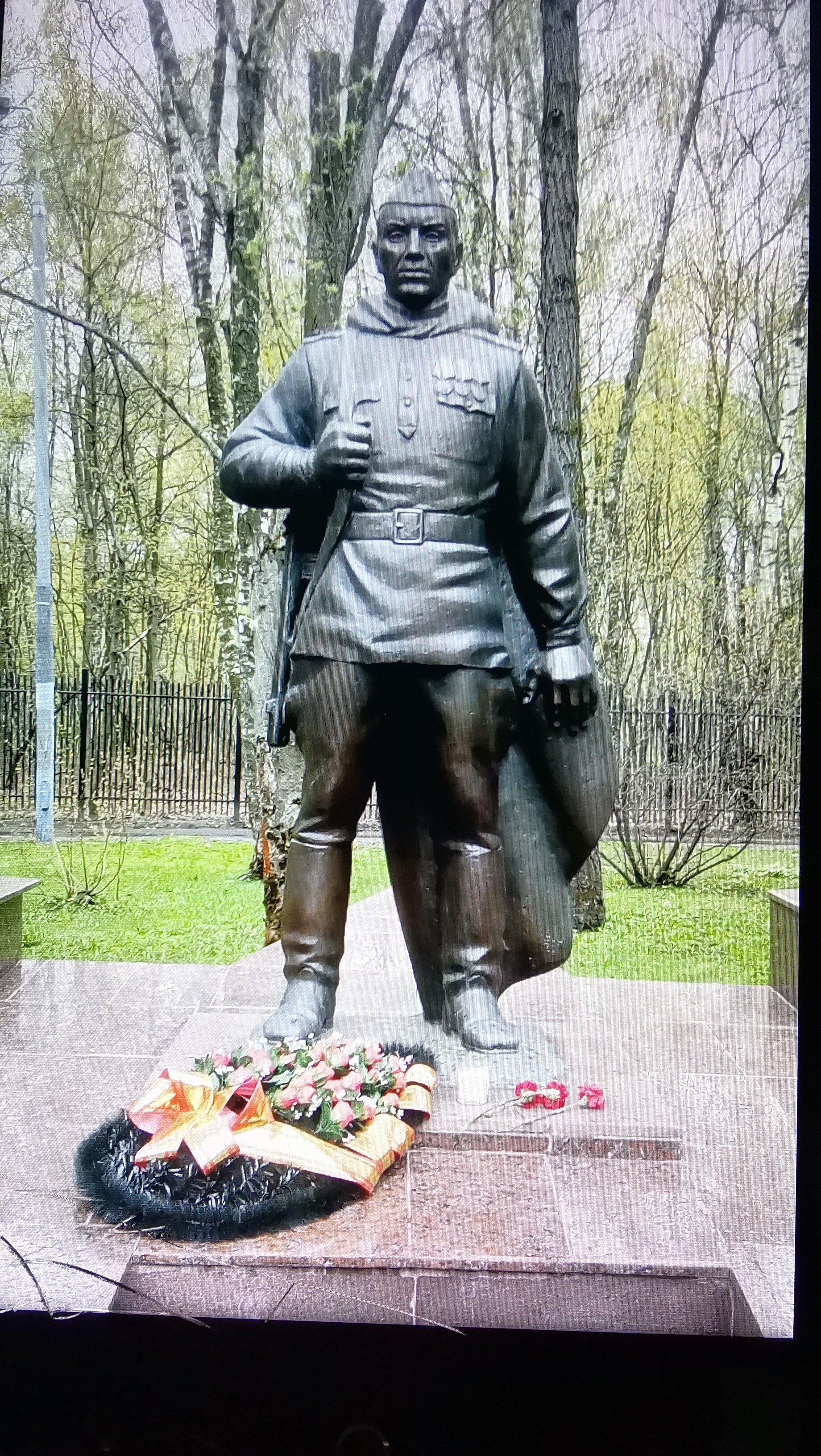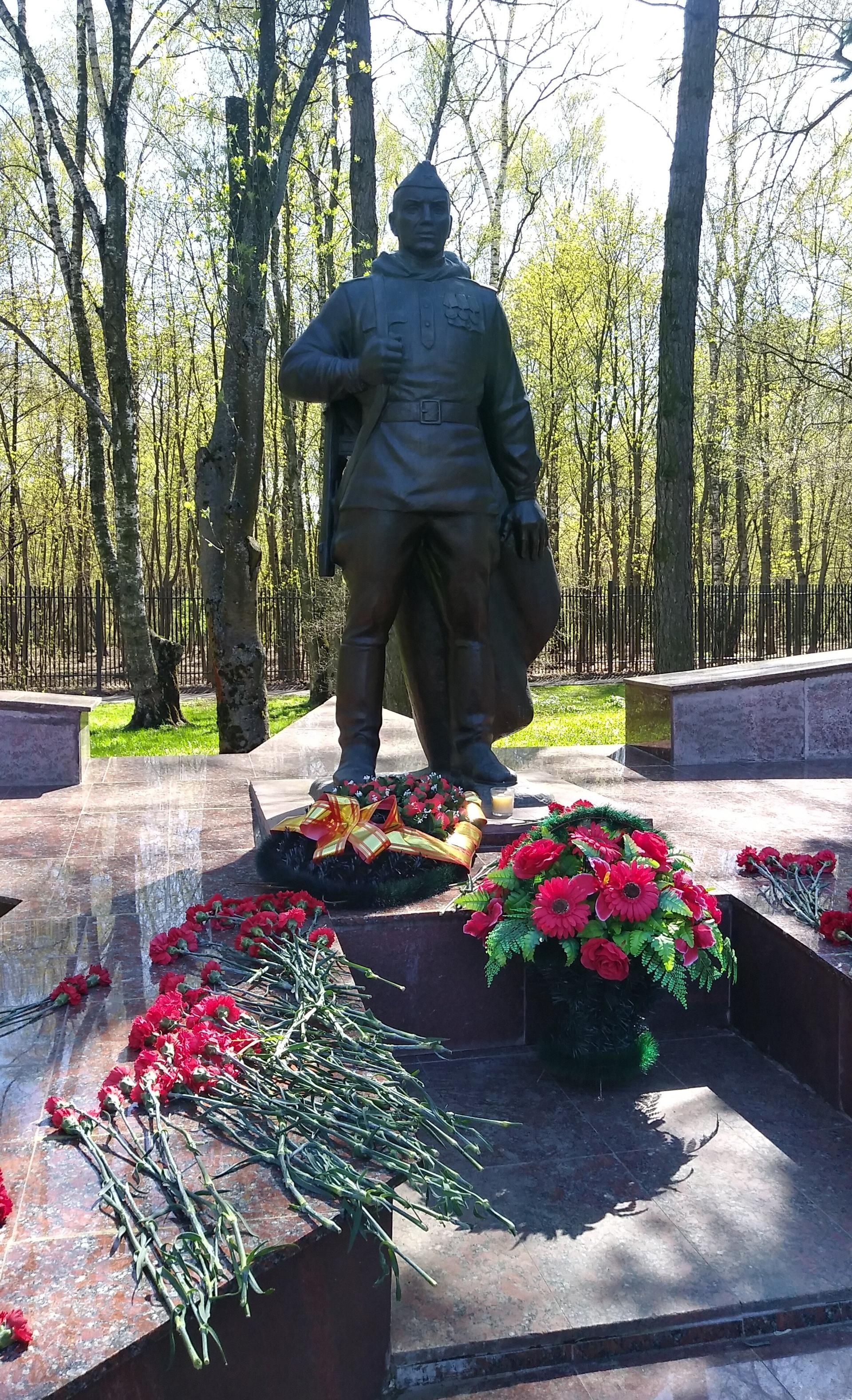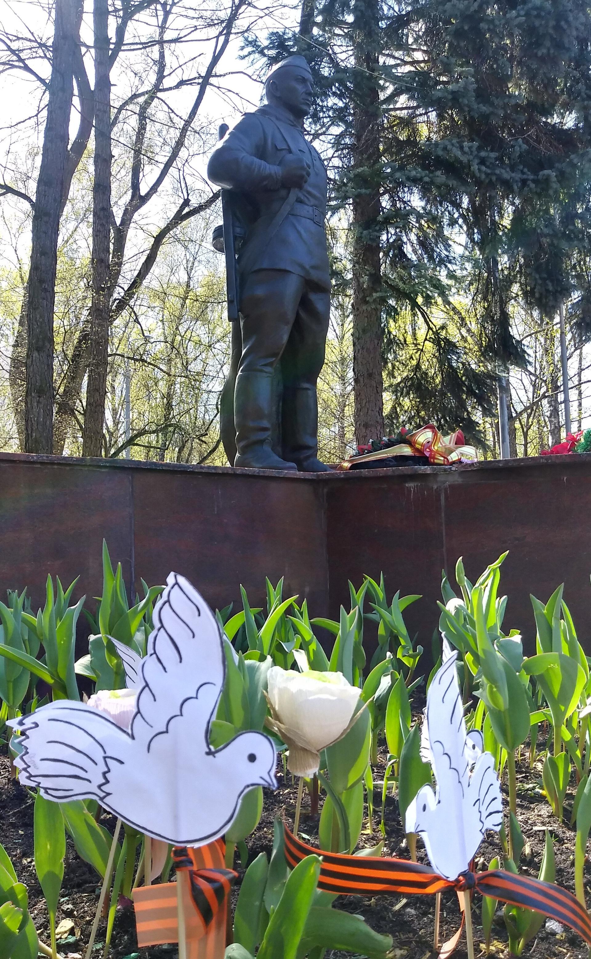 Памятник представляет собой бронзовую фигуру советского солдата-пехотинца в пилотке и плащ-палатке. За правым плечом воина автомат, ремень которого он поддерживает рукой. Скульптура установлена на постаменте в форме пятиконечной звезды — символа Советской армии, облицованном плитами красного полированного гранита. Справа и слева от постамента расположены две подпорные стены, также облицованные плитами красного гранита. На стенах установлены гранитные накладные доски с нанесенными на них в технике плоскостного орнамента датами начала и окончания ВОВ.
