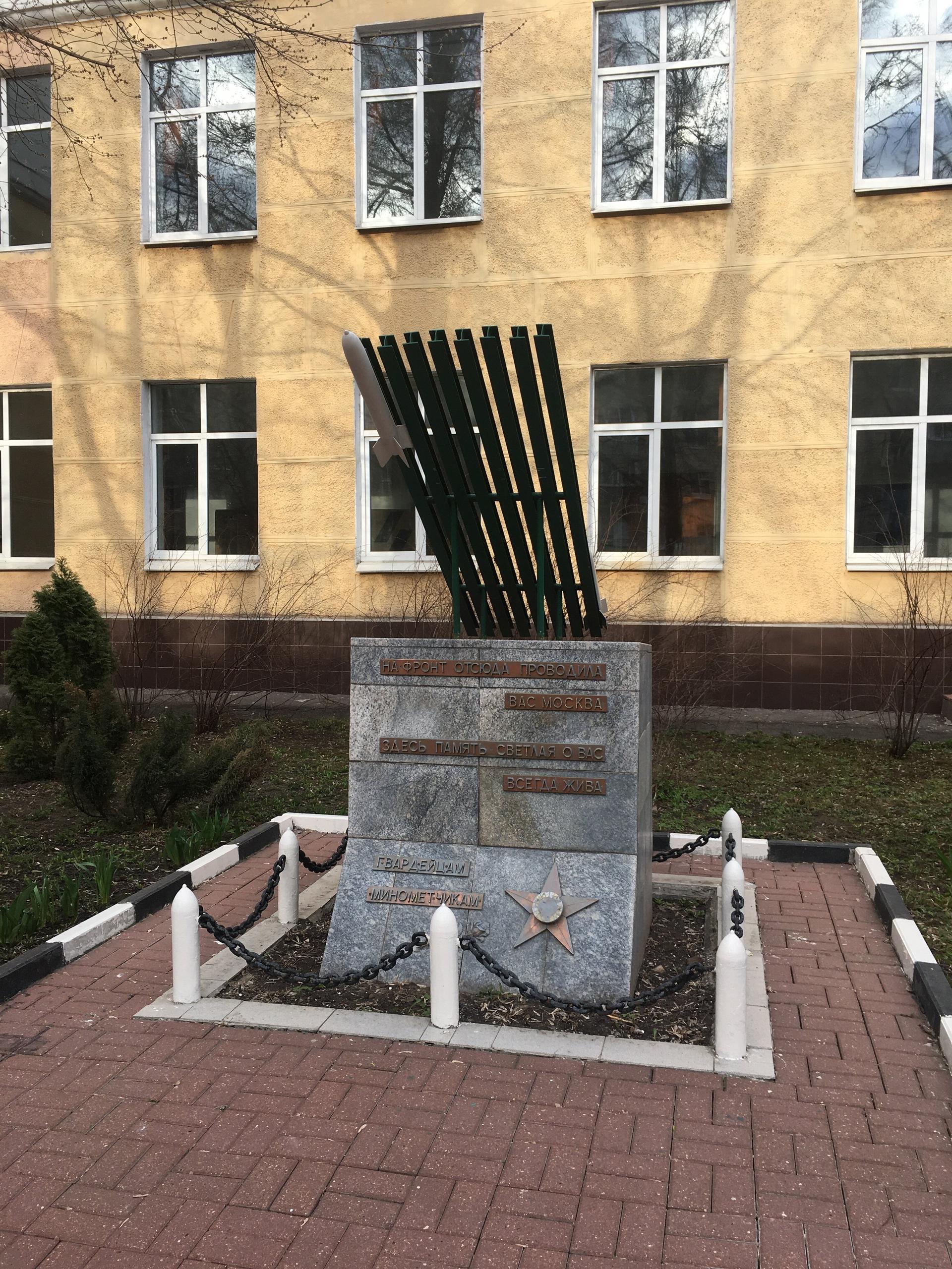 Памятник представляет собой призматическое основание с шестью направленными вверх балками, на одной из которых лежит снаряд.. На основании надпись: «На фронт отсюда проводила вас Москва, здесь память светлая о вас всегда жива». Ниже: «Гвардейцам-минометчикам». В правом нижнем углу основания располагается рельефное изображение ордена Красной Звезды и роза.