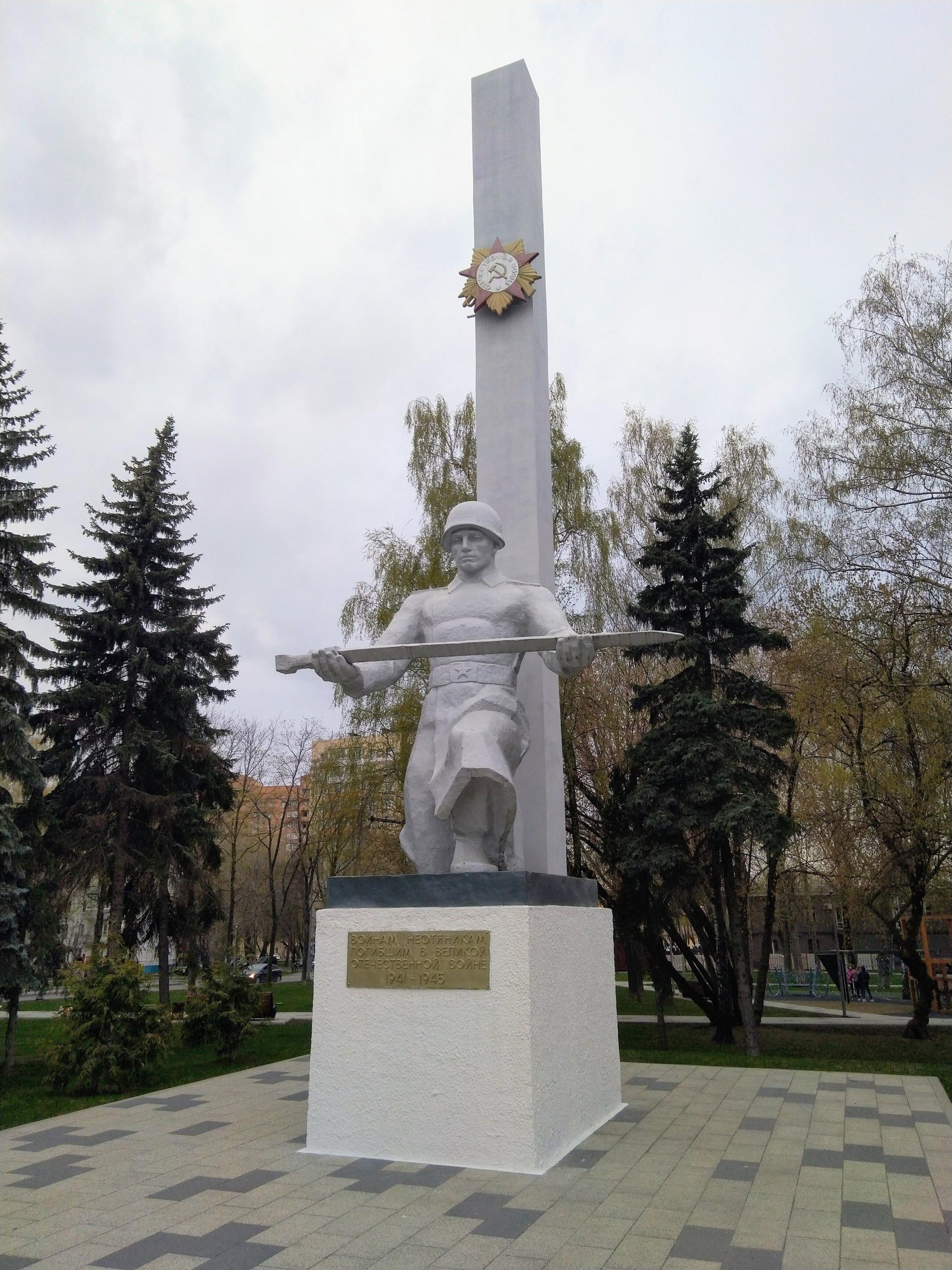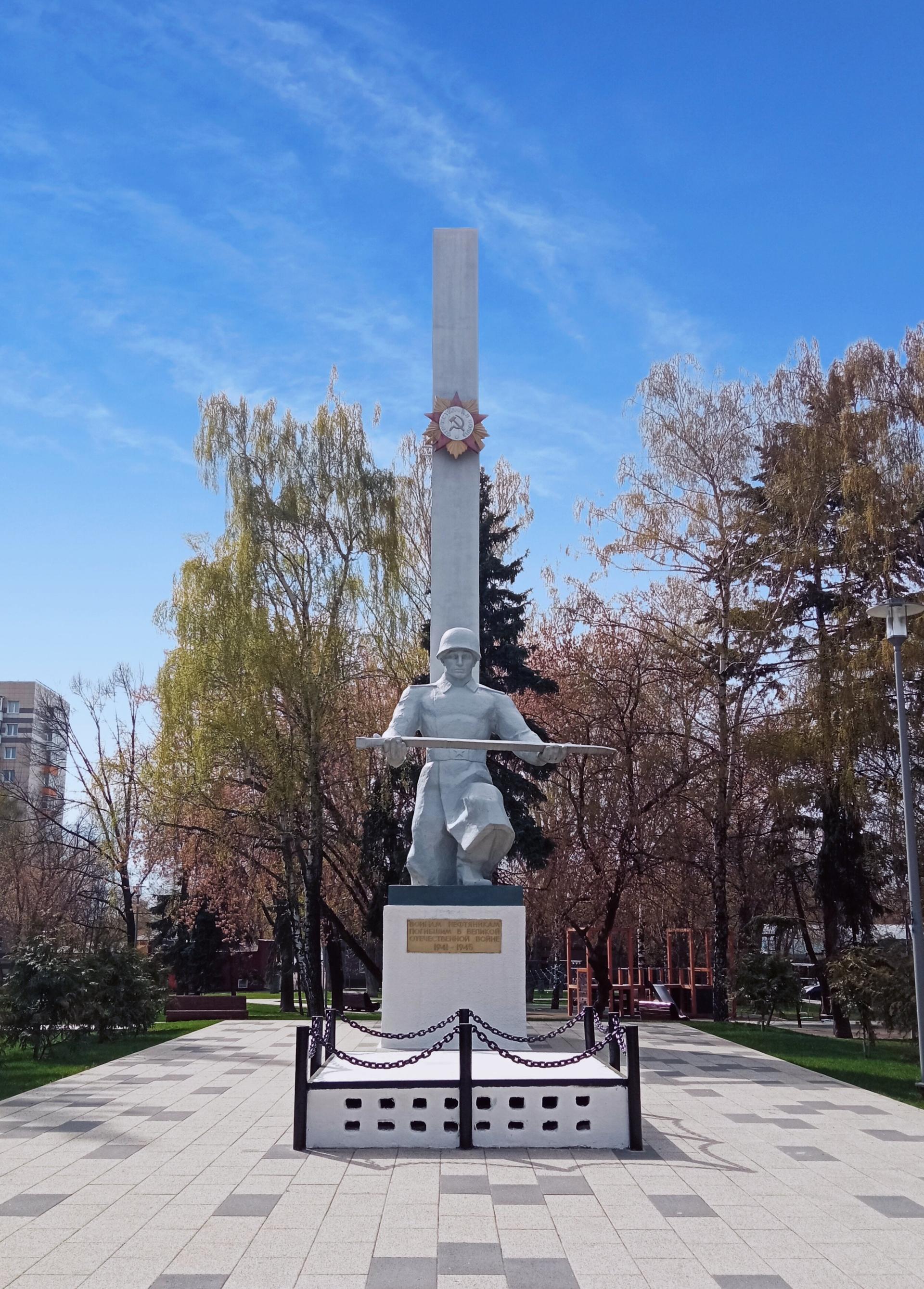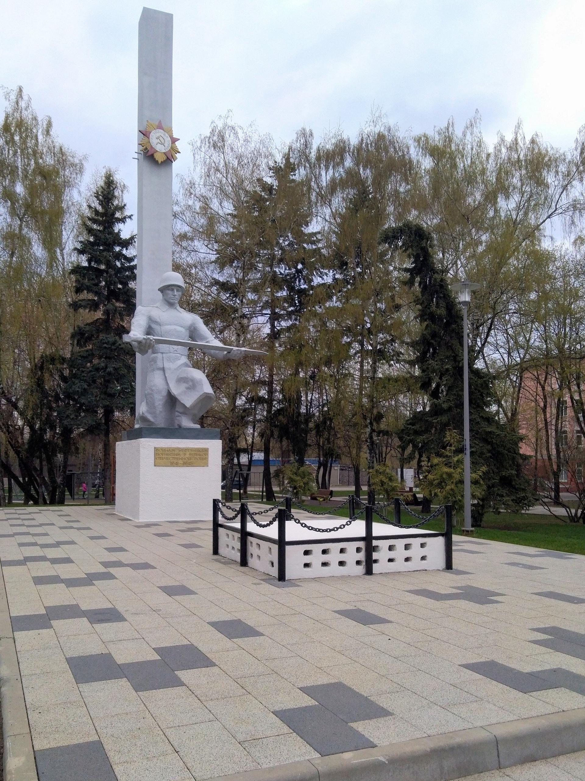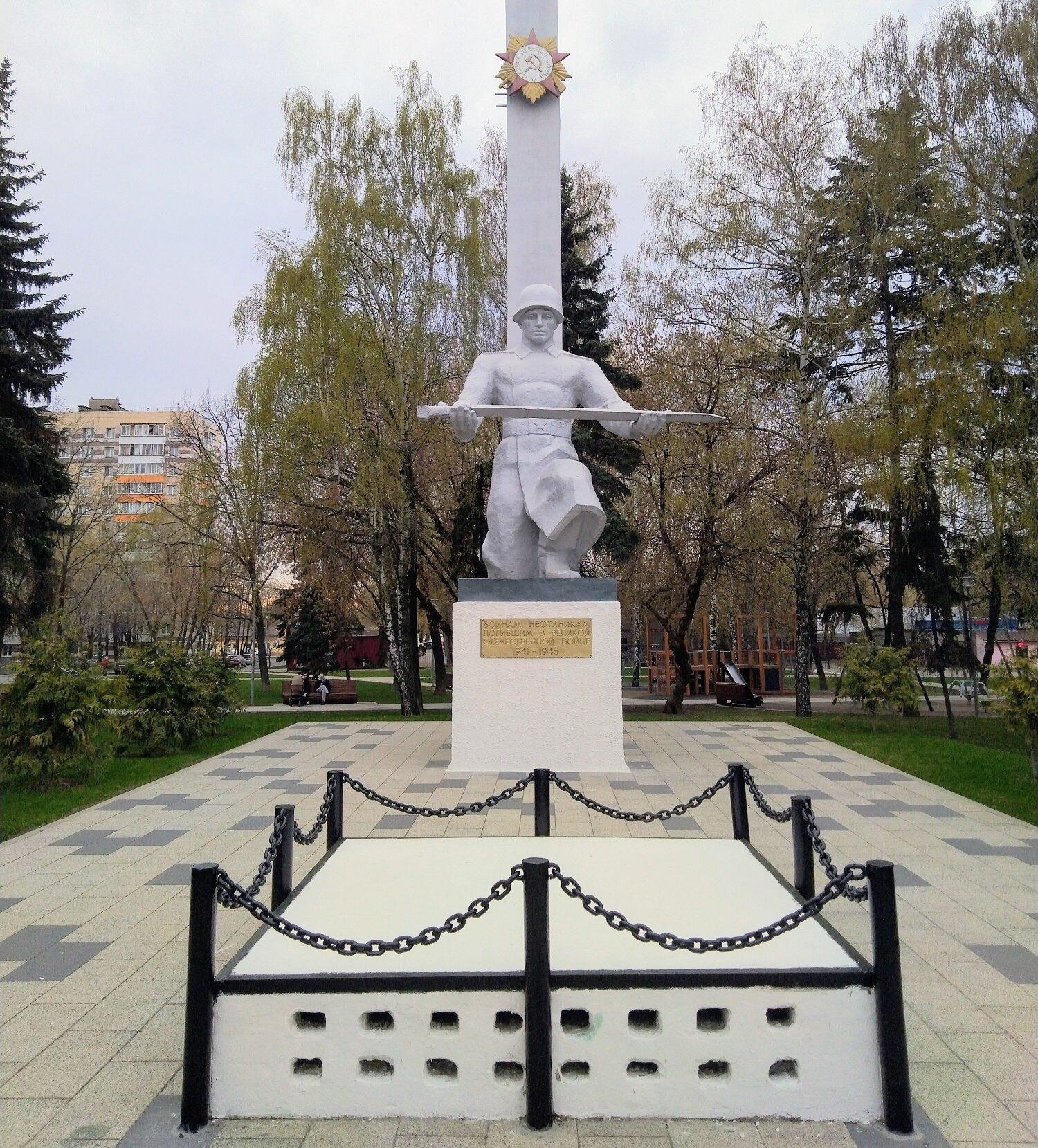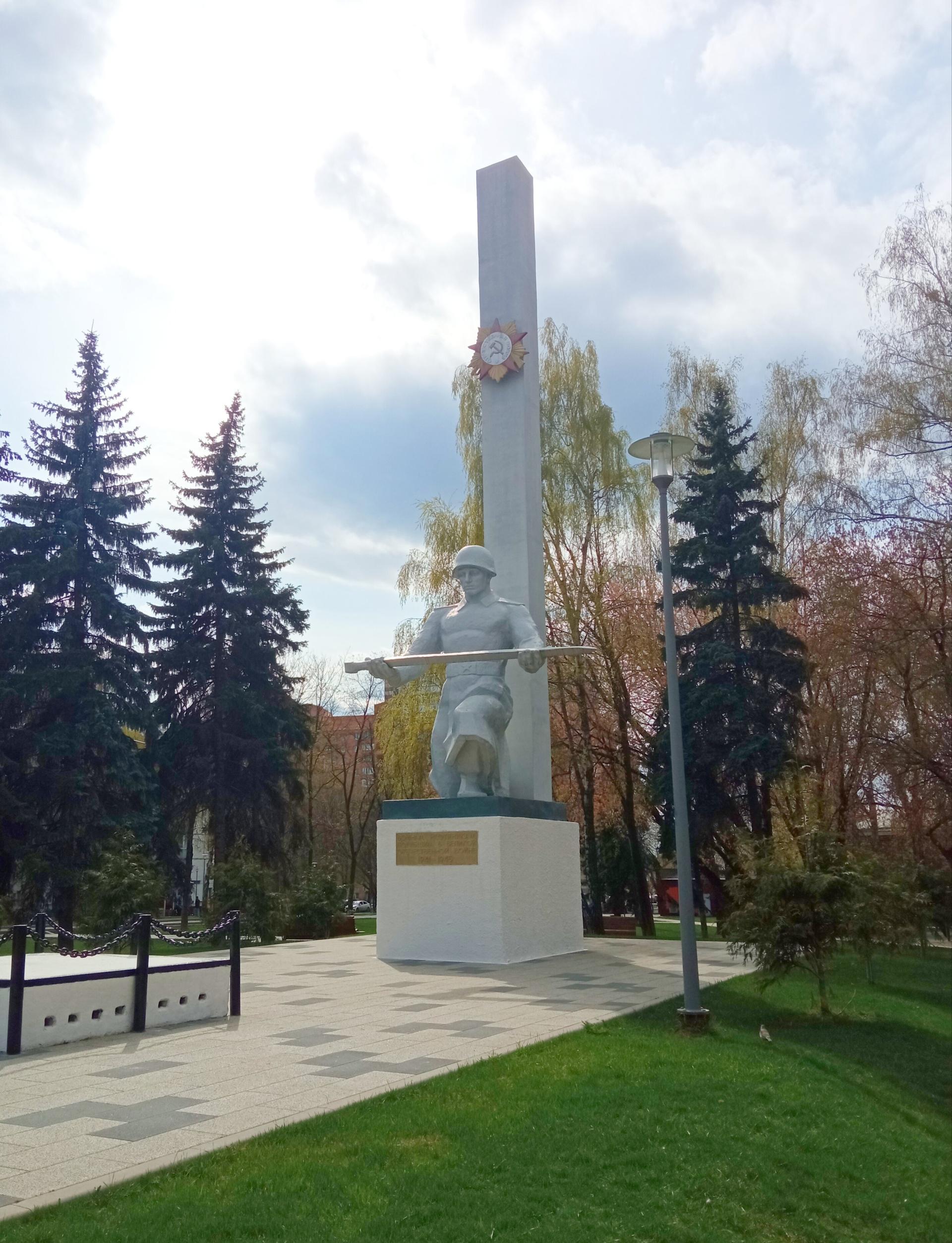 Памятник представляет собой фигуру воина Красной армии, который склонился на одно колено и держит в протянутых вперед руках меч. На стеле в верхней части укреплен металлический декоративный элемент в виде ордена Отечественной войны.