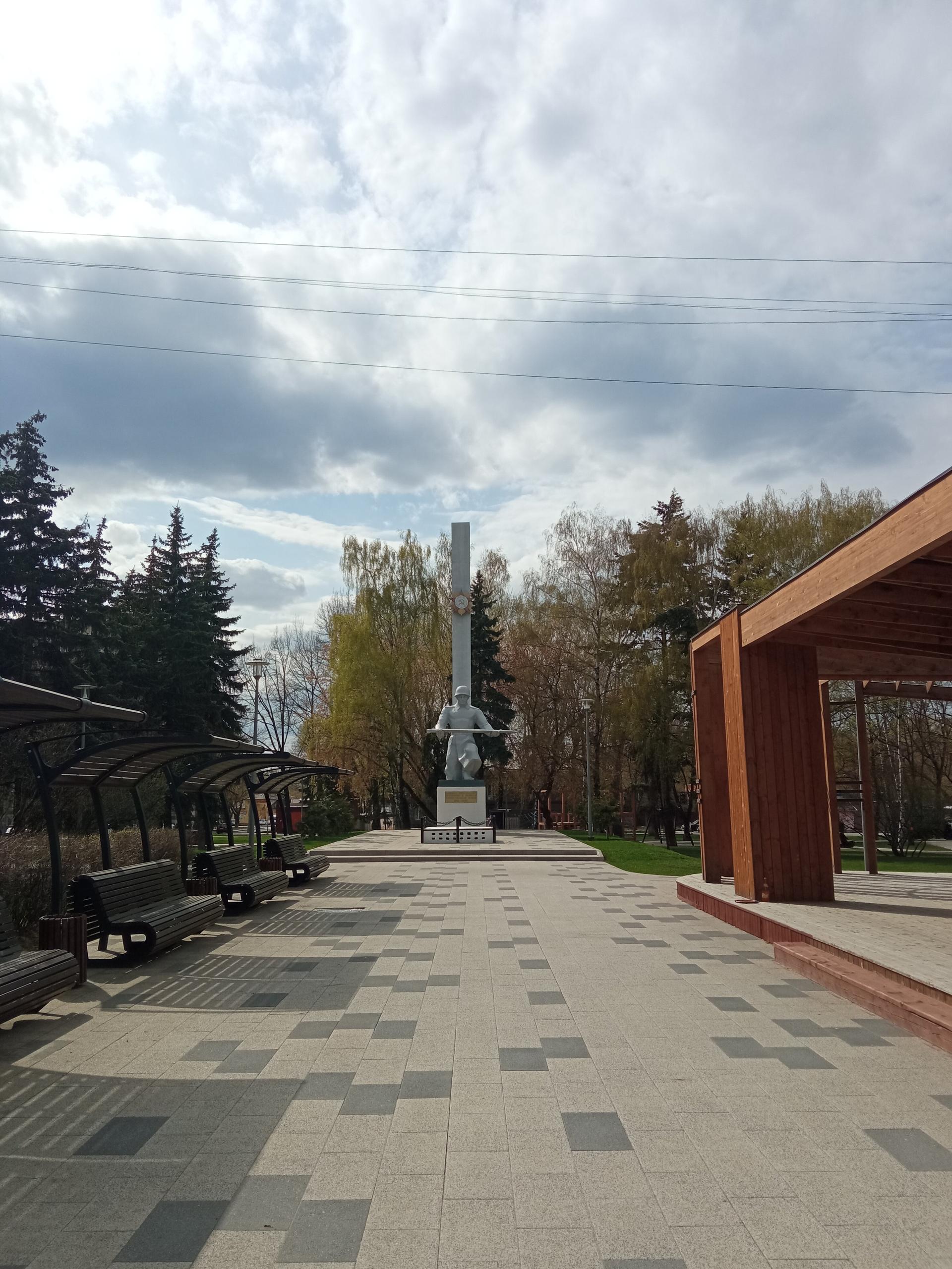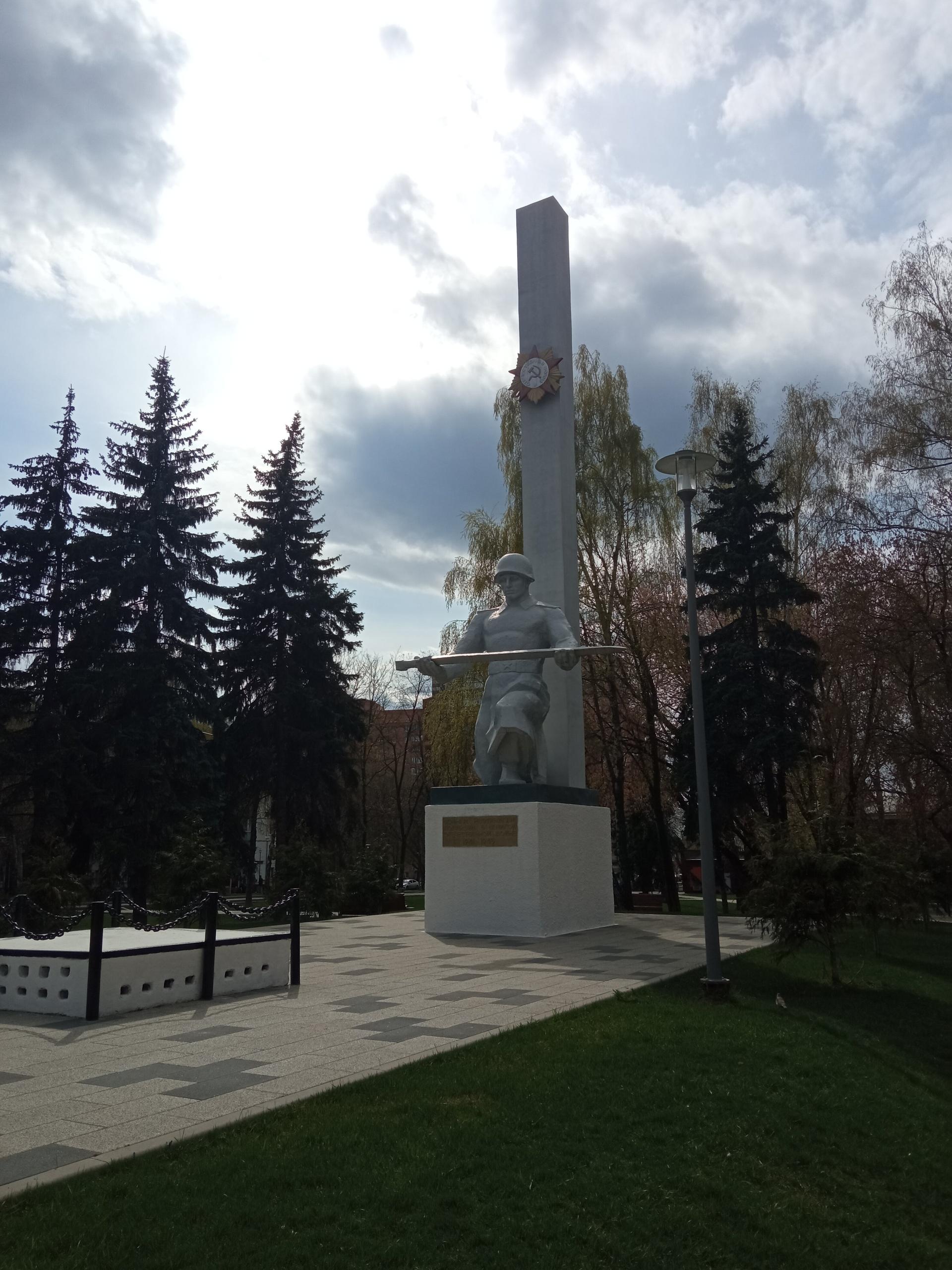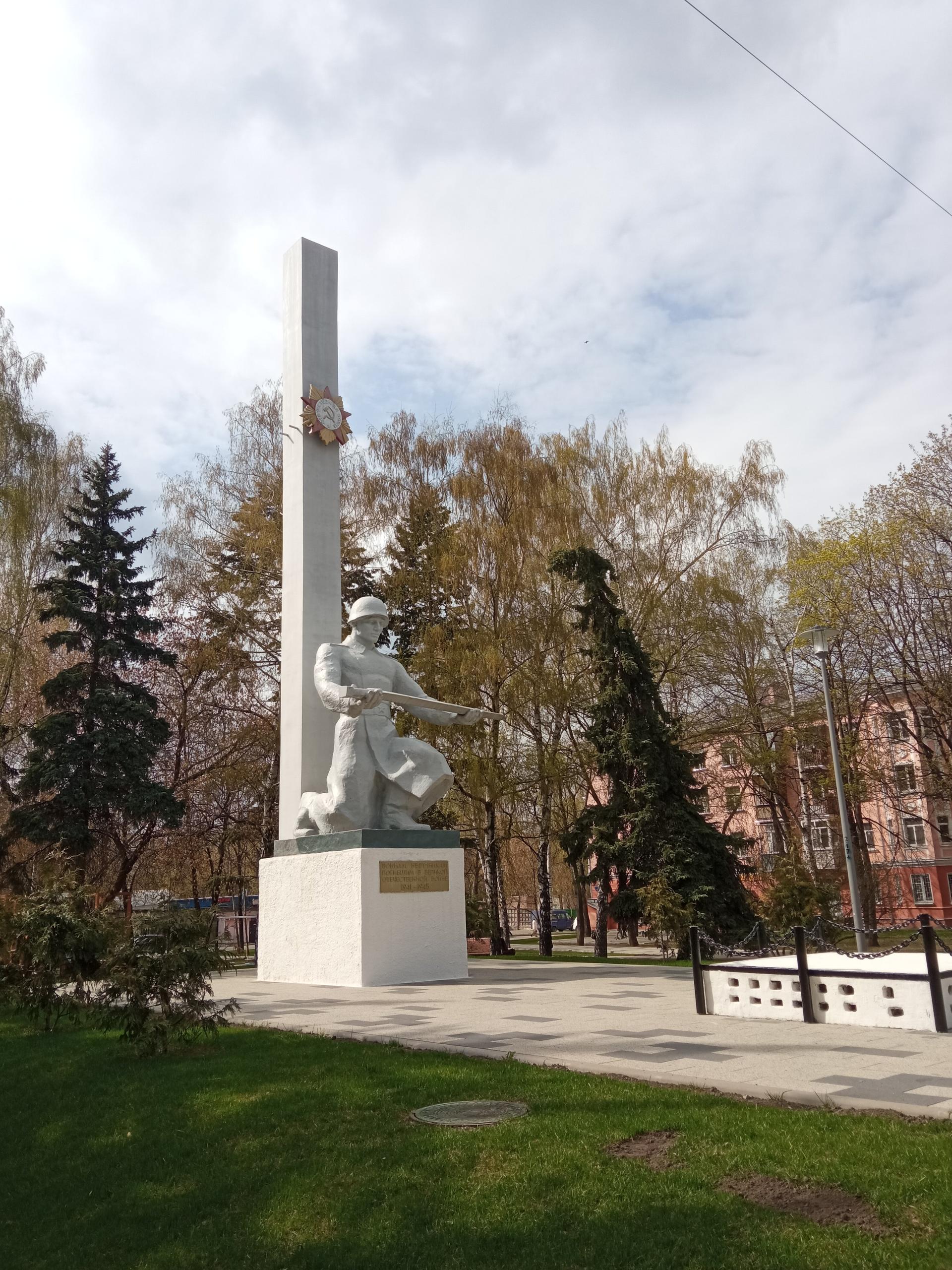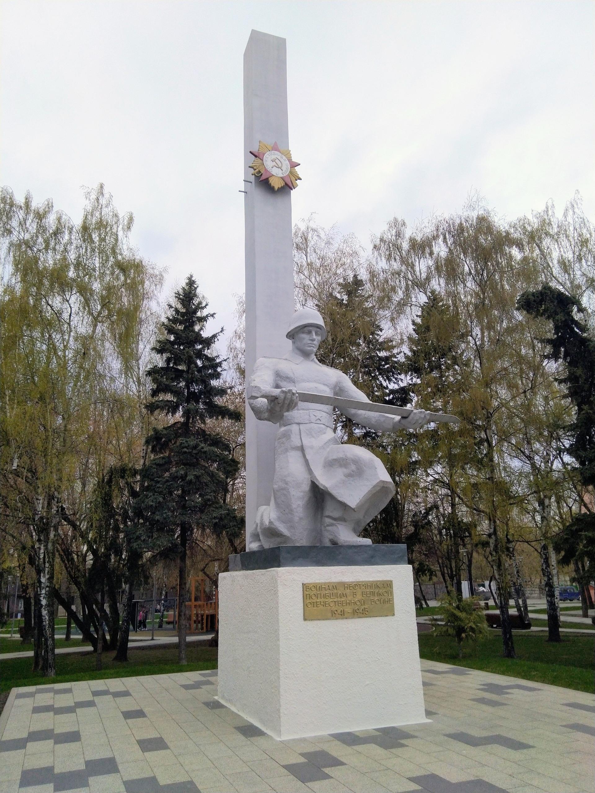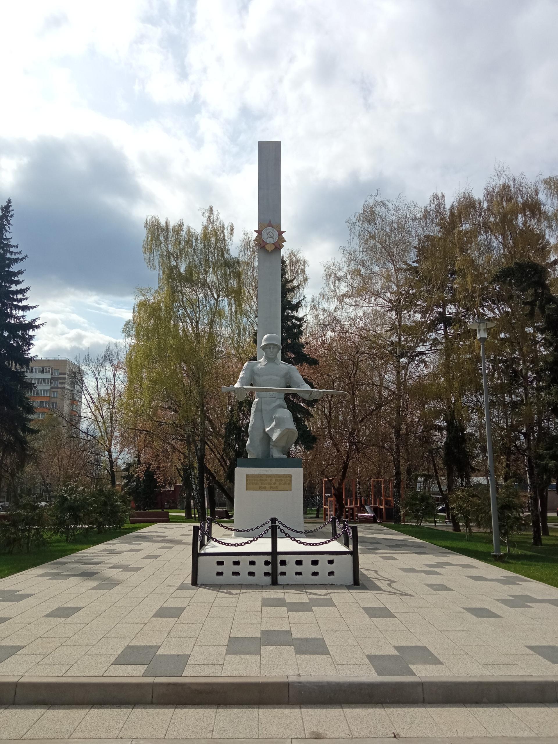 Памятник представляет собой фигуру воина Красной армии, который склонился на одно колено и держит в протянутых вперед руках меч. На стеле в верхней части укреплен металлический декоративный элемент в виде ордена Отечественной войны.