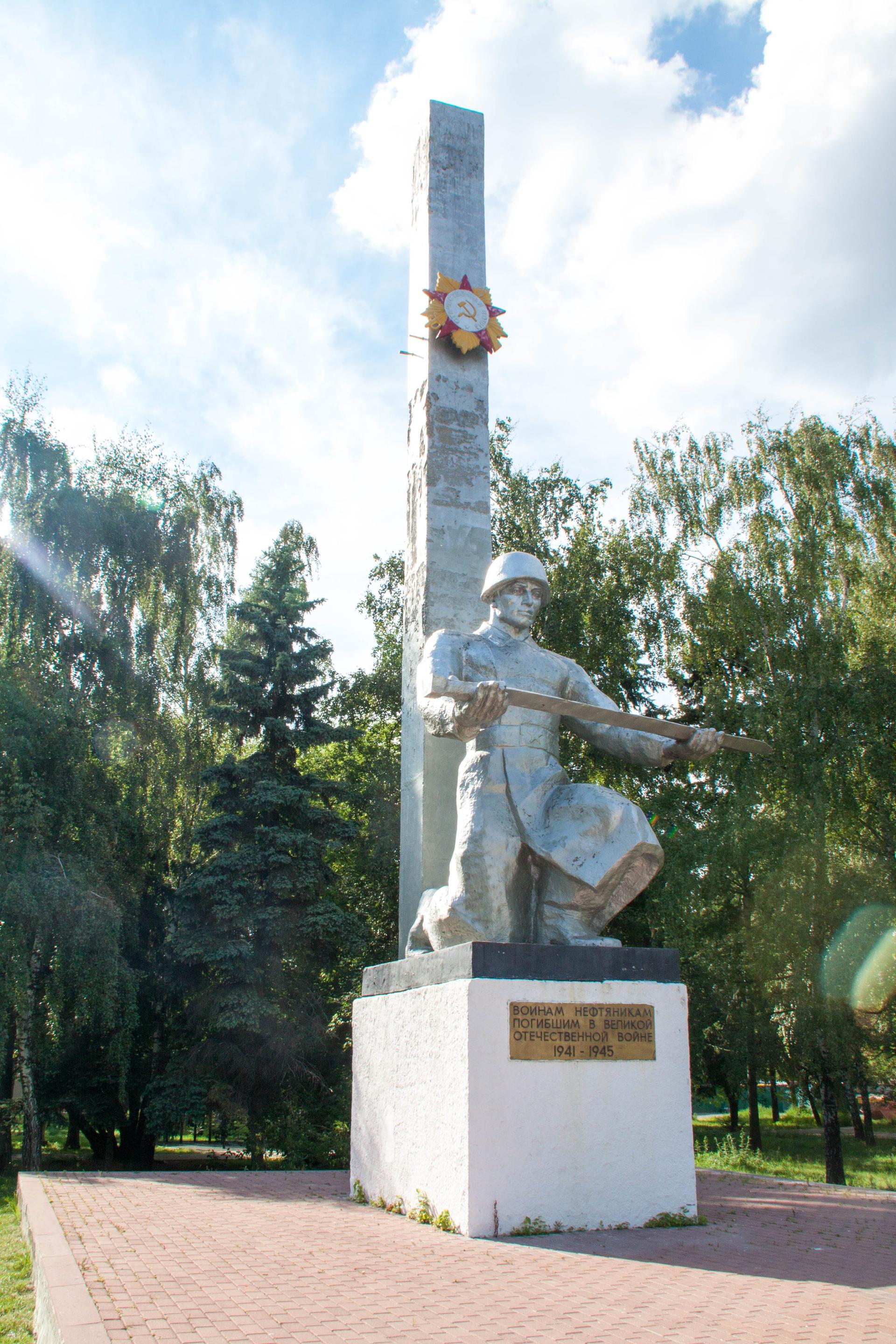 На фронтальной стороне постамента расположена металлическая мемориальная табличка, на которой накладными буквами исполнена надпись: «Воинам-нефтяникам, погибшим в Великой Отечественной войне 1941-1945».