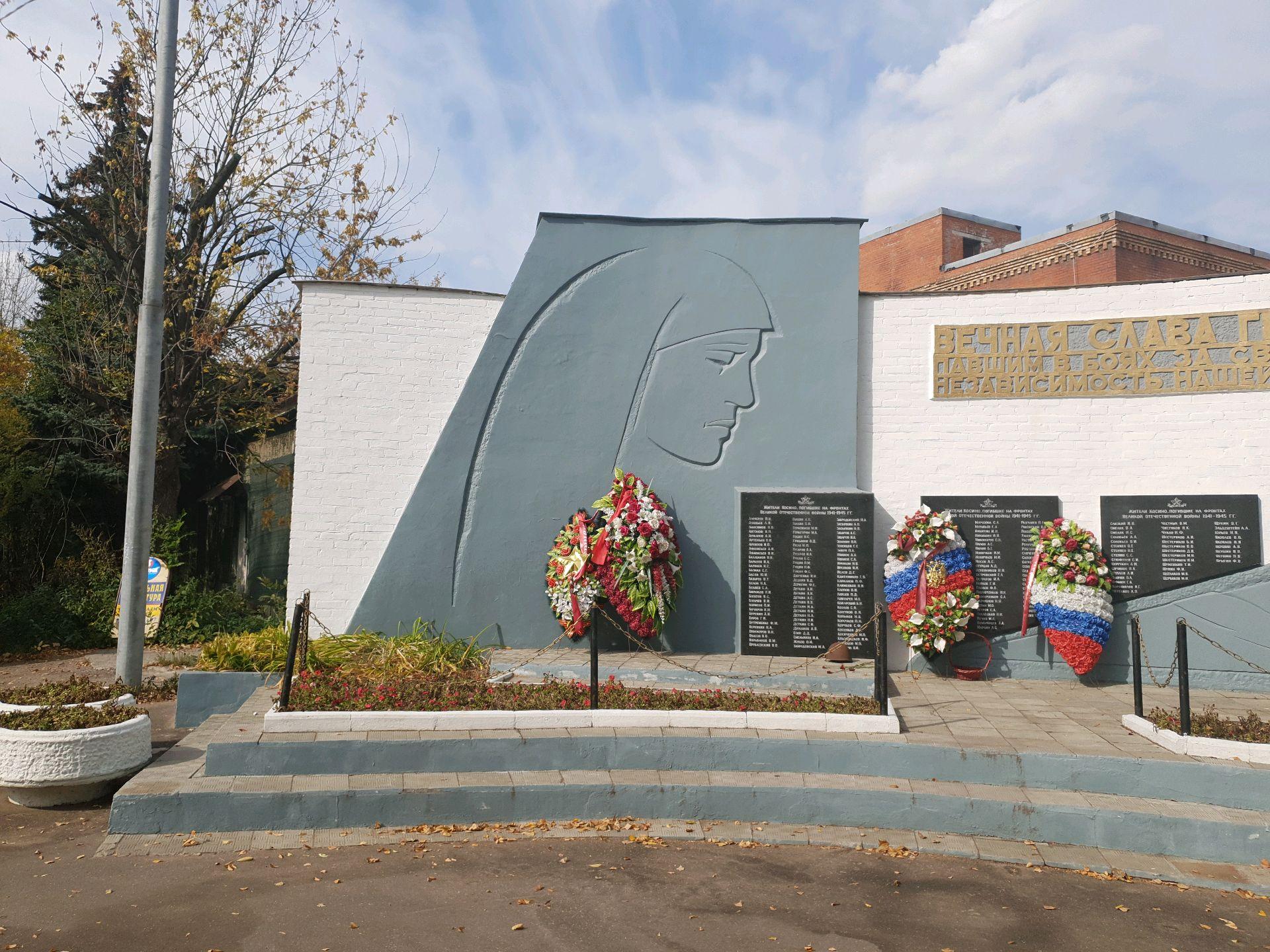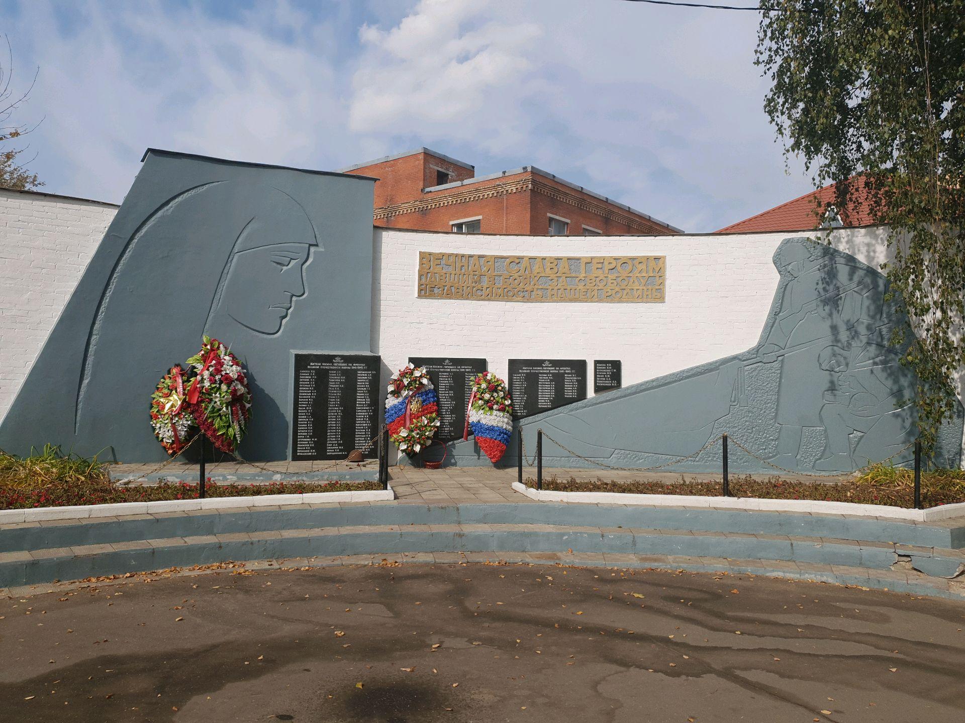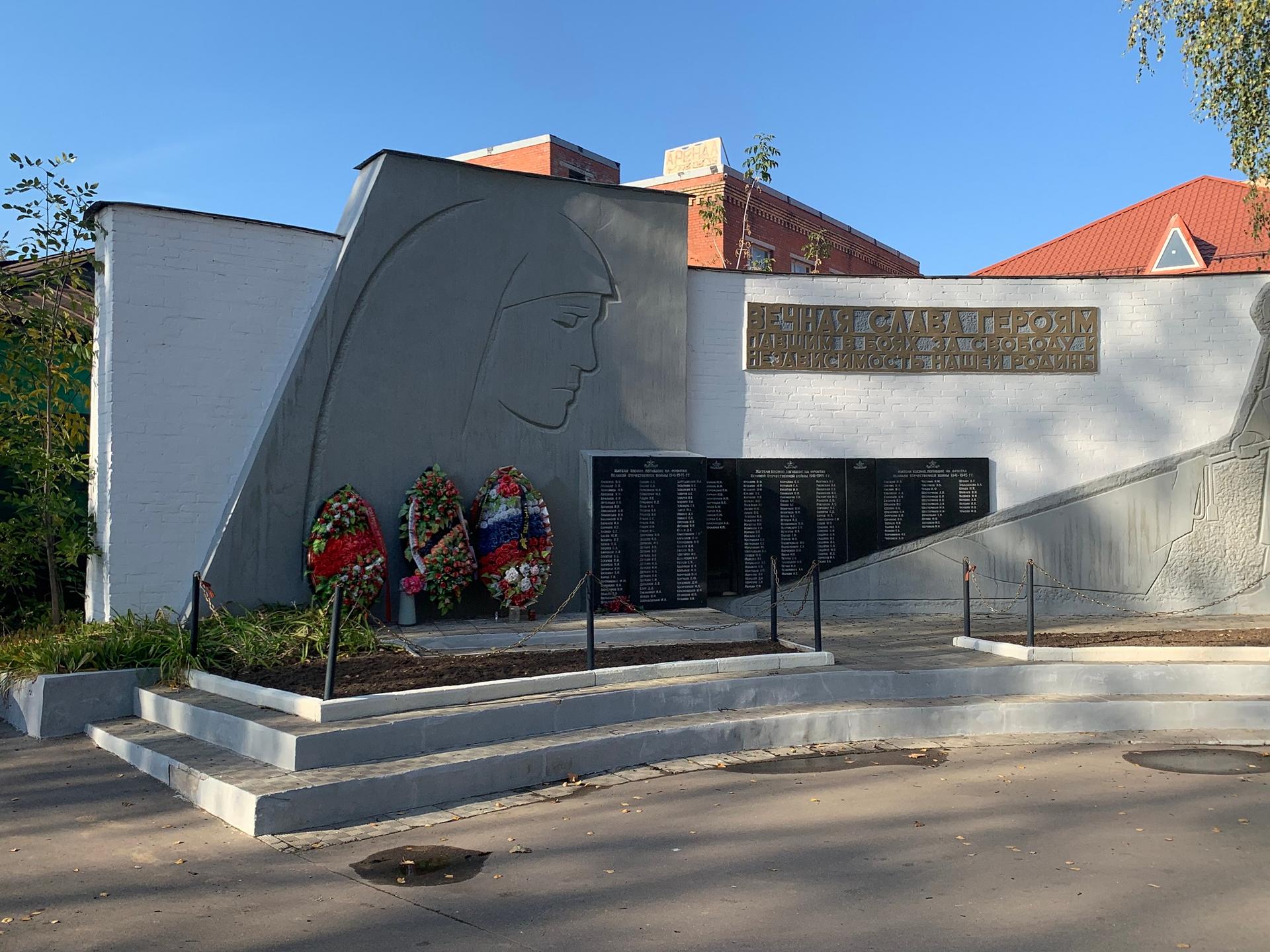 Монумент представляет собой кирпичную дугообразную стену, окрашенную белый цвет. Слева располагается бетонное панно серого цвета с врезным рельефом профильного изображения головы скорбящей женщины в платке. На противоположной стороне монумента бетонное панно с изображением солдата, опустившего к земле знамя. Рядом солдат, преклонивший колено. В нижней части стелы прикреплены три мемориальные доски с именами погибших.
