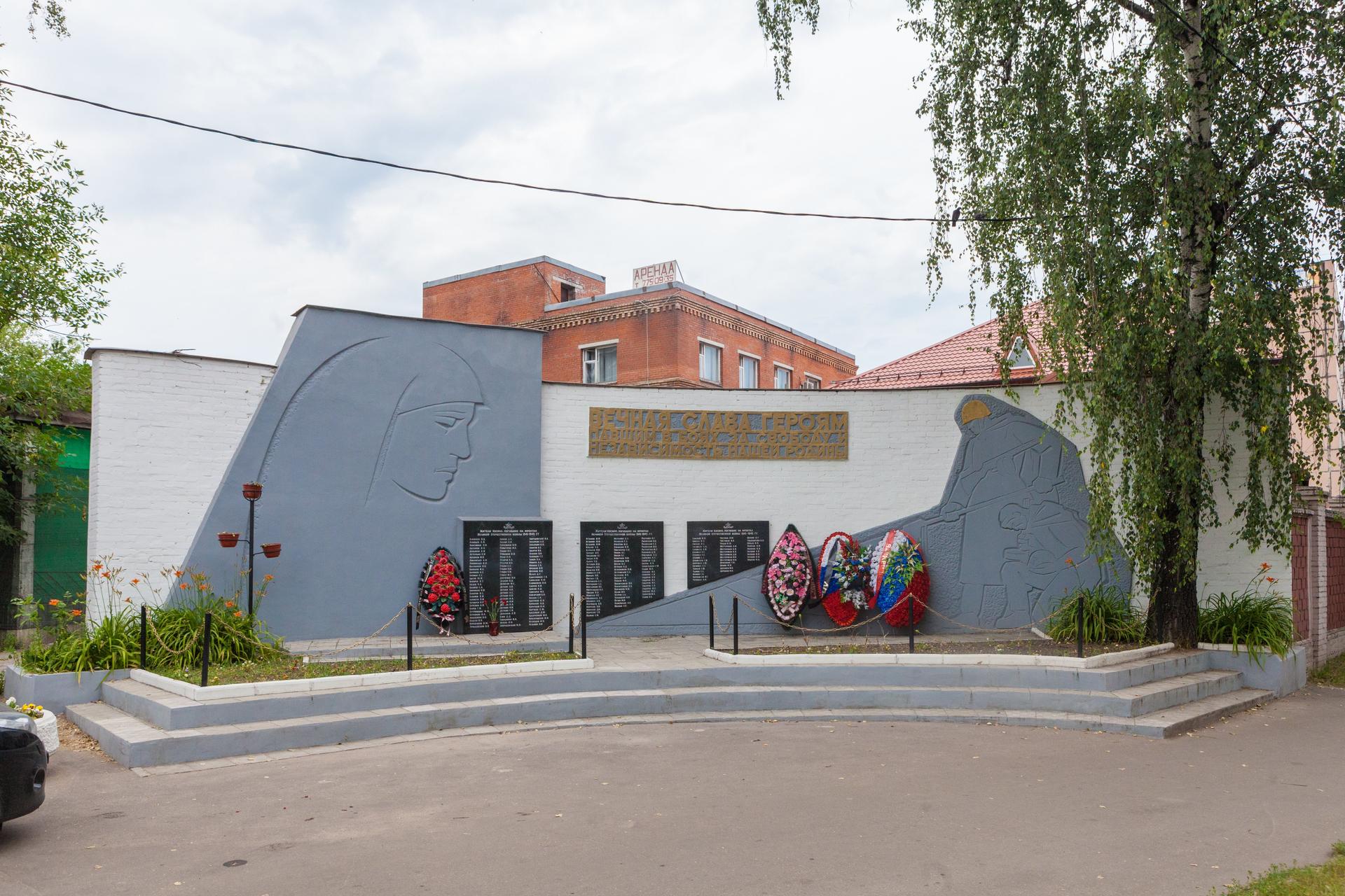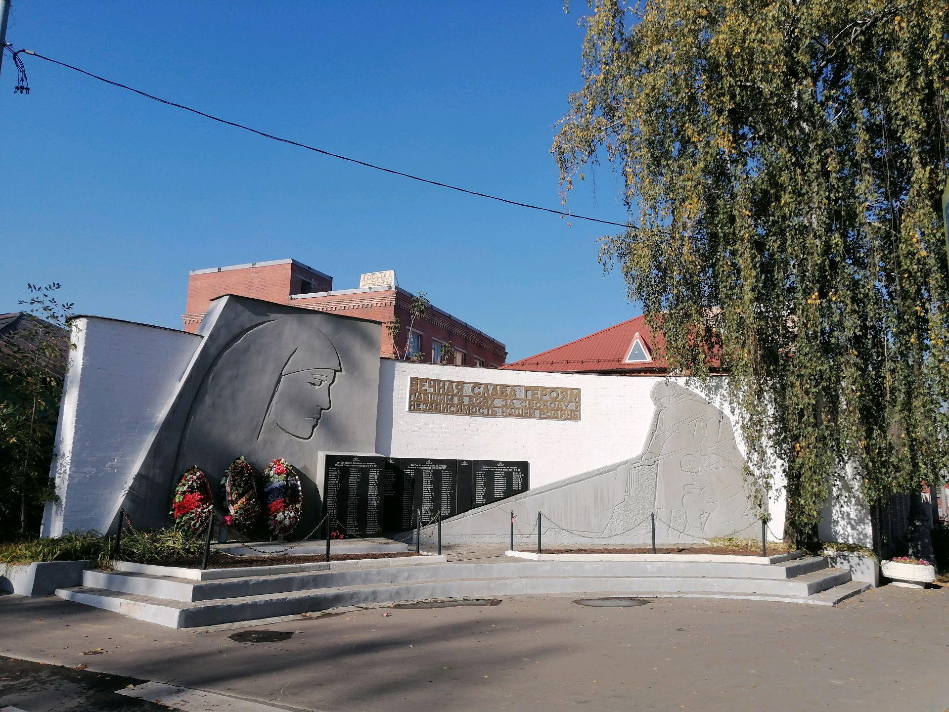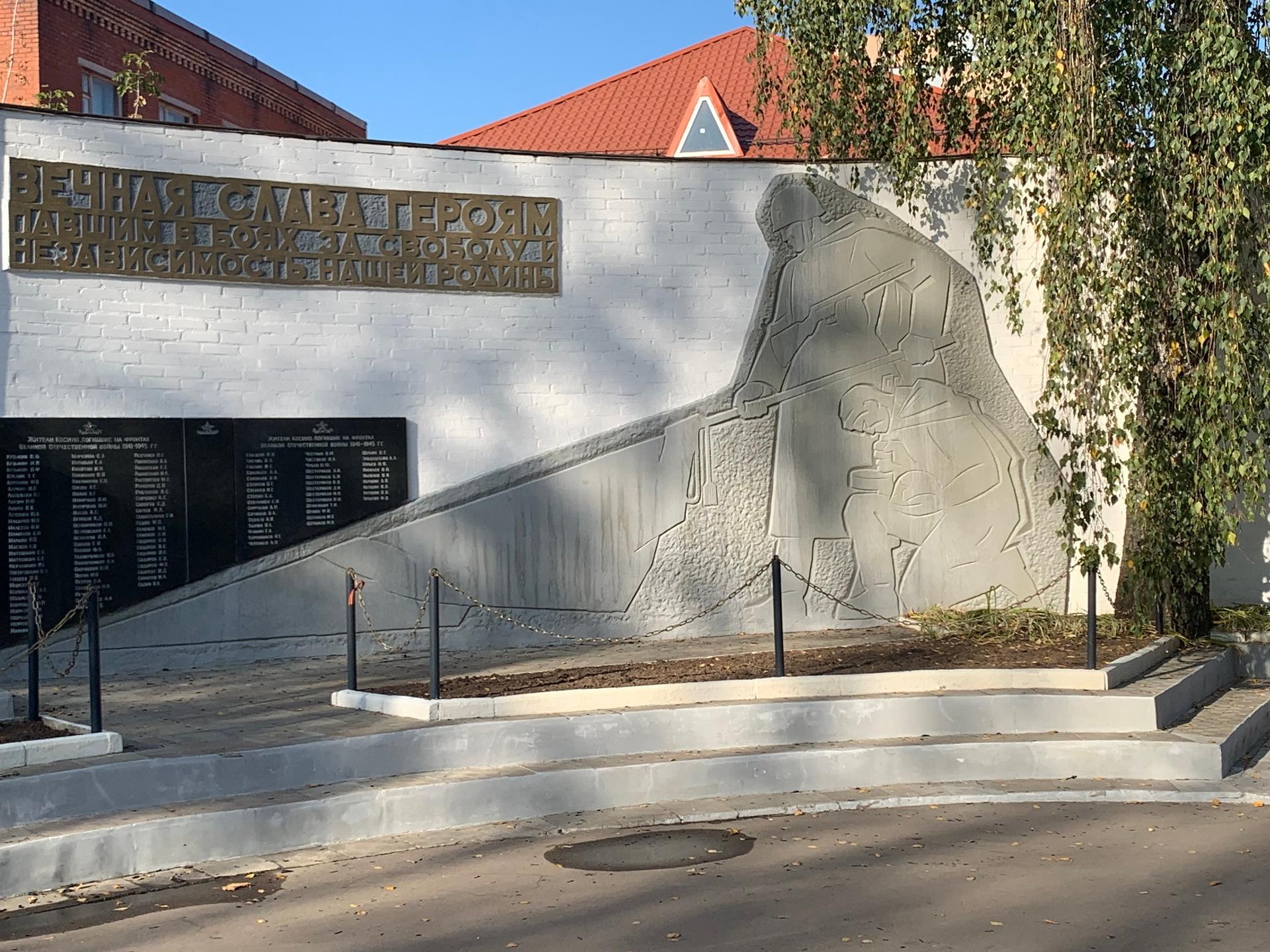 Монумент представляет собой кирпичную дугообразную стену, окрашенную белый цвет. Слева располагается бетонное панно серого цвета с врезным рельефом профильного изображения головы скорбящей женщины в платке. На противоположной стороне монумента бетонное панно с изображением солдата, опустившего к земле знамя. Рядом солдат, преклонивший колено. В нижней части стелы прикреплены три мемориальные доски с именами погибших.