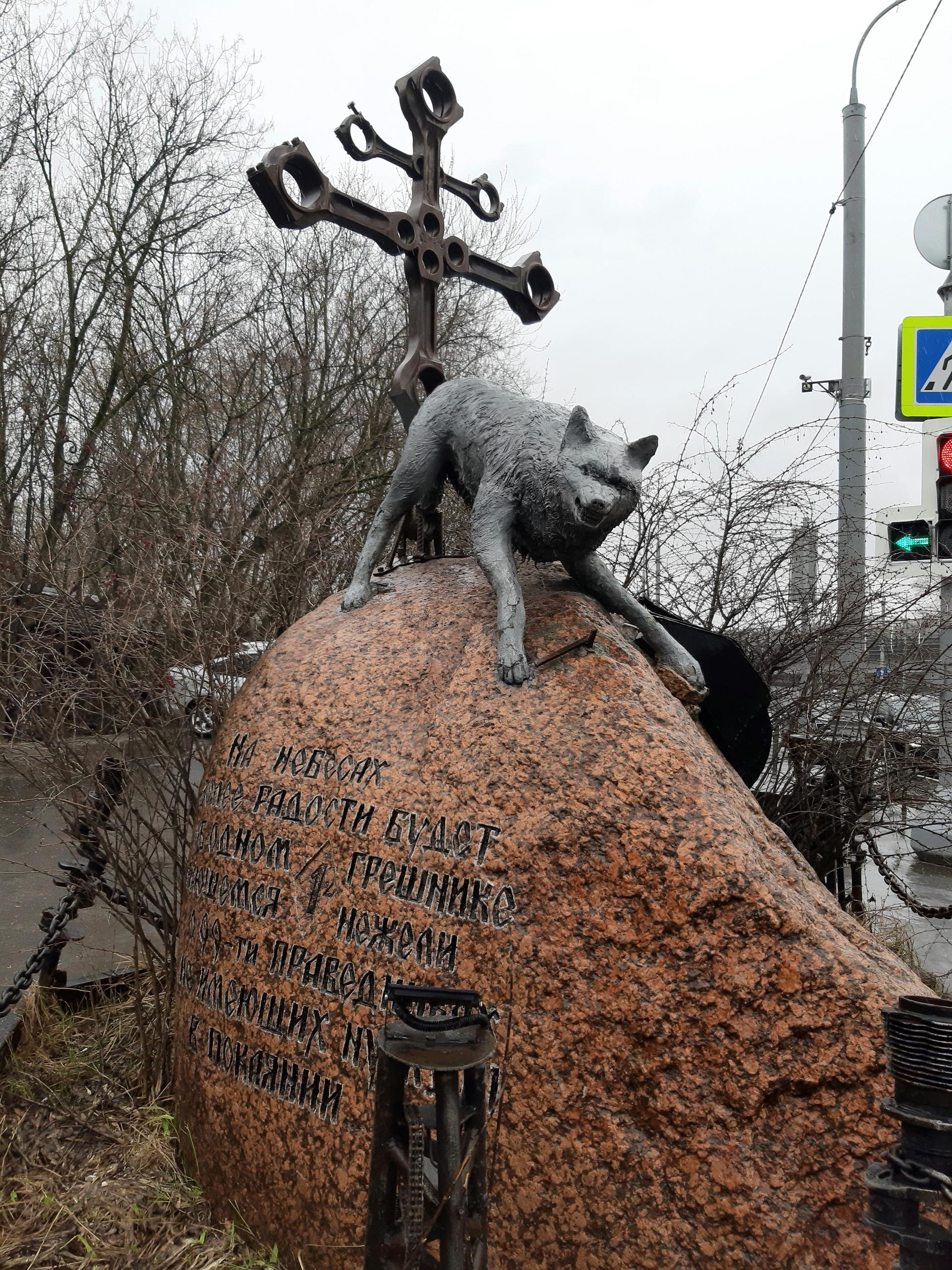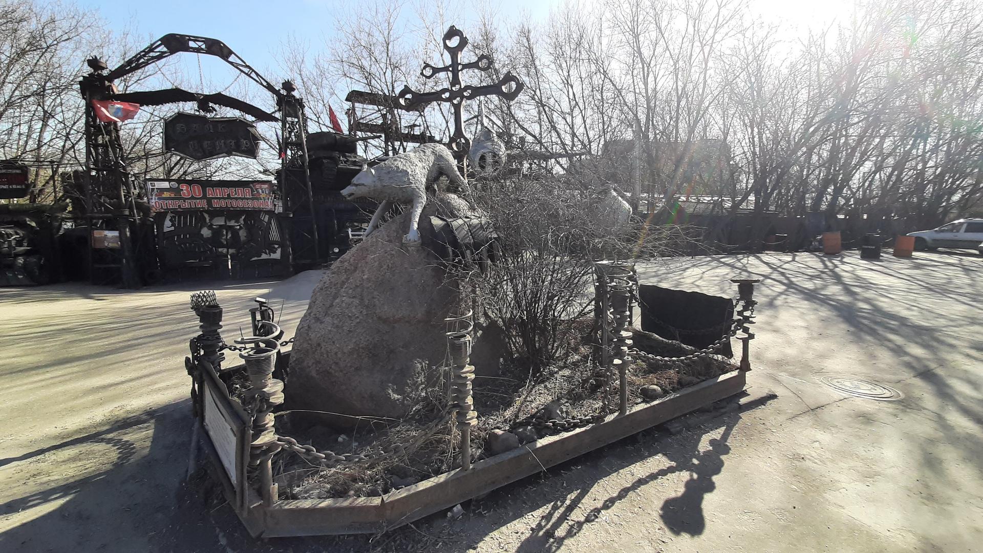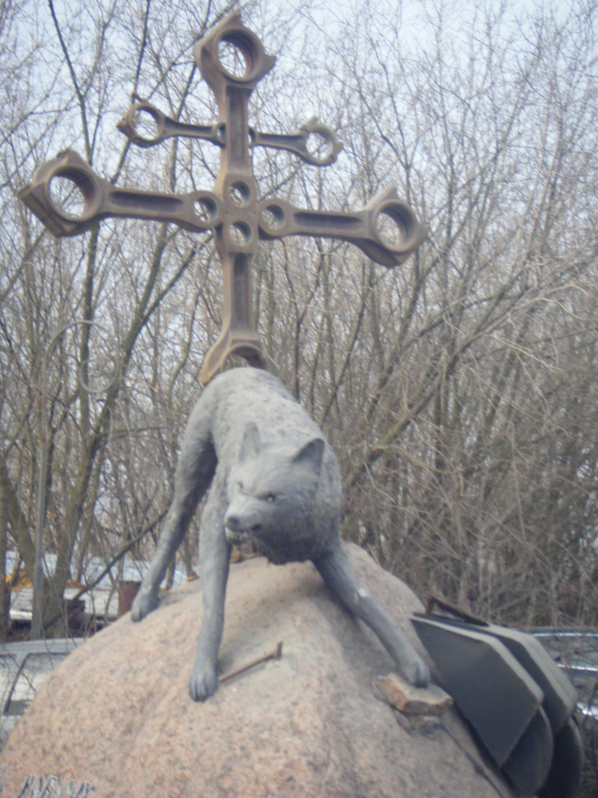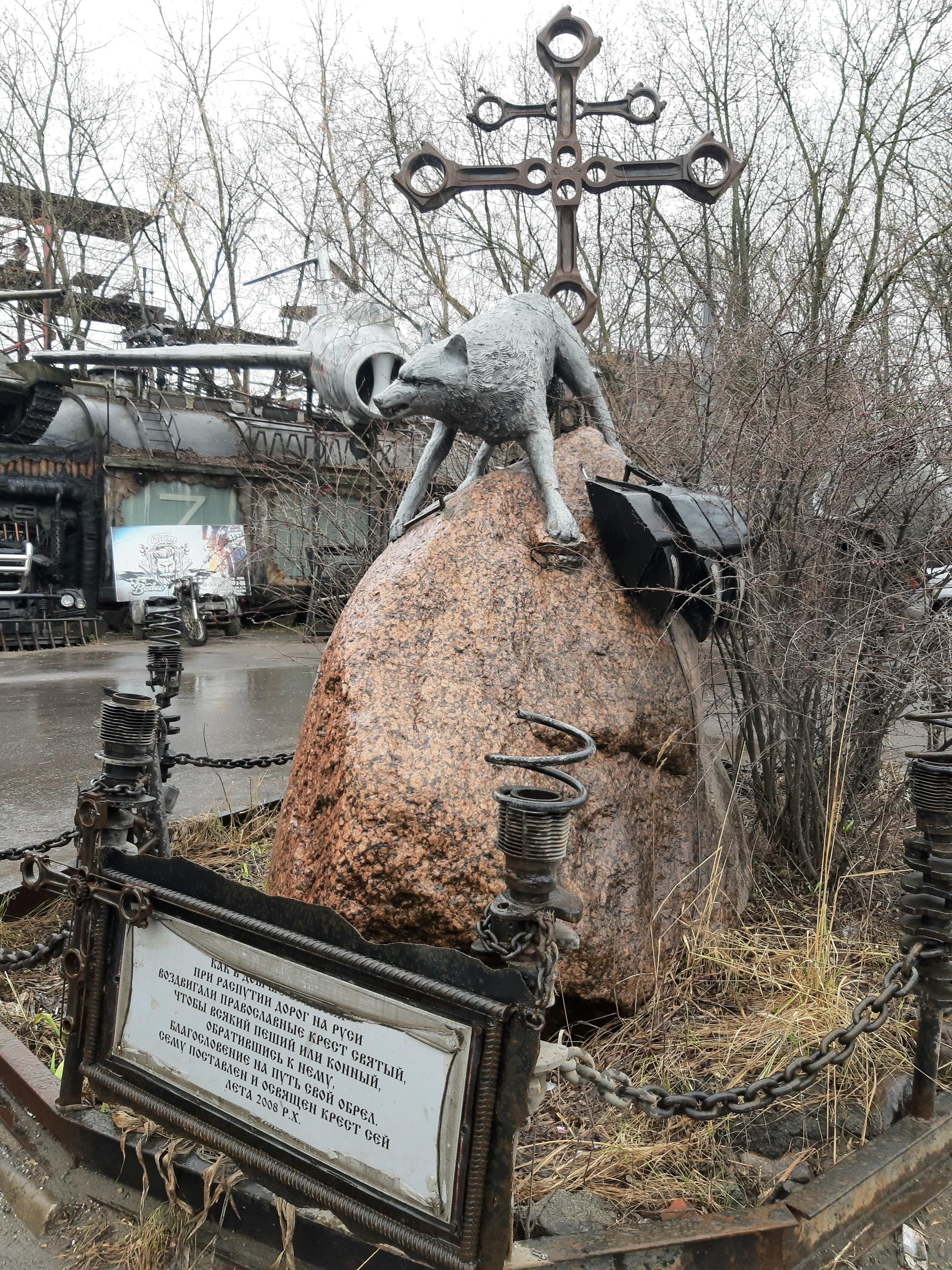 Проезжая по улице Нижние Мневники, мы вдруг увидели необычную скульптуру: металлический волк перед крестом. Как выяснилось, эта скульптурная группа находится перед въездом в байк-центр и клуб "Секстон". Байк-центр был открыт в 1999 году старейшим отечественным мотоклубом "Ночные волки", появившимся в СССР еще 80-х годах и культивирующим собственные отечественные мотоциклетные традиции.