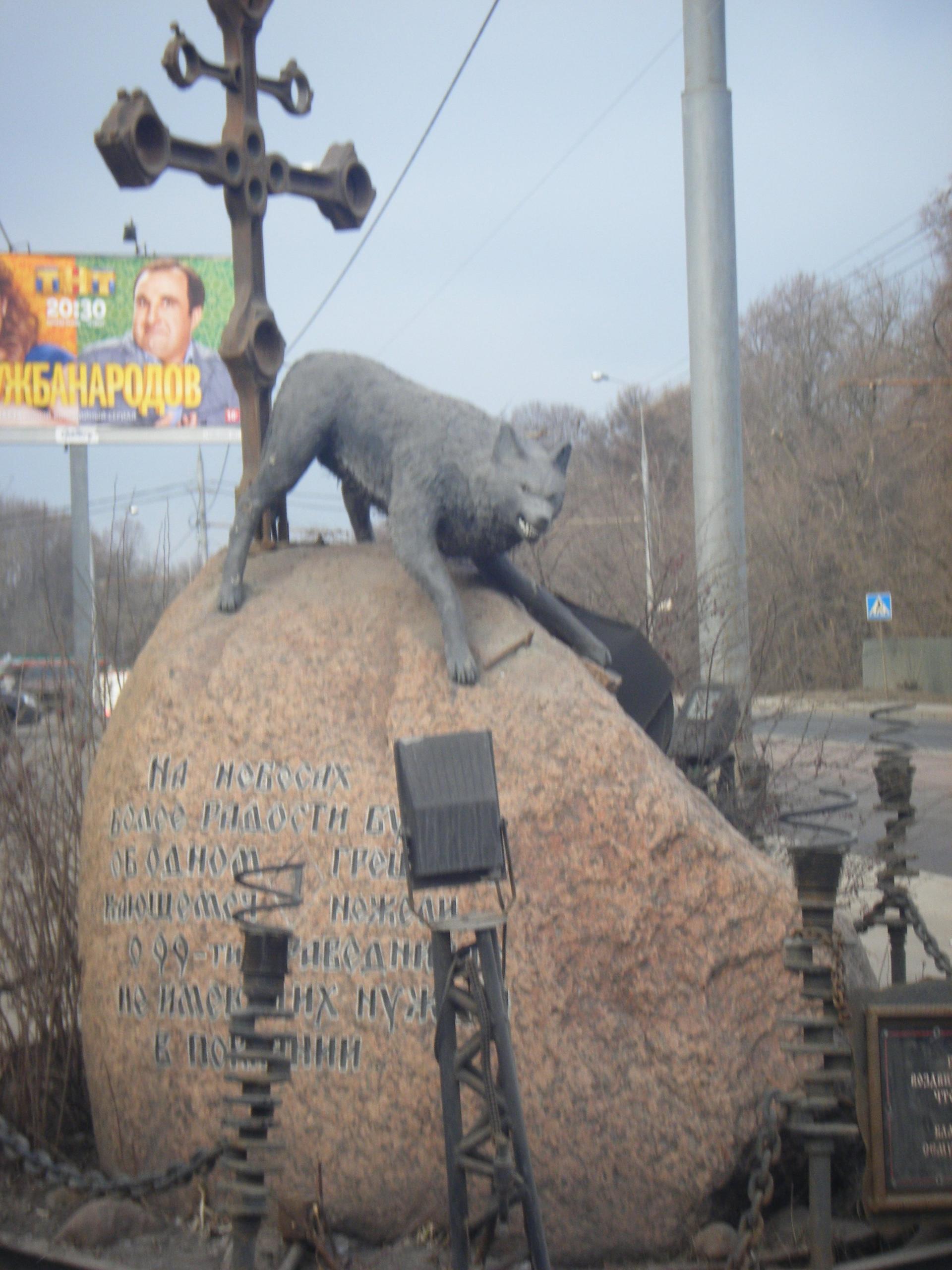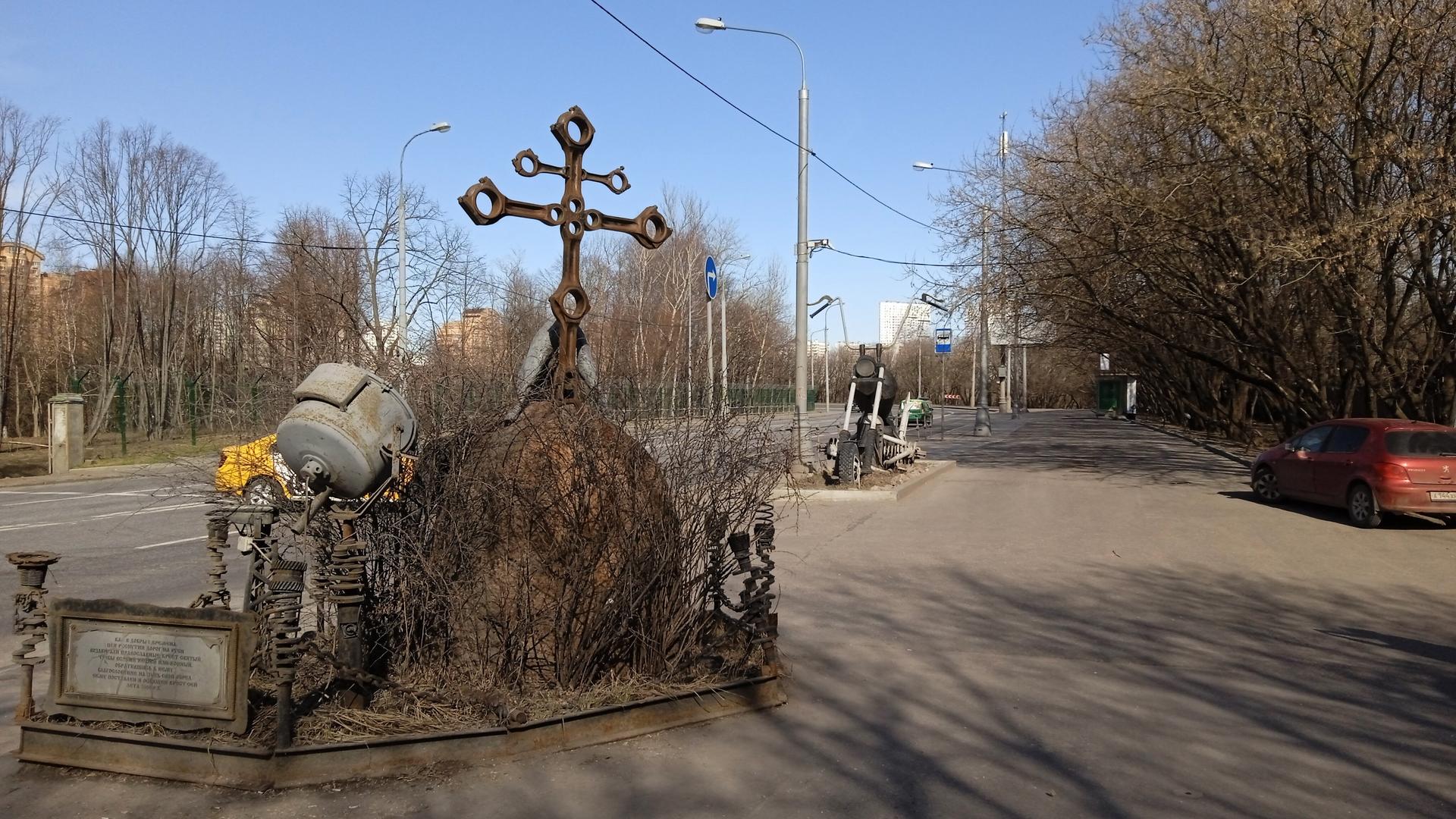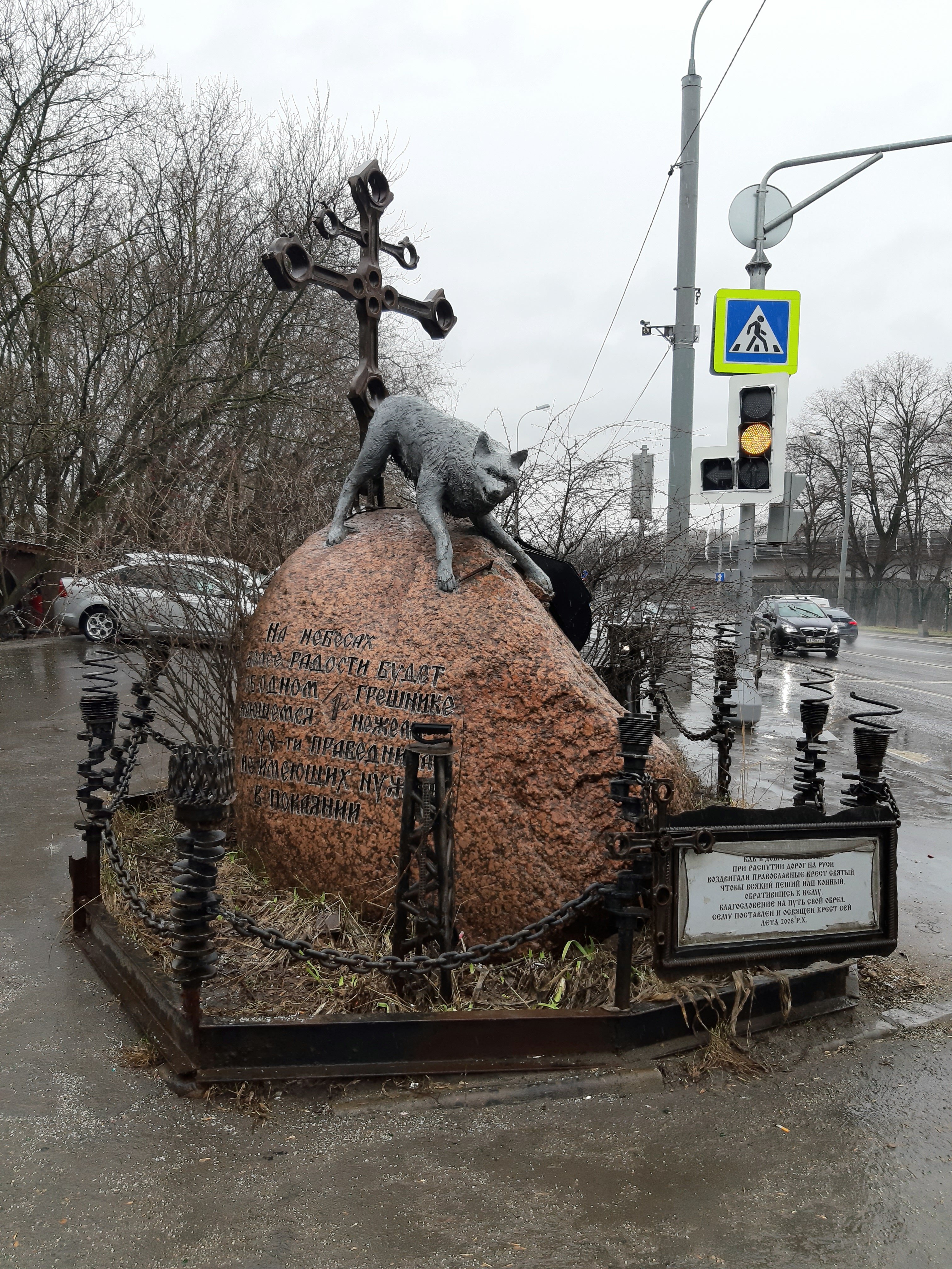 Проезжая по улице Нижние Мневники, мы вдруг увидели необычную скульптуру: металлический волк перед крестом. Как выяснилось, эта скульптурная группа находится перед въездом в байк-центр и клуб "Секстон". Байк-центр был открыт в 1999 году старейшим отечественным мотоклубом "Ночные волки", появившимся в СССР еще 80-х годах и культивирующим собственные отечественные мотоциклетные традиции.