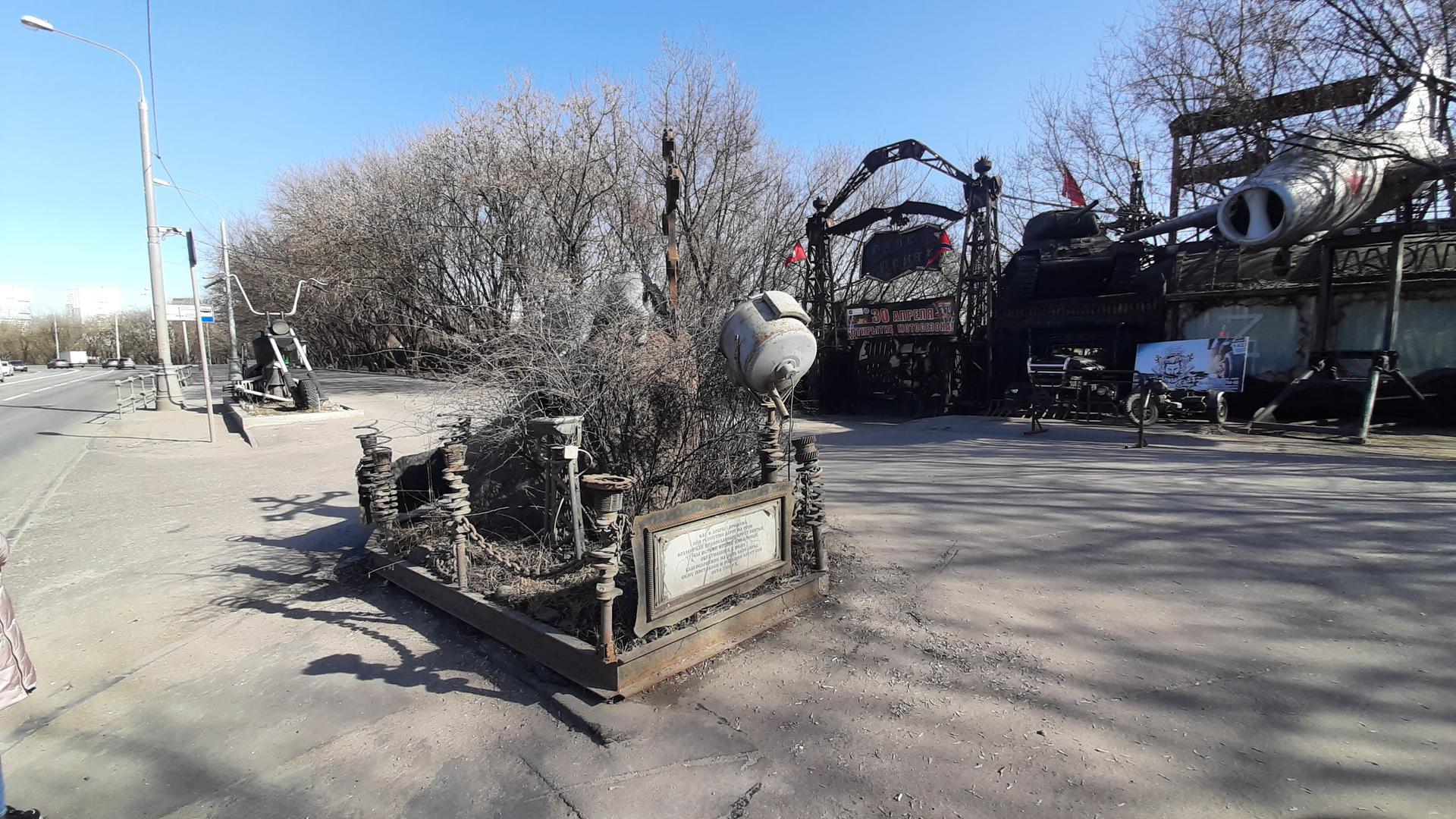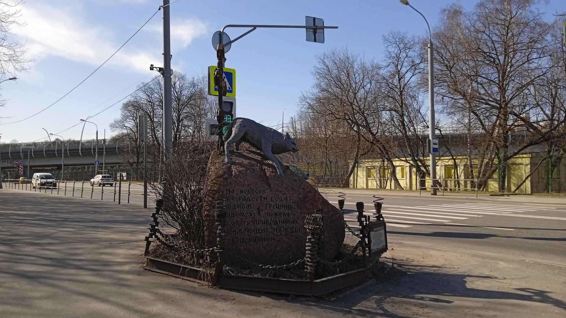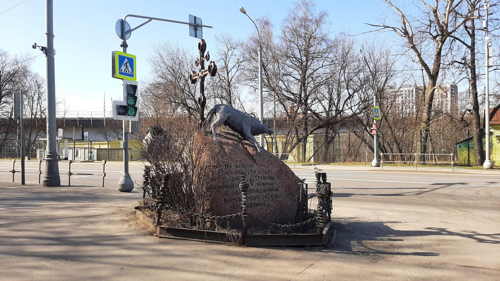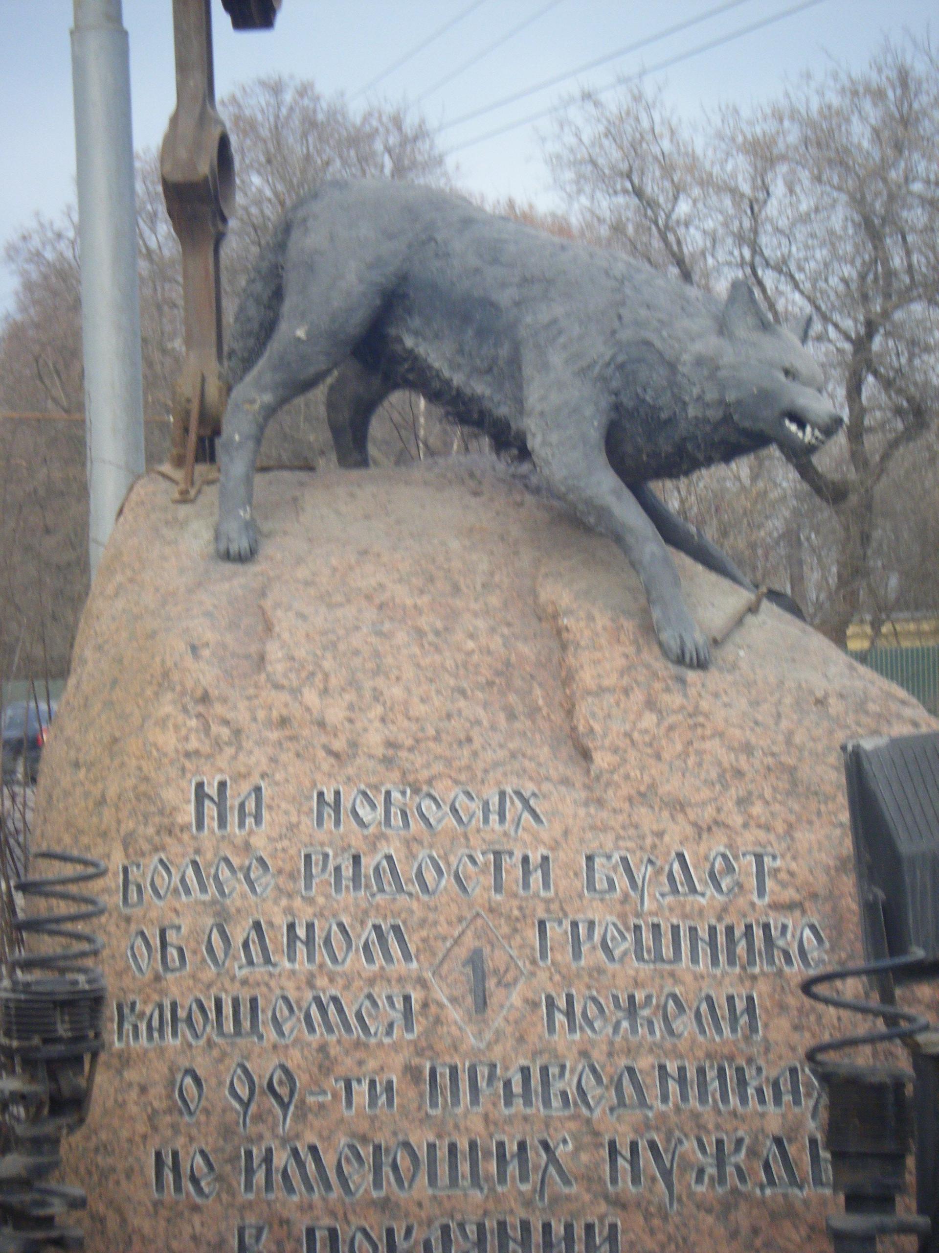 Проезжая по улице Нижние Мневники, мы вдруг увидели необычную скульптуру: металлический волк перед крестом. Как выяснилось, эта скульптурная группа находится перед въездом в байк-центр и клуб "Секстон". Байк-центр был открыт в 1999 году старейшим отечественным мотоклубом "Ночные волки", появившимся в СССР еще 80-х годах и культивирующим собственные отечественные мотоциклетные традиции.