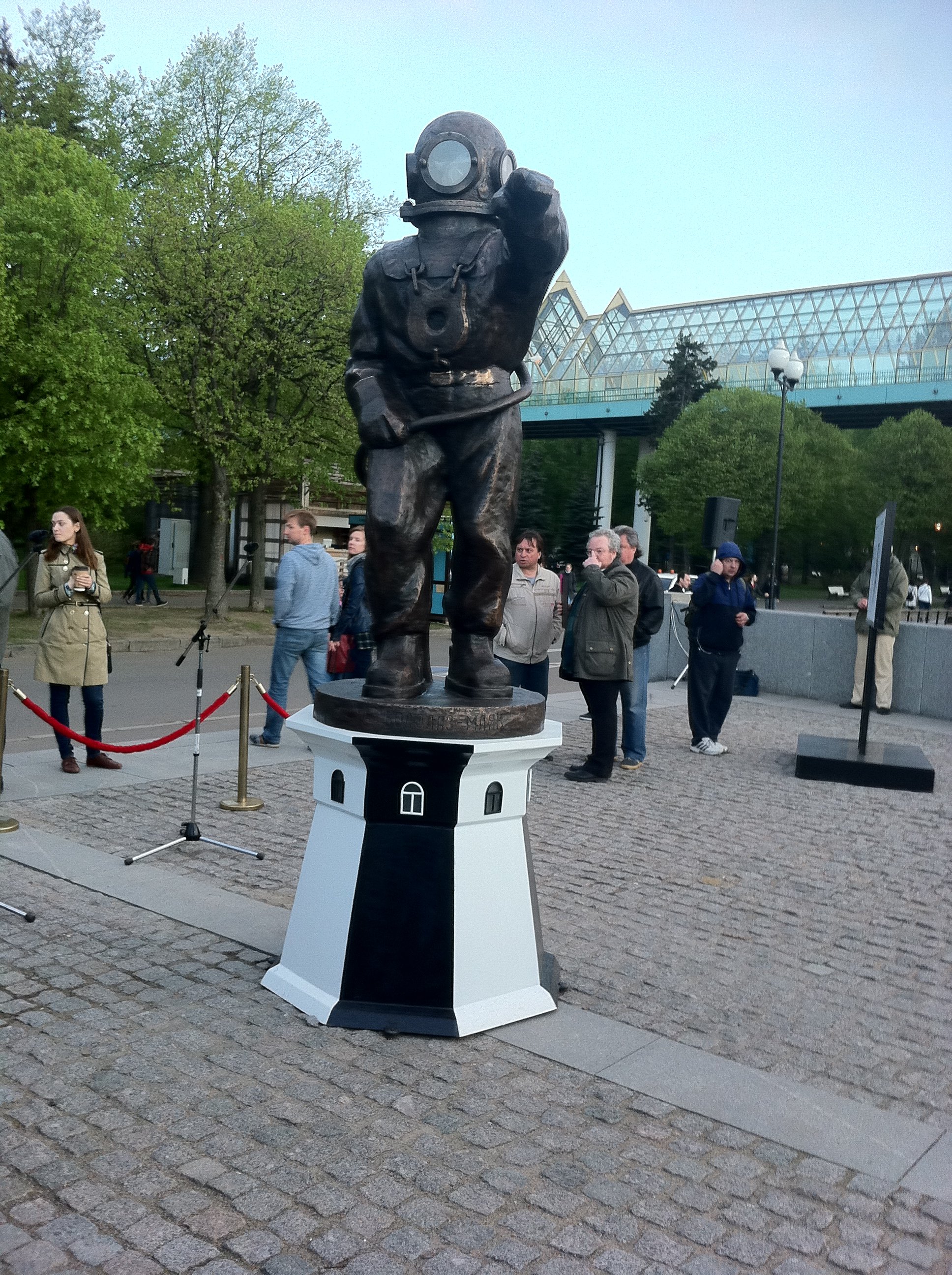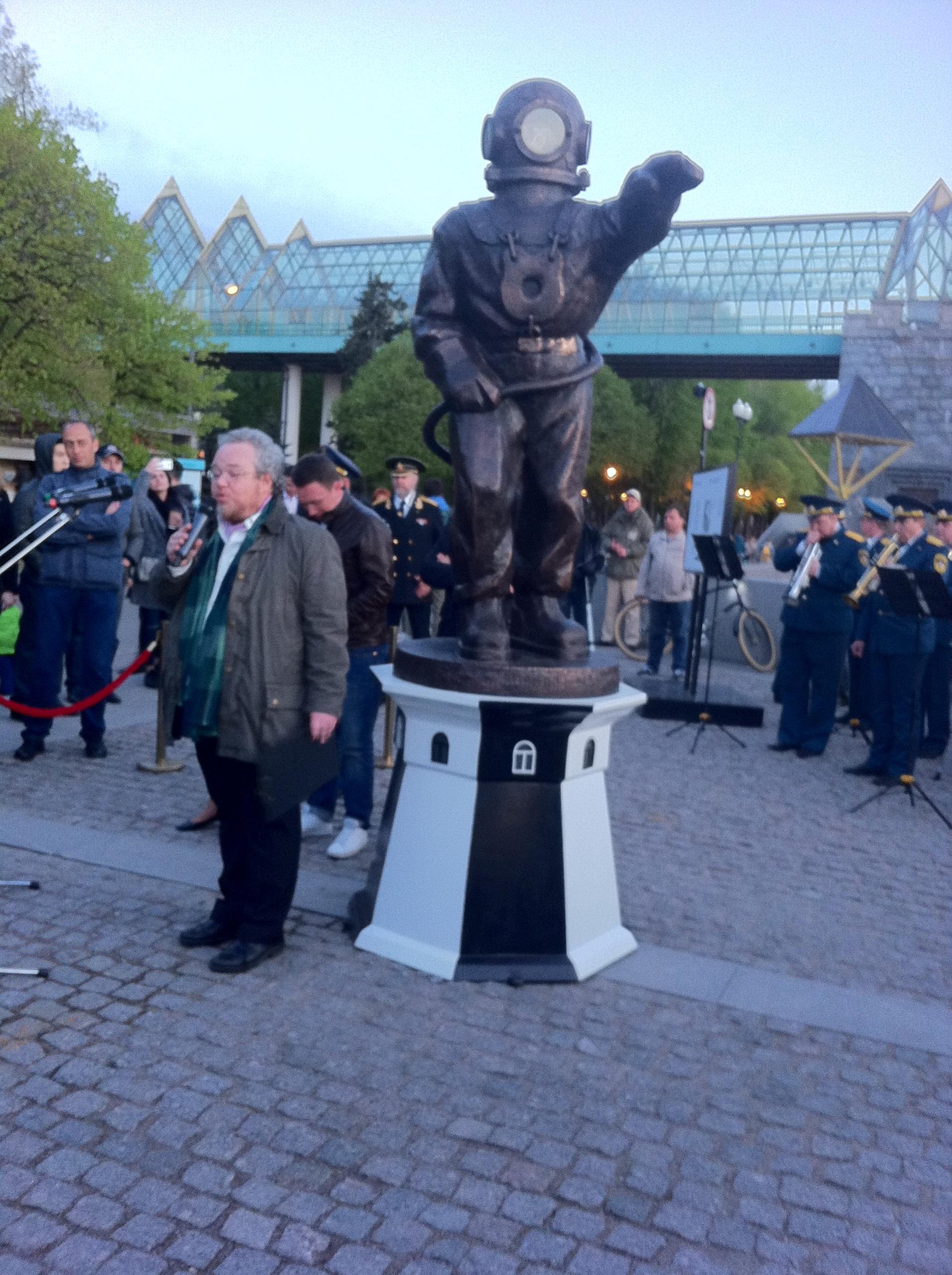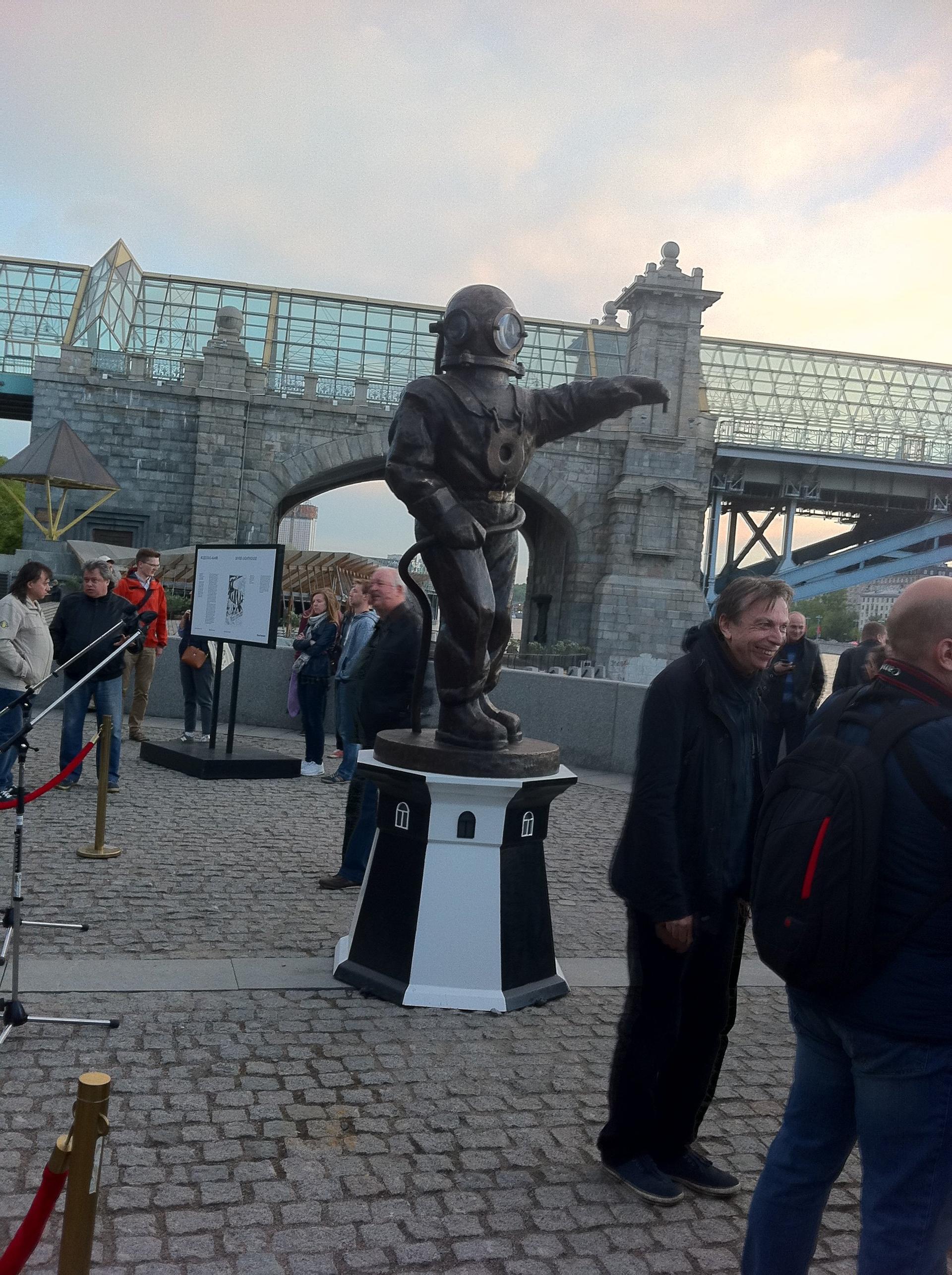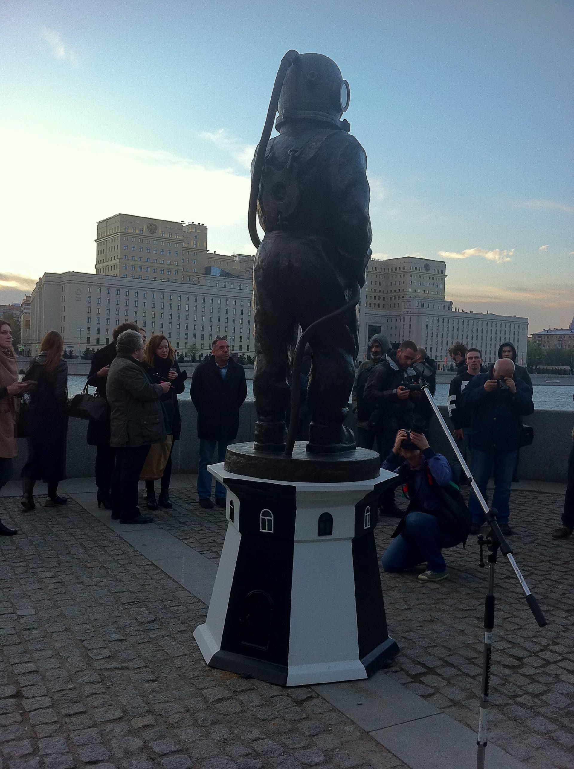 Это первый в Москве (и в России) памятник водолазам. Высота статуи - три метра. Необычный проект был задуман еще скульптором Верой Мухиной в далеком 1937 году, а осуществлен только сейчас художником Леонидом Тишковым. Форму и цвет постамента художник позаимствовал у жемчужины маячной архитектуры - Кыз-Аульского маяка, который стоит на Керченском полуострове в Крыму.
