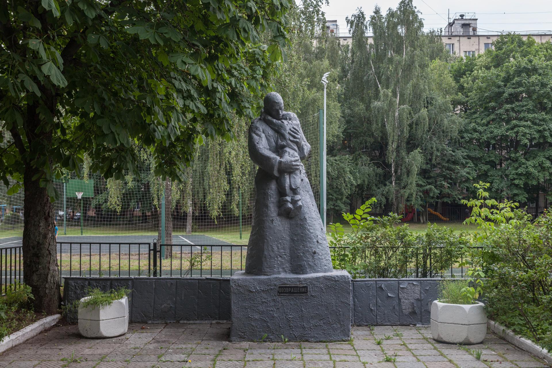 Скульптурная композиция представляет собой фигуру солдата в полный рост, одетого в военную форму, который держит на руках ребенка. Автор изобразил момент возвращения домой с войны солдата, который крепко сжимает обнимающего его сына. Скульптурная композиция выполнена из бетона и установлена на бетонном постаменте.