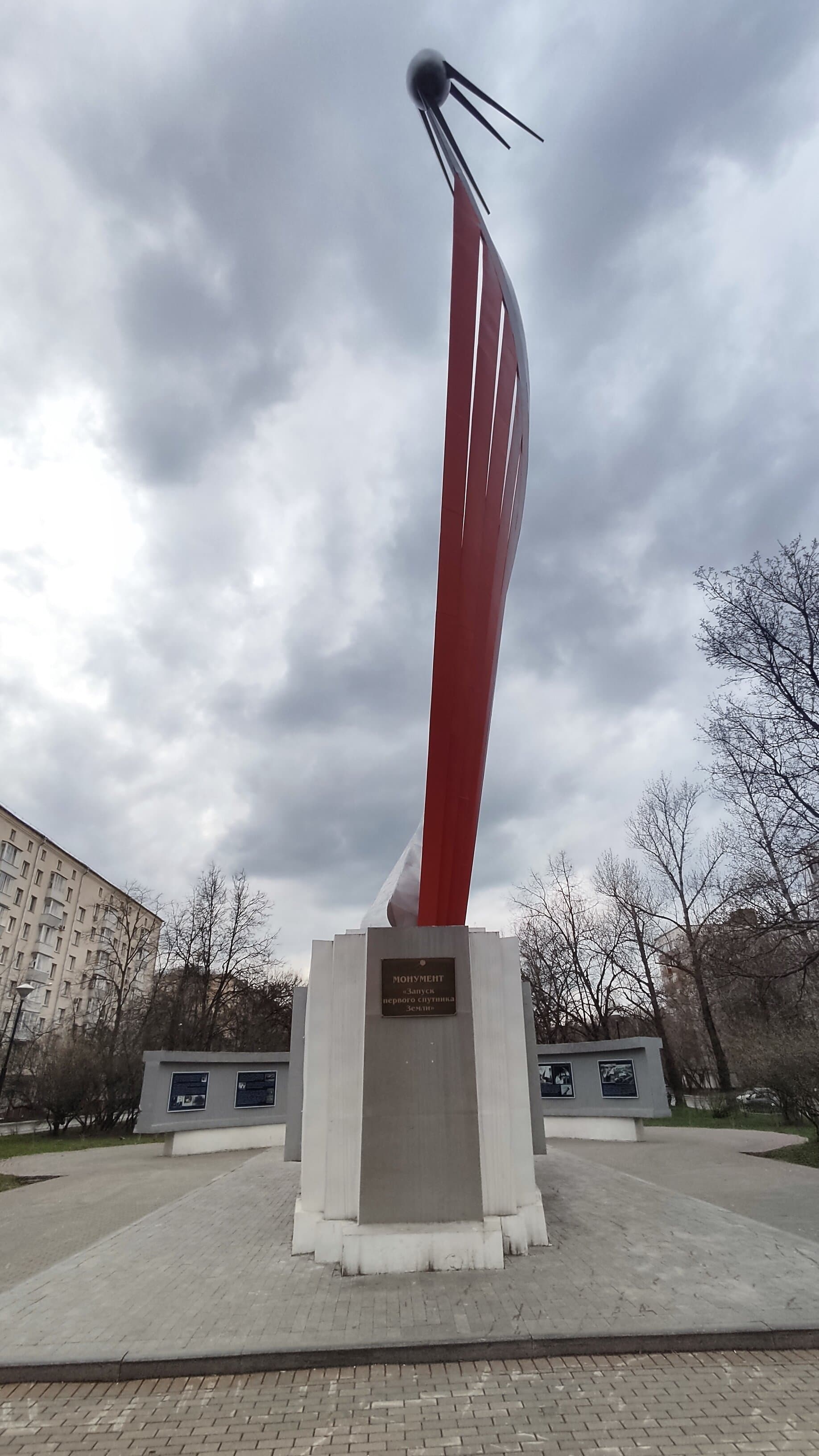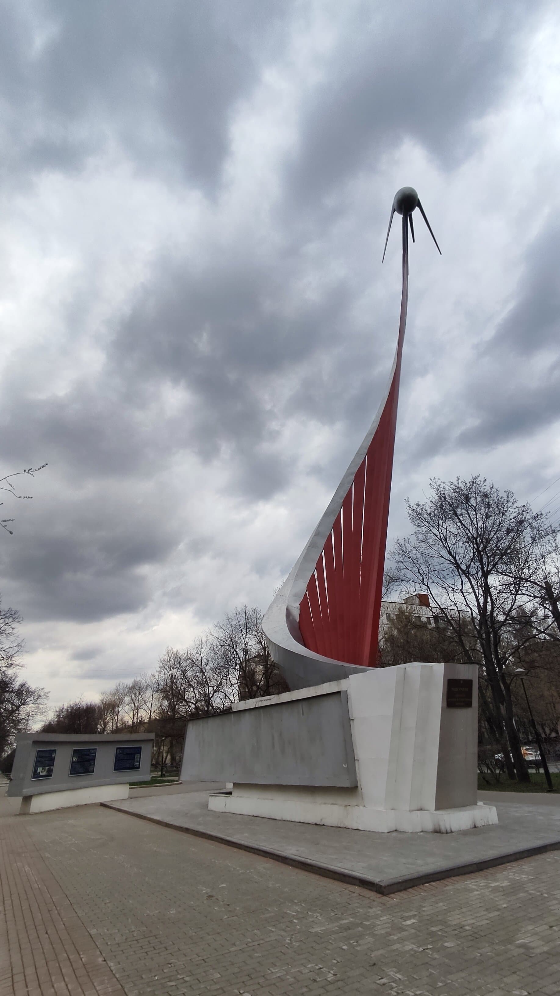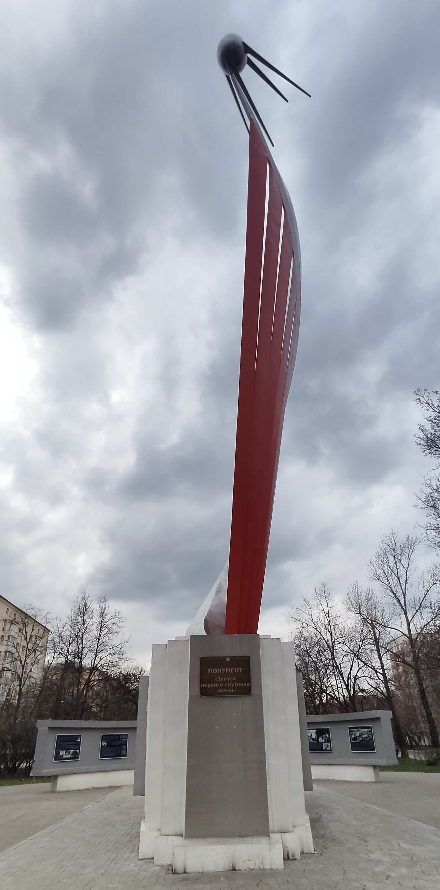 Памятный знак о запуске первого искусственного спутника Земли на орбиту 4 октября 1957 г. Спиралевидная конструкция завершена макетом спутника, выполнена из металла и установлена на бетонном постаменте с п-образной металлической вставкой. За постаментом находятся две плиты (из дерева и металла) полукруглой формы на бетонном постаменте.