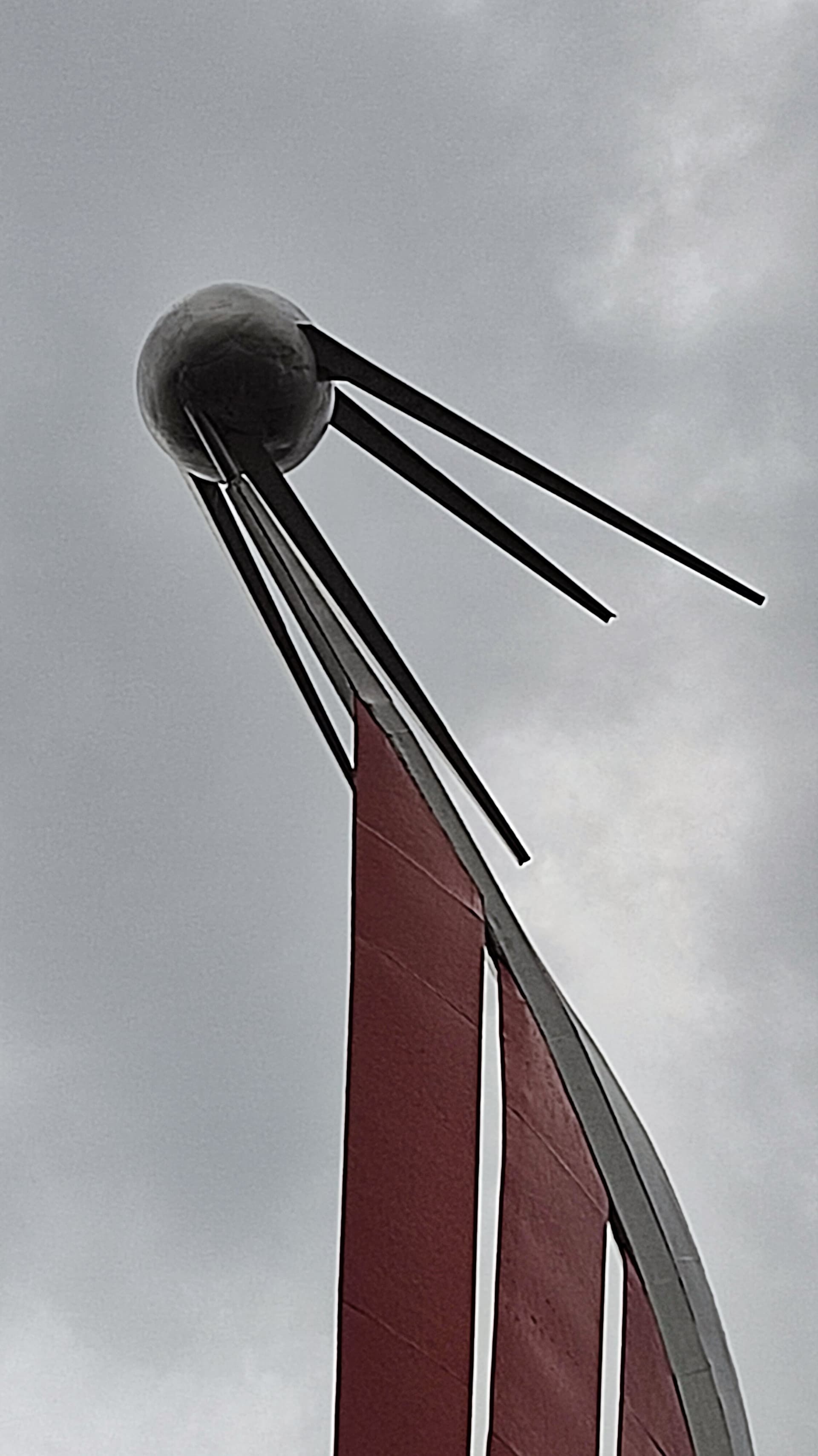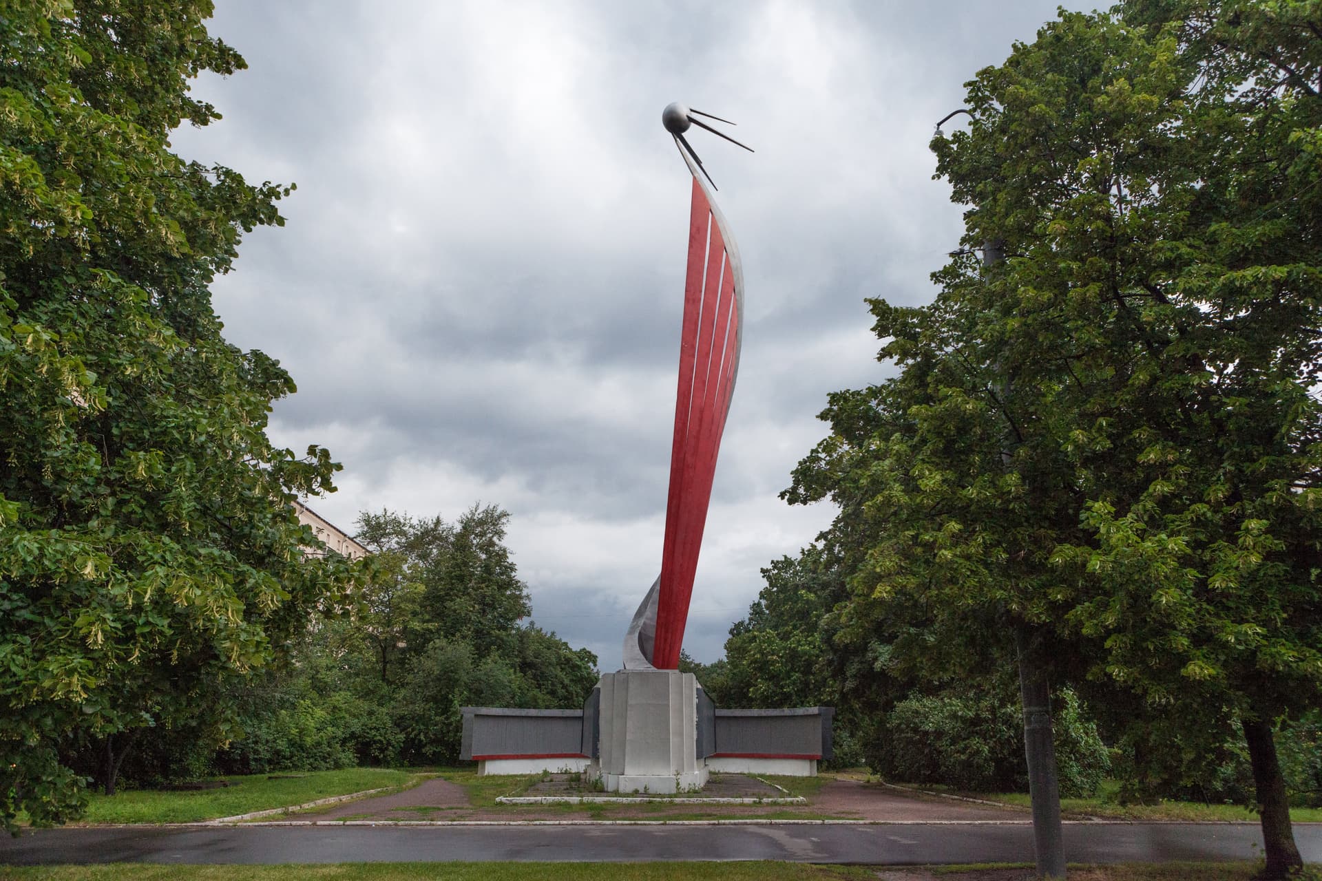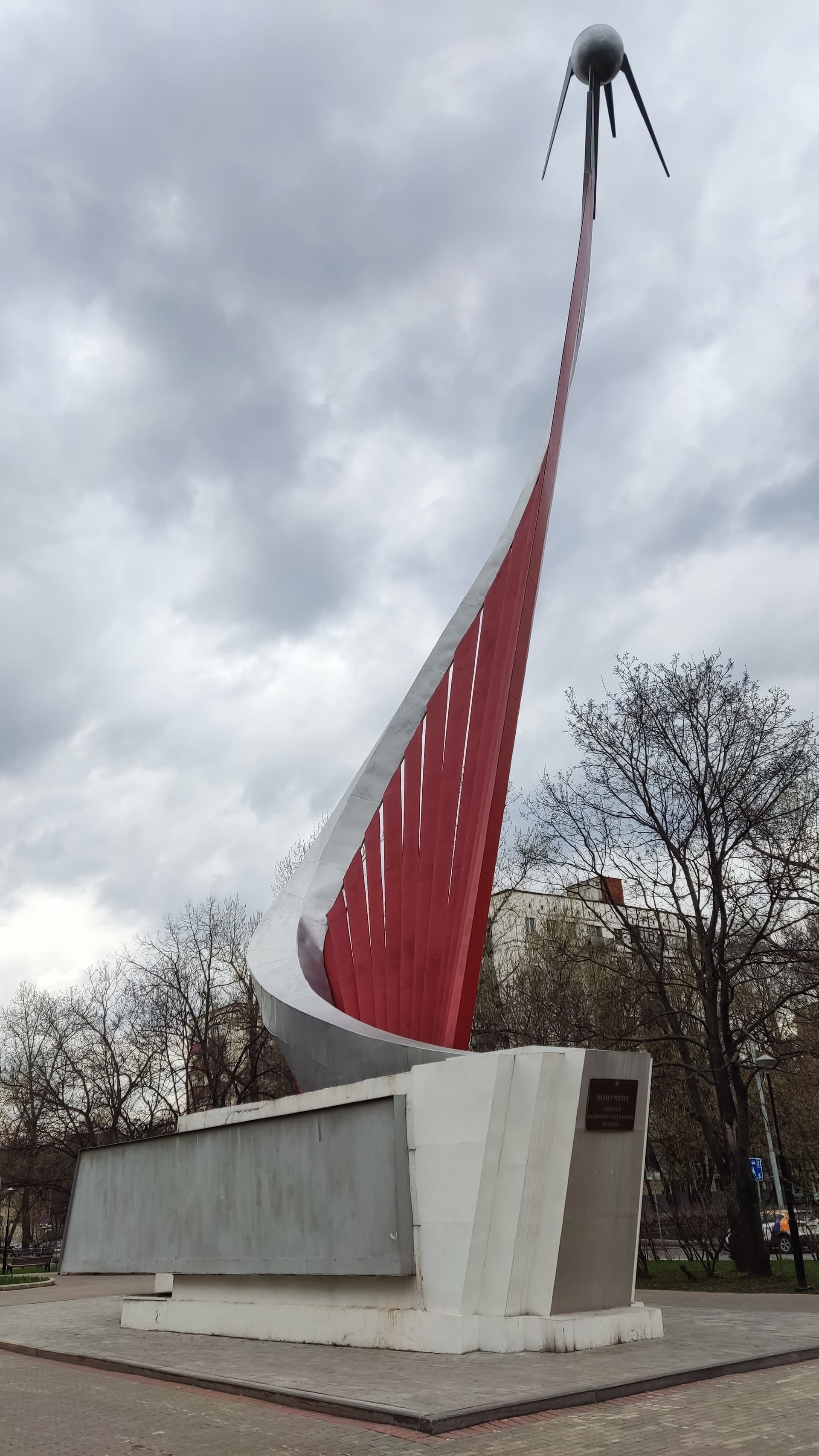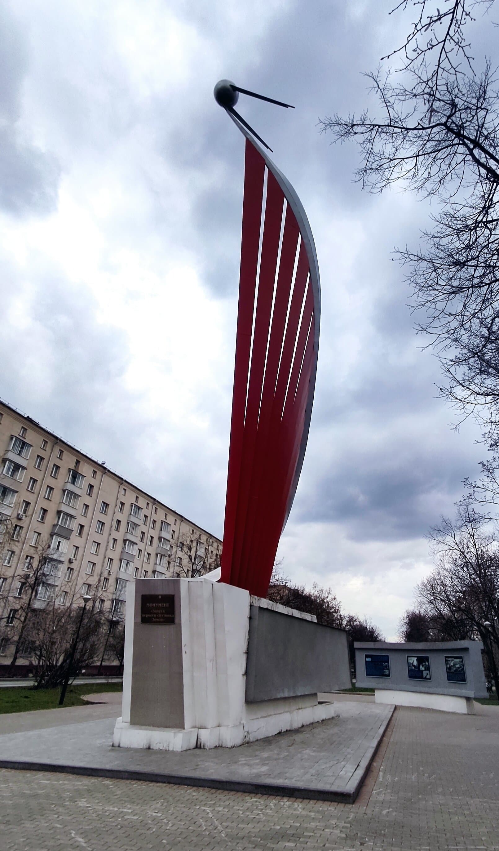 Памятный знак о запуске первого искусственного спутника Земли на орбиту 4 октября 1957 г. Спиралевидная конструкция завершена макетом спутника, выполнена из металла и установлена на бетонном постаменте с п-образной металлической вставкой. За постаментом находятся две плиты (из дерева и металла) полукруглой формы на бетонном постаменте.