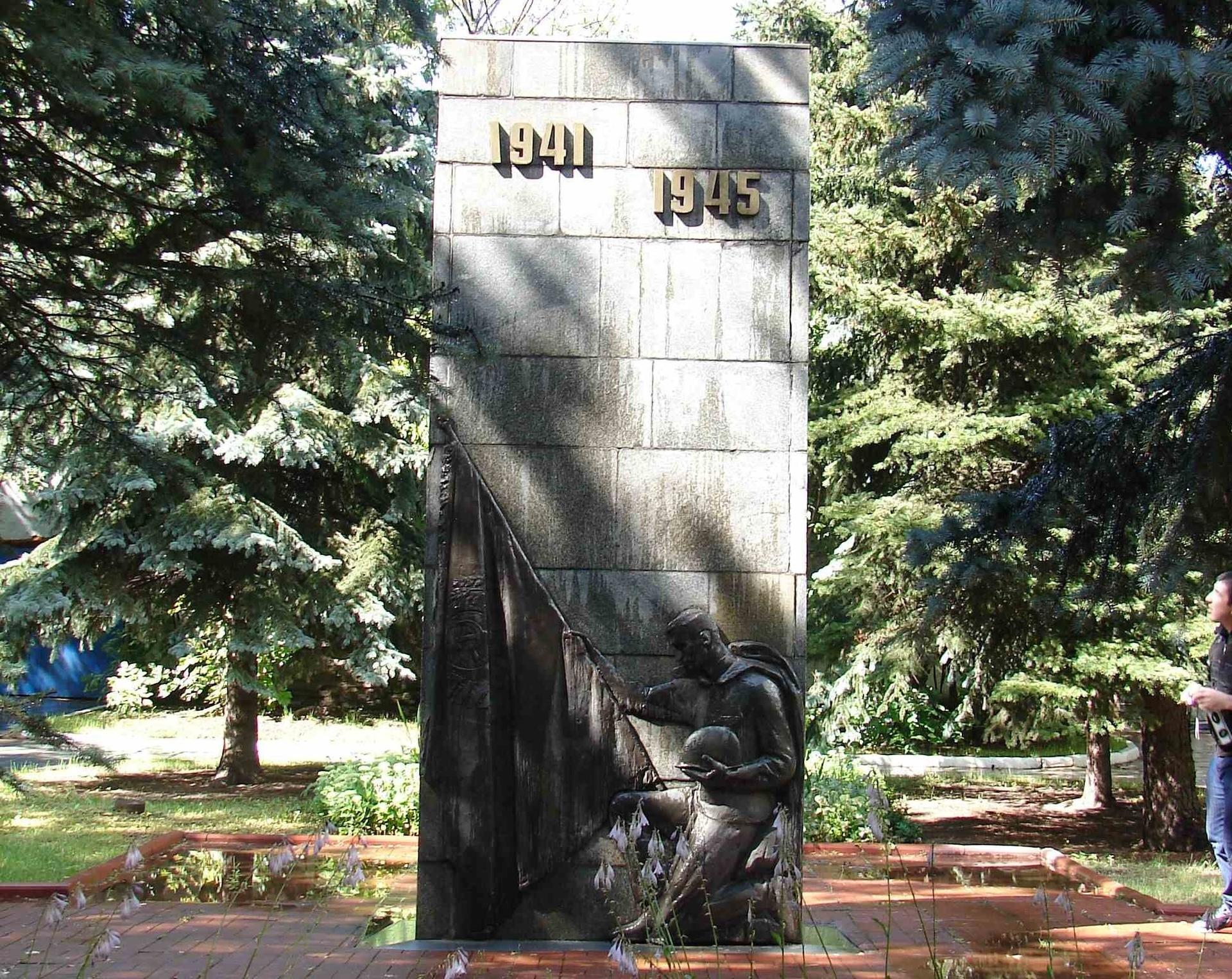 Памятник представляет собой прямоугольную стелу, облицованную гранитом, с основанием, выполненным из тонколистового металла — алюминия. На южном фасаде стелы размещен бронзовый рельеф, изображающий коленопреклоненного солдата, держащего знамя и склонившего голову в почете перед павшими в боях войны людьми. Ремонтные работы на объекте проводились в 2015 г.