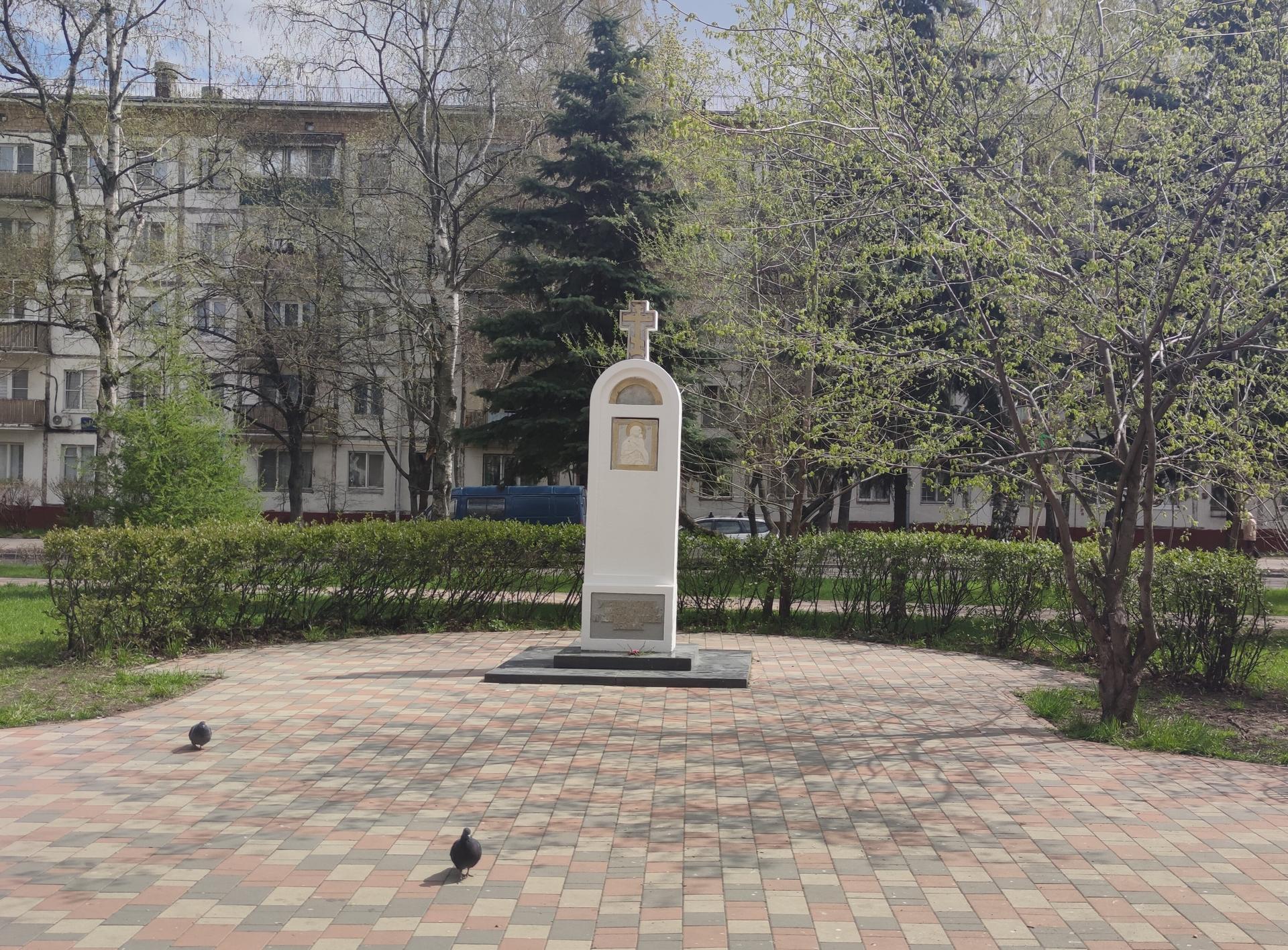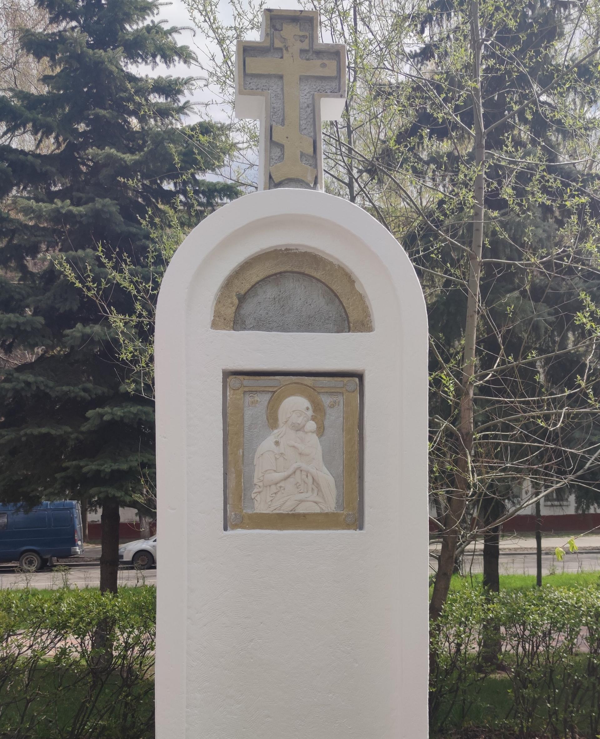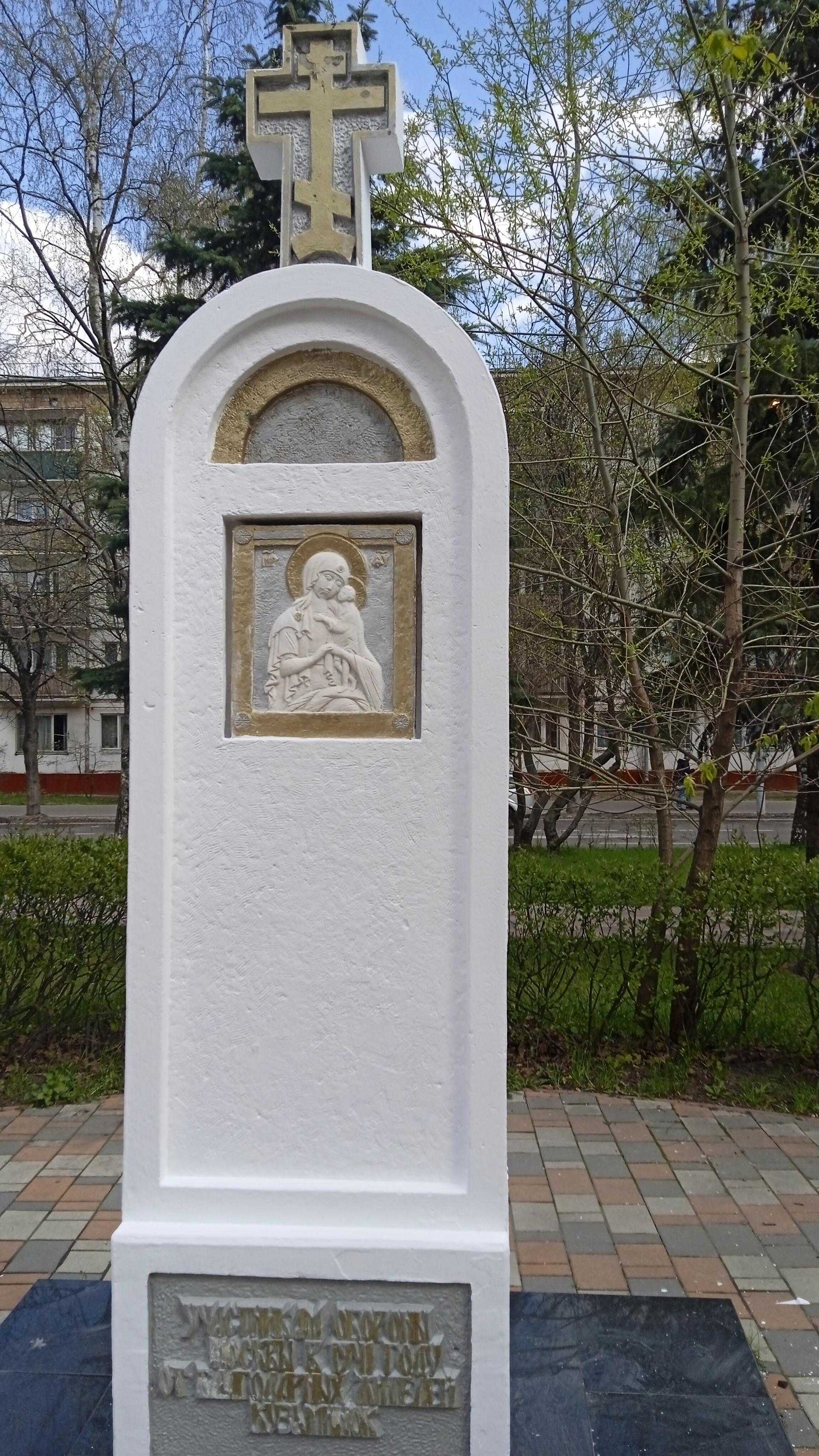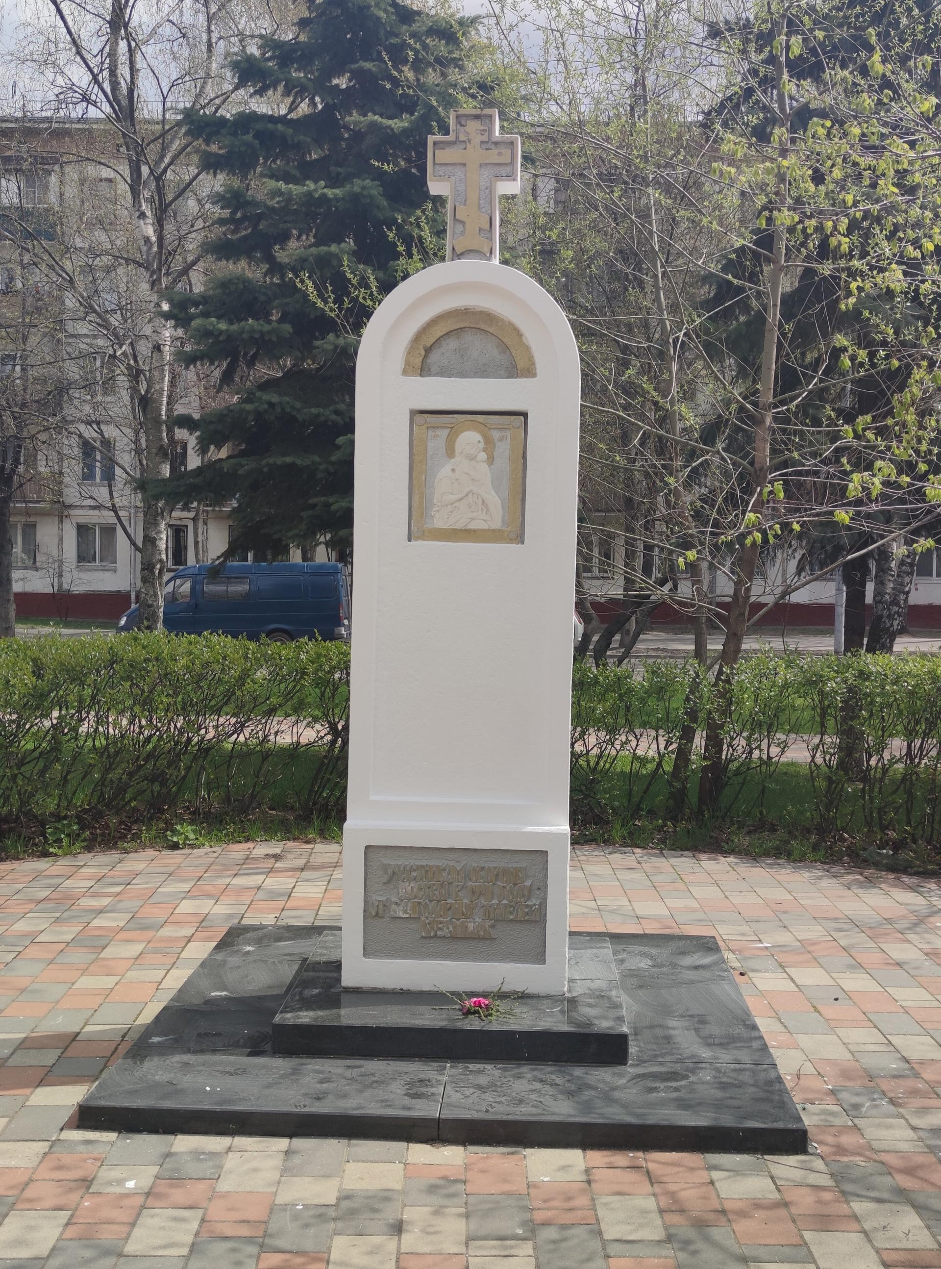 Памятник представляет собой стелу из выкрашенного в белый цвет гранита, установленную на постамент. Венчает стелу православный крест. С фронтальной стороны стелы находится барельефное стилизованное изображение иконы Божией Матери Елеуса. В нижней части стелы прорезными буквами выполнена надпись: «Участникам обороны Москвы в 1941 г. от благодарных жителей Кузьминок».