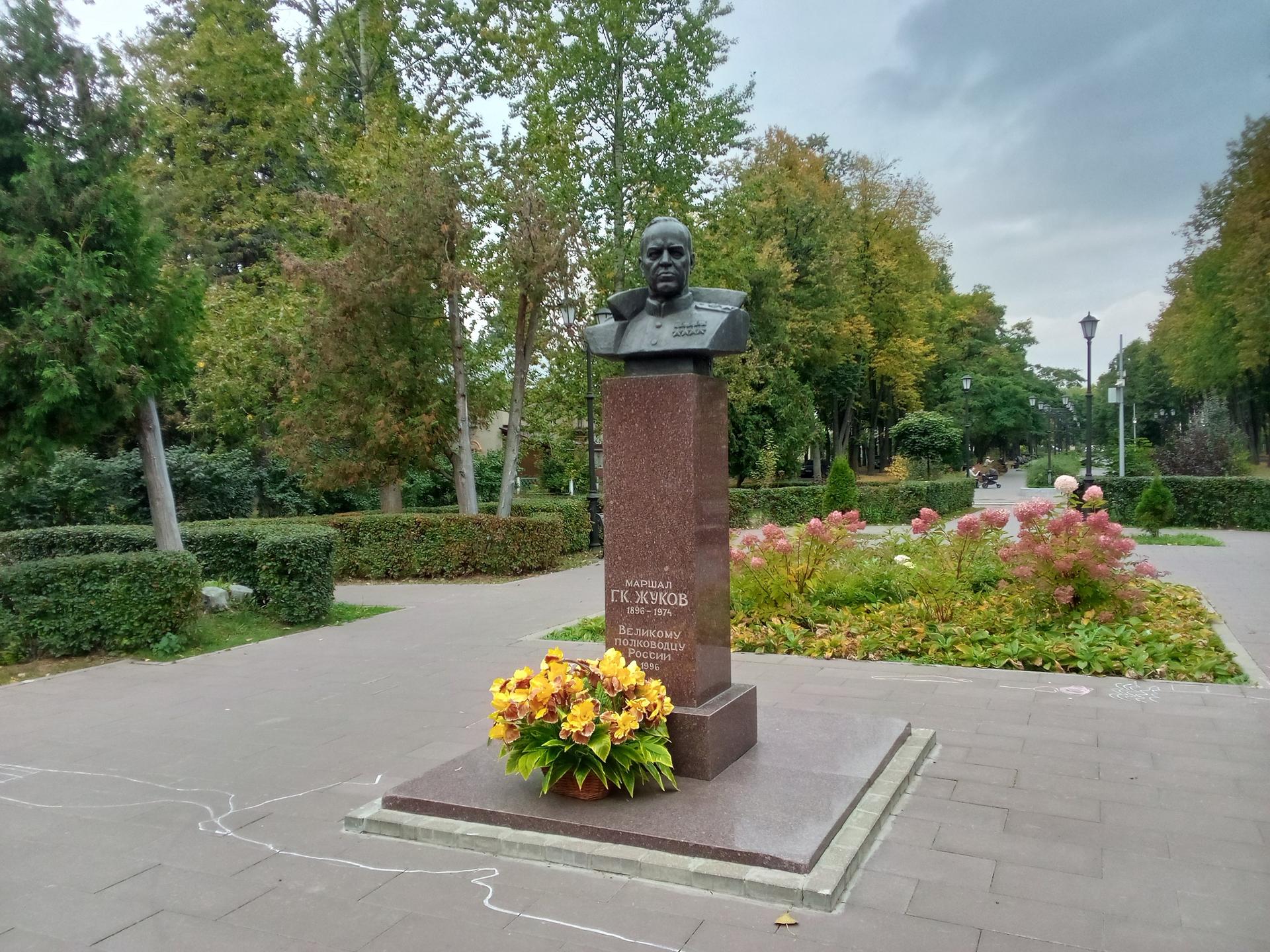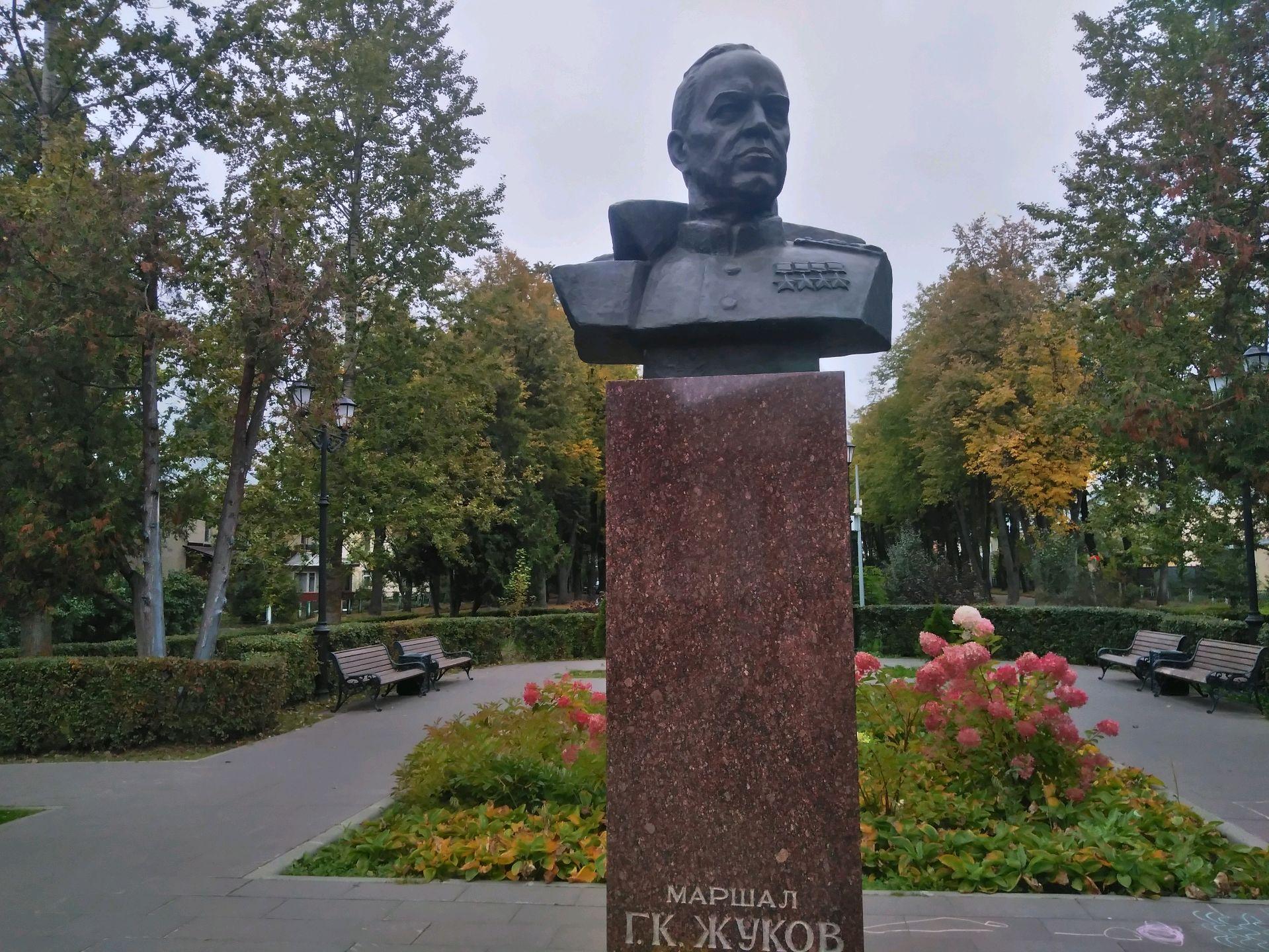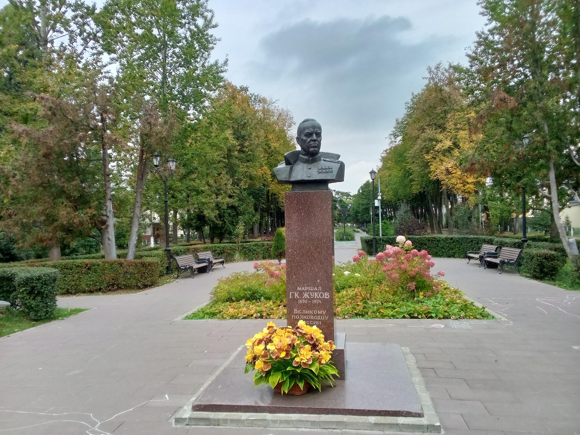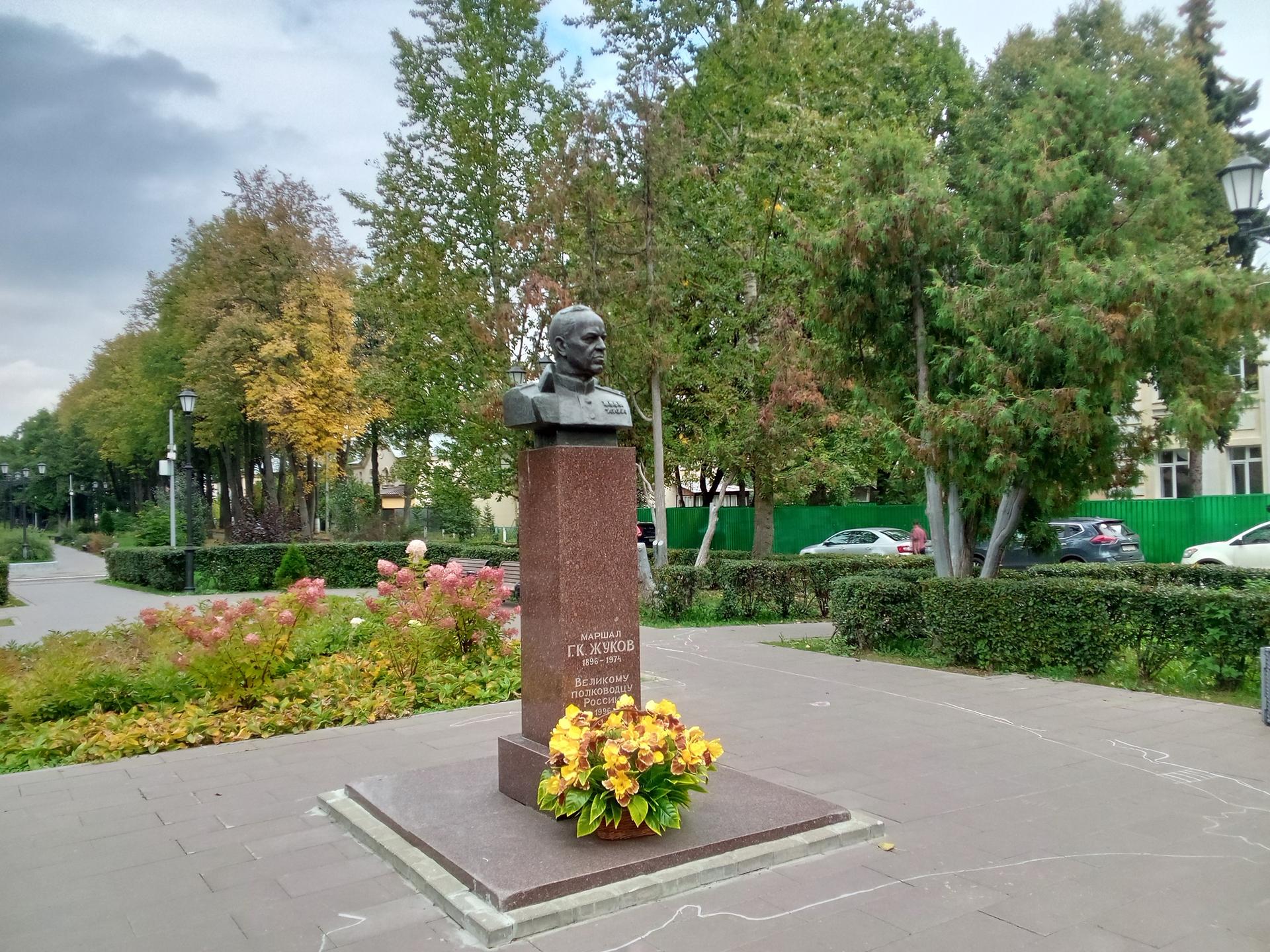 Памятник установлен к 100-летию со дня рождения полководца Г. К. Жукова. Бюст выполнен из бронзы и расположен на гранитном постаменте. Жуков изображен с портретным сходством, одет в парадную форму. Прорезная памятная надпись на лицевой стороне постамента: «Маршал Г. К. Жуков. 1896—1974. Великому полководцу России. 1996». Надпись на тыльной стороне постамента: «Автор Ю. Динес. 1996». Авторская подпись на северном фасаде бюста: «Динес. 96».
