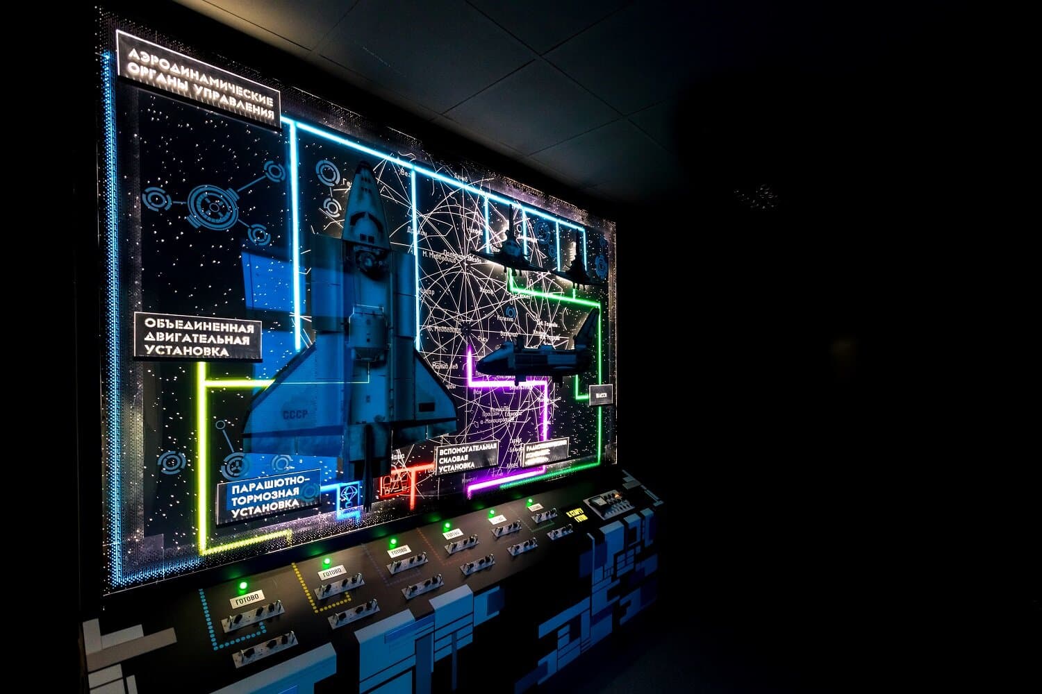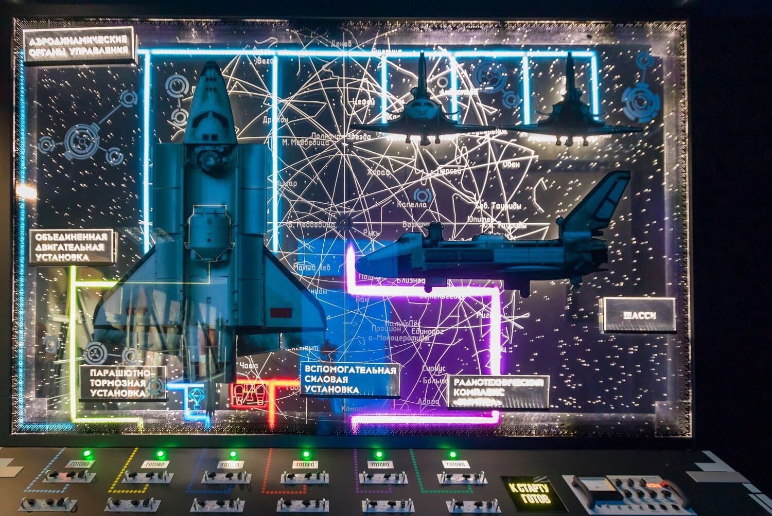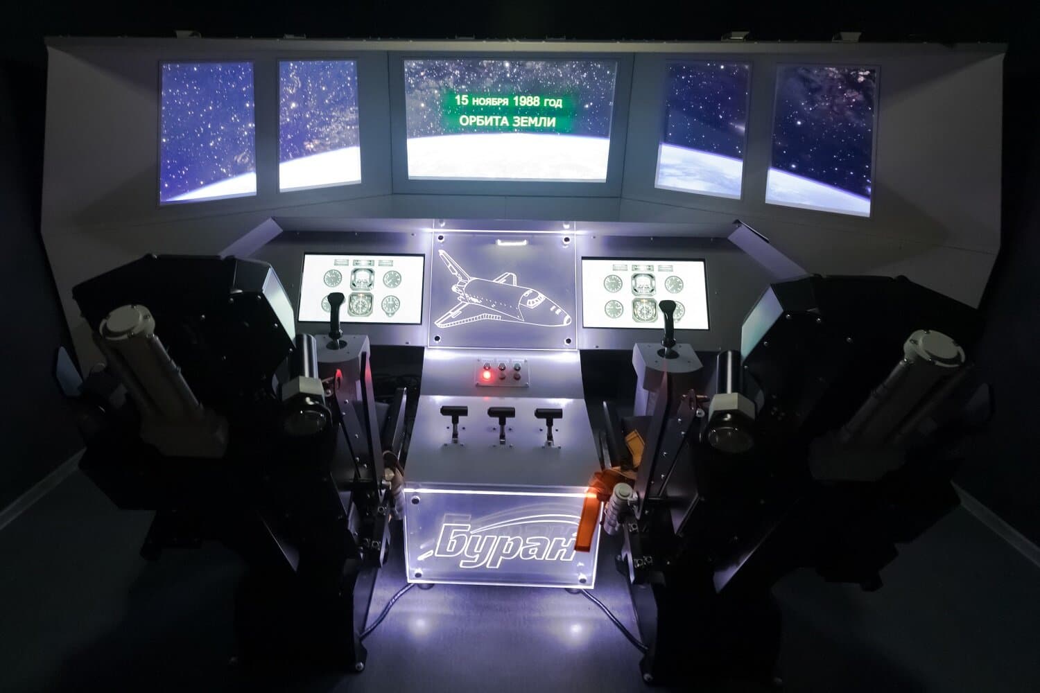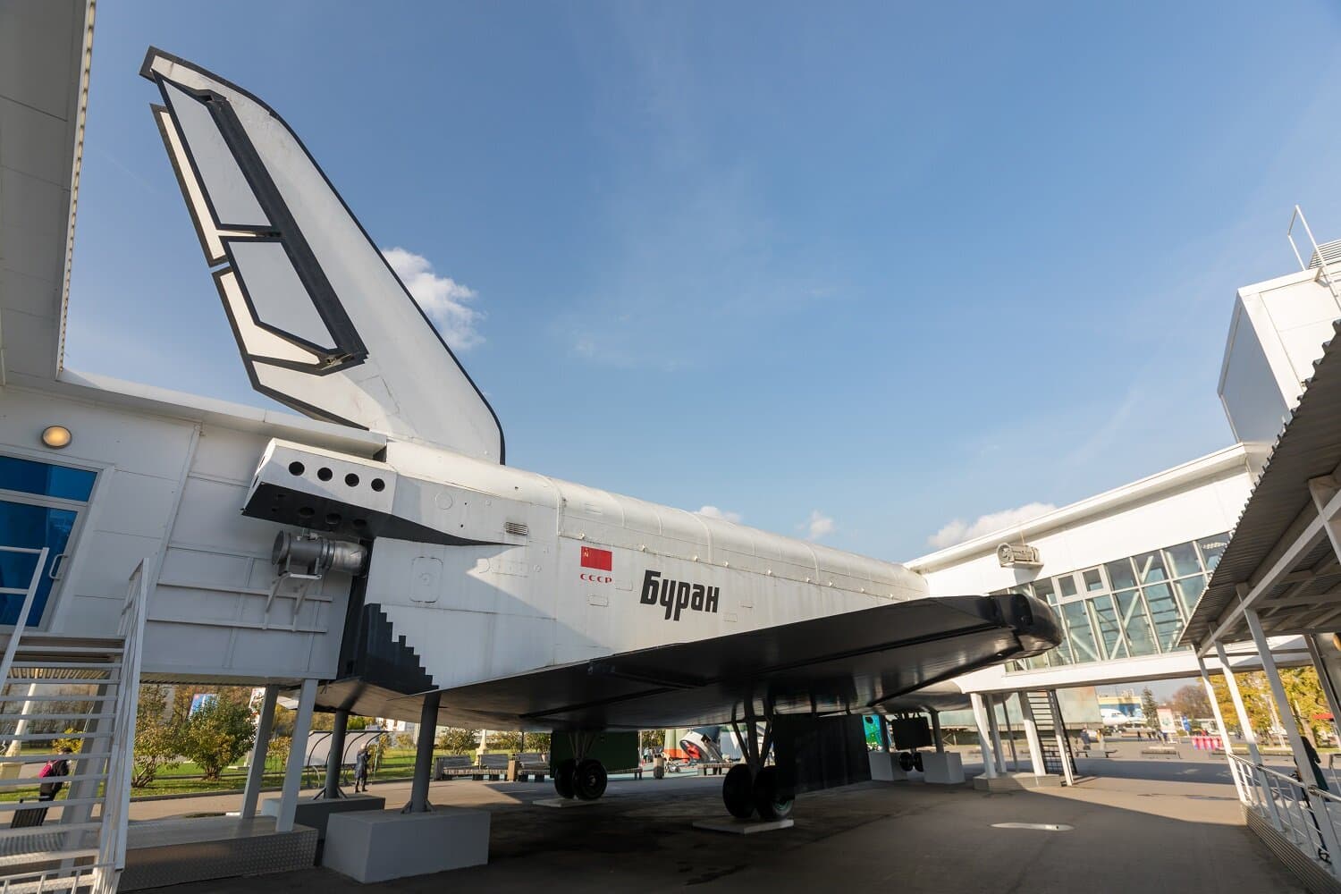 Интерактивный музей внутри макета орбитального корабля «Буран БТС-001» рядом с павильоном №20. В музее можно не только посмотреть фильм о легендарном ракетоплане, но и управлять его посадкой на космодроме Байконур в режиме реального времени.