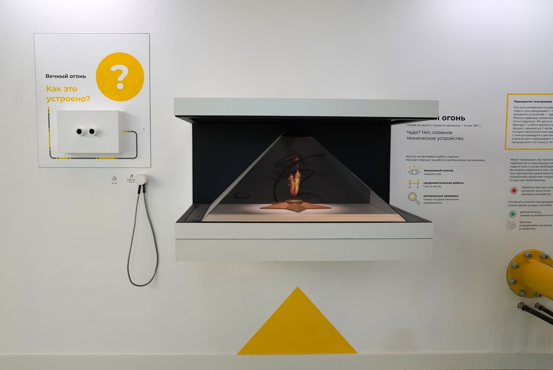 Переступив порог музея, посетители оказываются в обычной московской квартире, где есть все привычные нам коммуникации – электричество, теплоснабжение, горячая и холодная вода, газ. Интерактивные инженерные сети приведут в тематические зоны, которые посвящены работе станции водоподготовки, очистных сооружений, ТЭЦ и других городских систем.