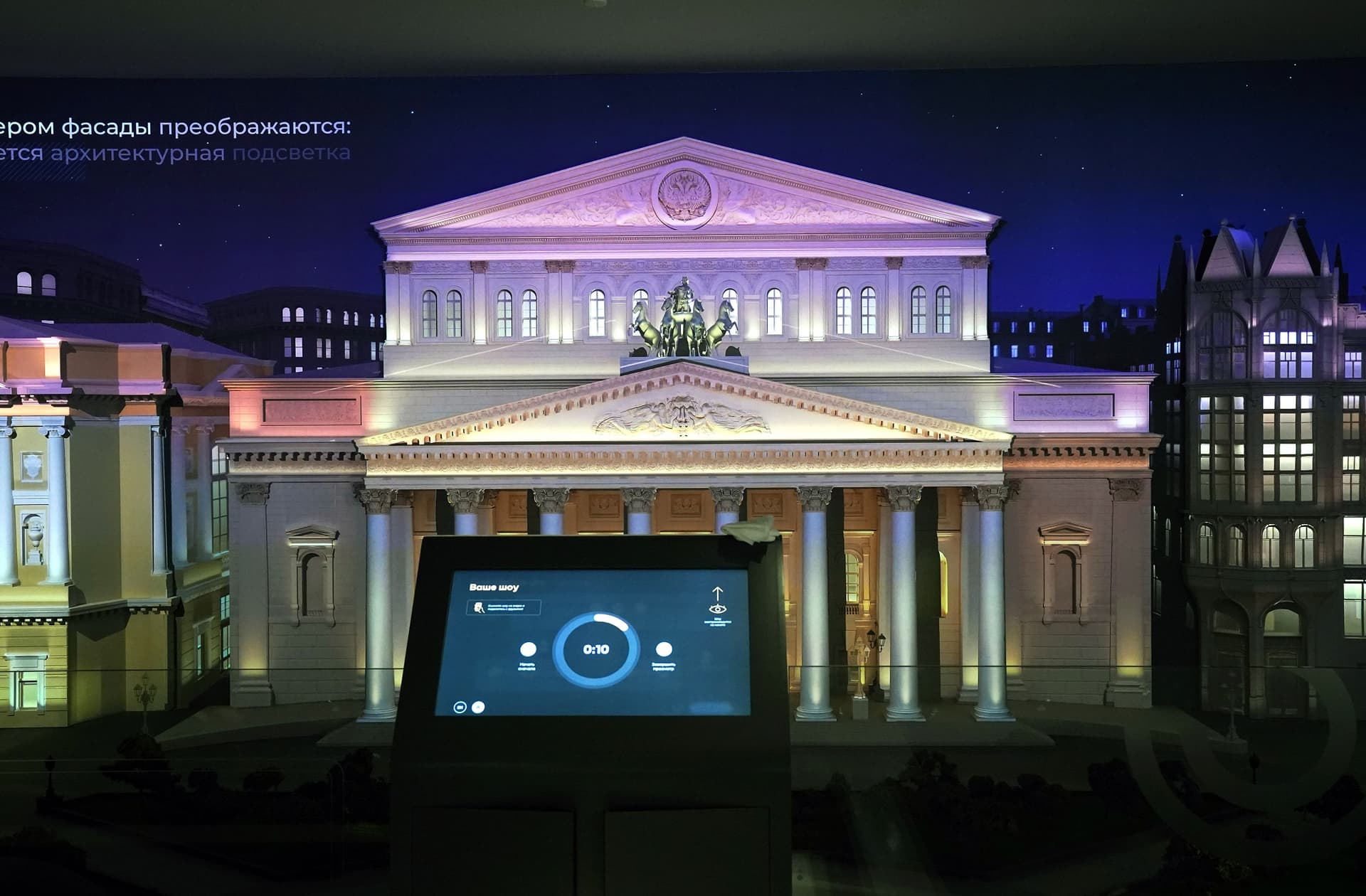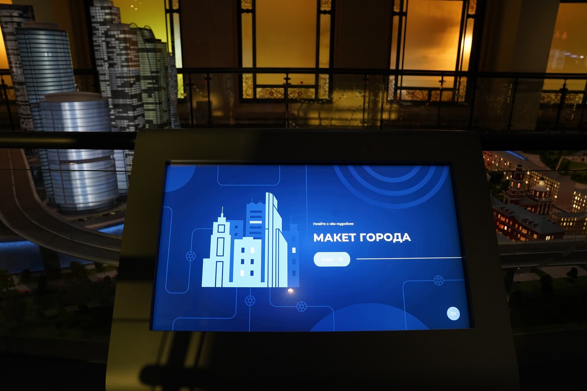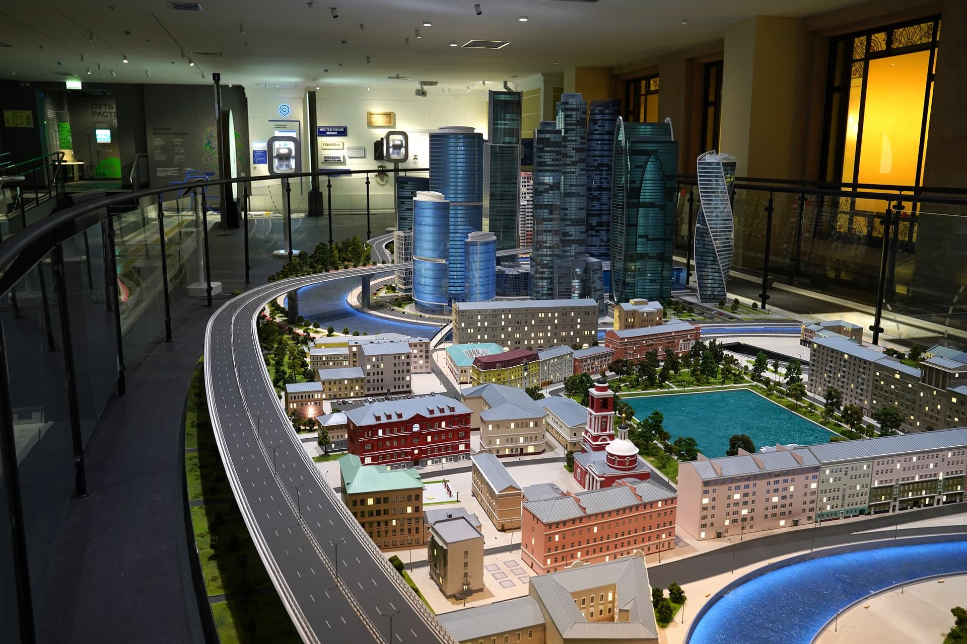 Над ним, на втором этаже, расположен интерактивный макет столицы. Это не точная копия города, а собирательный образ. С помощью технологии дополненной реальности можно увидеть, что происходит в течение дня в известных кварталах городской застройки.