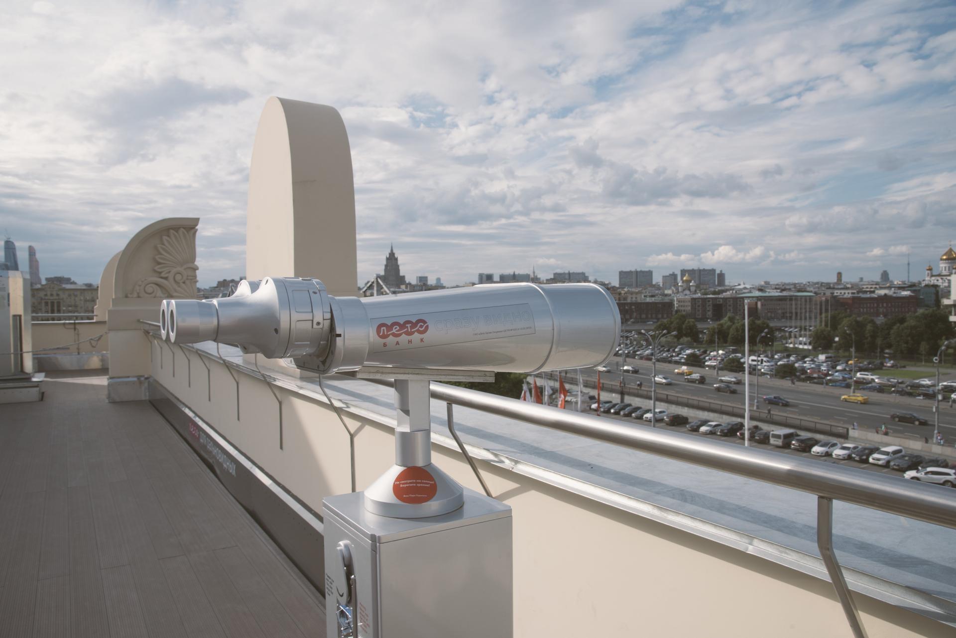 На крыше Музея расположена Смотровая площадка, где установлены бинокуляры с 25-кратным увеличением. Днем через них хорошо видно здания РАН и МГУ, Деловой центр «Москва-Сити», Храм Христа Спасителя, сталинские высотки, Крымский мост, а вечером – лунное небо.