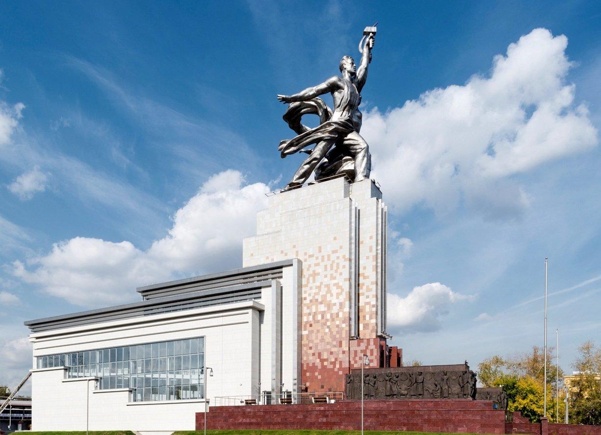 Музейно-выставочный центр открылся в сентябре 2010-го, внутри нового постамента легендарной скульптуры Веры Мухиной «Рабочий и колхозница». 24-метровая скульптура Мухиной «Рабочий и колхозница» – шедевр советского и мирового модернизма первой половины XX века – была сделана по новым технологиям, открытым советским металловедом, профессором П.Н. Львовым. На многотонный каркас навешивалась оболочка из хромоникелевой стали, соединяемая путем сварки. Статуя была сделана для советского павильона Всемирной выставки в Париже 1937 года и яростно летела навстречу нахохлившемуся орлу со свастикой на карнизе стоявшего напротив павильона фашистской Германии. В собрании МВЦ «Рабочий и колхозница» хранятся материалы, напоминающие о том, что автором идеи скульптуры был архитектор павильона выставки – Борис Иофан. Вдохновившей его пластической темой стала античная статуя «Тираноборцы». Воздетые к небу руки с мечами заменили руки с мирными атрибутами, эмблемами советской страны – серпом и молотом. То, что автором образа был один художник – Иофан, подтверждают эскизы скульптуры, выполненные для закрытого конкурса 1936 года В.А. Андреевым, В.И. Мухиной и М.Г. Манизером. На первый взгляд, все варианты (за исключением тоже участвовавшего в конкурсе 1936 года экспрессионистического монумента И.Д. Шадра) очень похожи. Та же постановка двух фигур, те же воздетые руки. Только у авторов-мужчин герои уподоблялись ледяным в своем совершенстве античным богам, а у Веры Мухиной в них клокотала необоримая сила внутренней энергии и страсти.