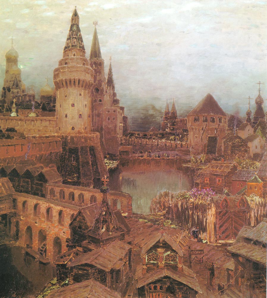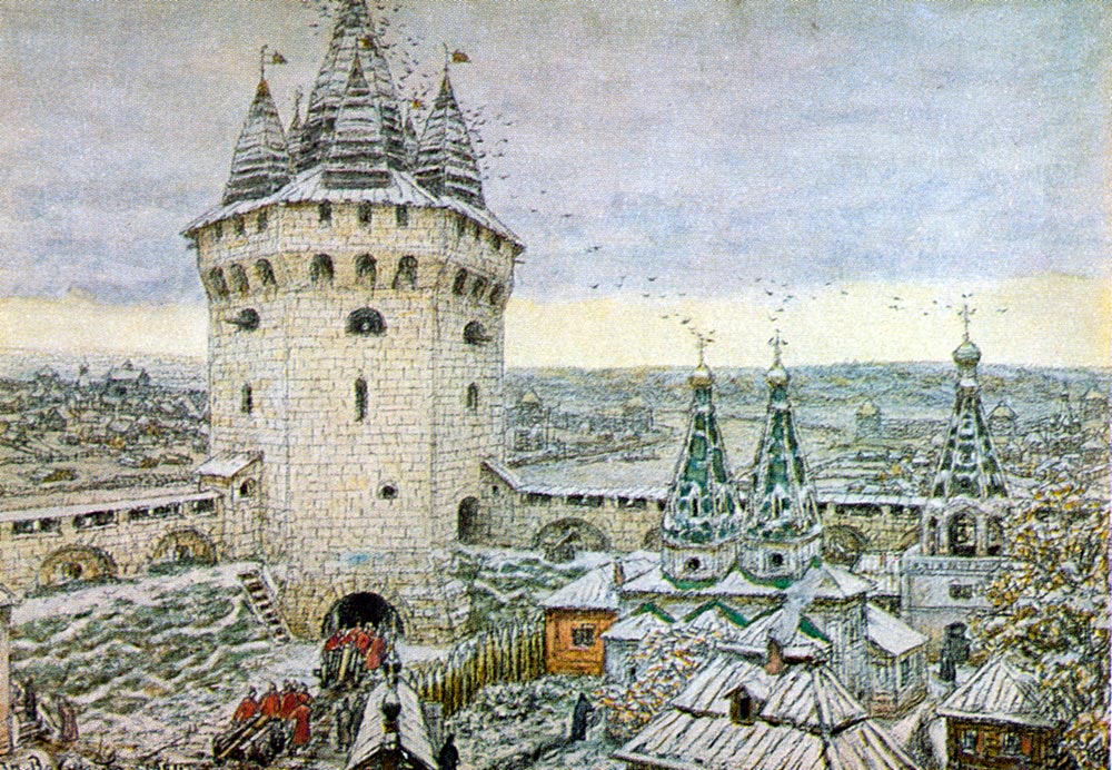 Картина А. Васнецова. Семиверхая угловая башня Белого города в XVII веке.