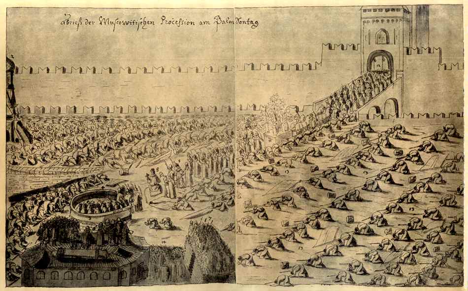 Празднование Вербного воскресенья на Красной площади. Рисунок из Альбома Мейерберга