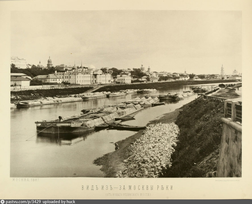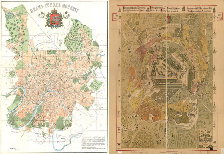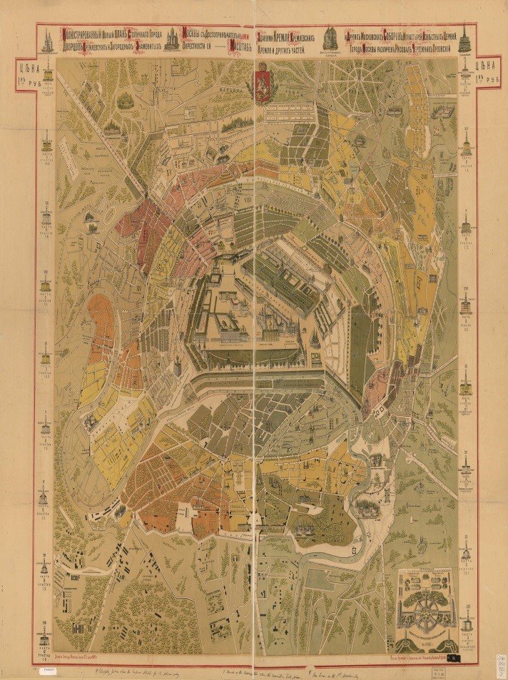 Справа – карта, скорее всего иллюстрированная схема-план города Москвы, нарисованная чертежником Орловским (издание А. Земского 1881 г., хромолитография Абрамова). Полное название схемы: «Иллюстрированный новый план столичного города Москвы с достопримечательными зданиями Кремля, кремлевских и других московских соборов, монастырей, известных церквей, дворцов, кремлевских и загородных знаменитых окрестностей». Официальная городская черта в XIX в. – «Камер-коллежский вал» – окаймляла площадь в 71 кв. километр. В Москве преобладала малоэтажная застройка, прерываемая частыми усадьбами и садами. Парки, сады, бульвары и кладбища занимали 16 % территории города, а 8 % – суходольные луга, пустыри, заболоченные территории и водоёмы.