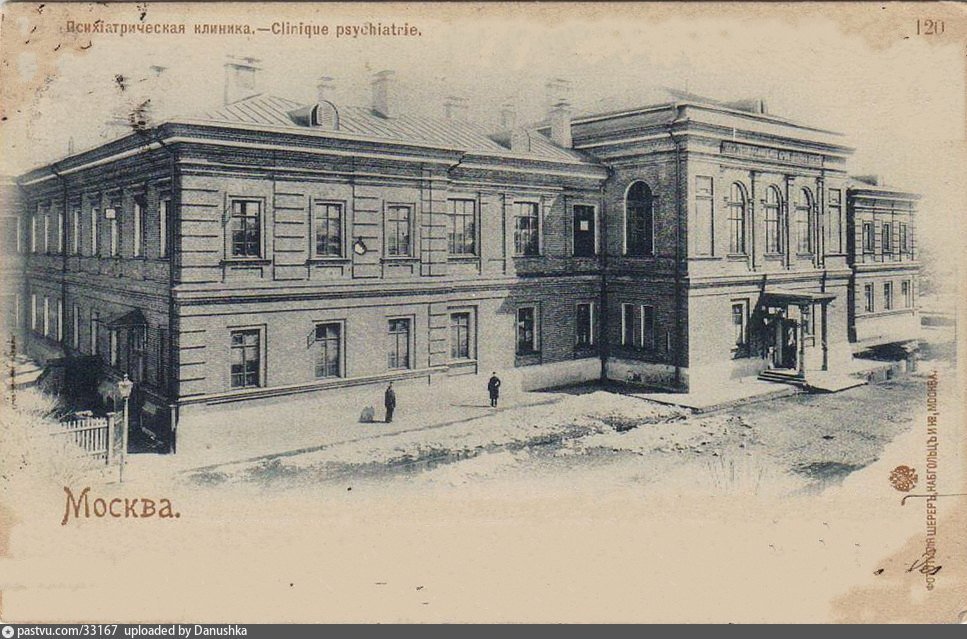 Строительство Психиатрической клиники осуществлялось в 1885—1887 годах по проекту архитектора К. М. Быковского (при участии А. Я. Кожевникова и главврача Преображенской больницы В. Р. Буцке) на деньги вдовы В. А. Морозовой (Хлудовой). Её супруг, А. А. Морозов, страдал психическим недугом и по решению самой Морозовой лечился на дому. Лечащим врачом Морозова был профессор С. С. Корсаков, даже вне больницы он поддерживал состояние относительно стабильной ремиссии у пациента. После ухода из жизни Морозова в 1882 году его вдова пожертвовала долю наследства на постройку клиники для психически больных, а Корсаков стал её первым начальником. В 1938 году клинике присвоено было присвоено его имя, а в 1949 году перед её зданием был установлен бюст психиатра (скульптор С. Д. Меркуров).