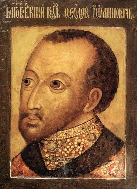 Федор Иоаннович, третий сын Ивана IV Грозного, последний царь всея Руси и великий князь Московский из династии Рюриковичей. Федор был полной противоположностью отцу. По натуре незлобив, постоянно улыбался и был очень набожен. По словам самого Ивана Грозного, Фёдор был "постник и молчальник, более для кельи, нежели для власти державной рождённый". В 1584 году, после смерти Грозного, Федор унаследовал престол. Большинство историков считают, что Фёдор был не способен к государственной деятельности, по некоторым данным слабый здоровьем и умом. Он принимал мало участия в управлении государством, находясь под опекой сперва совета вельмож, а затем своего шурина Бориса Фёдоровича Годунова, который с 1587 года был фактически единоличным правителем государства. Фёдор царствовал, а Борис управлял. Это знали все и на Руси, и за границей. В январе 1598 года 40-летний царь Федор Иоаннович умер. Недоброжелатели Годунова утверждали, что тот отравил последнего Рюриковича. Доказательств этому нет, но при исследовании скелета Федора в его костях были обнаружены следы мышьяка.