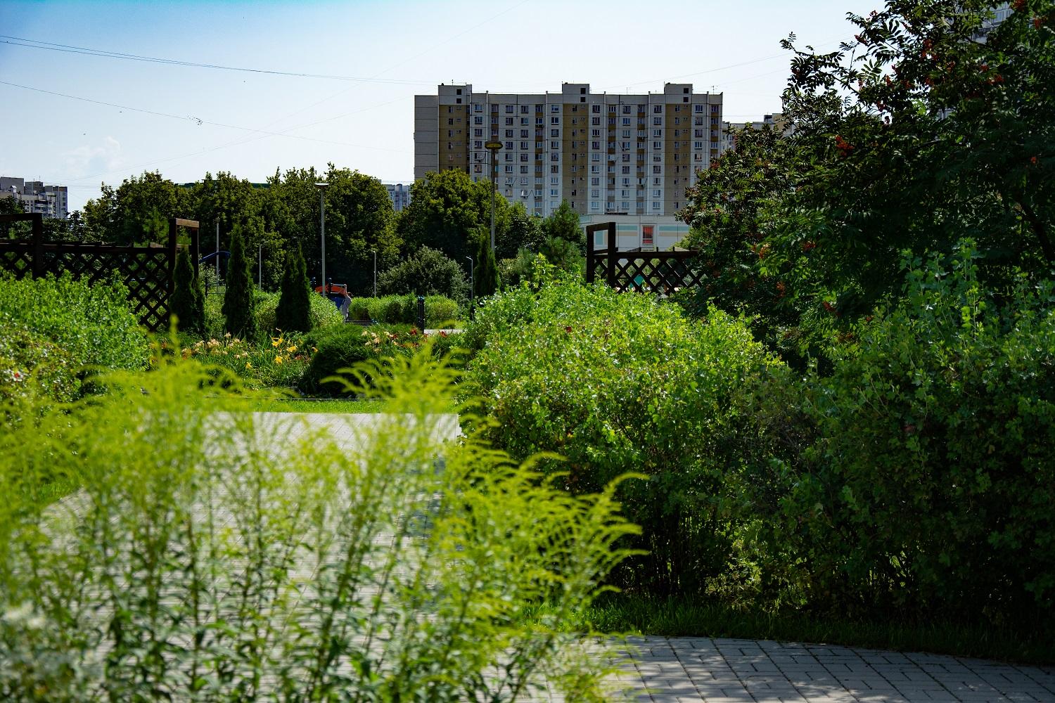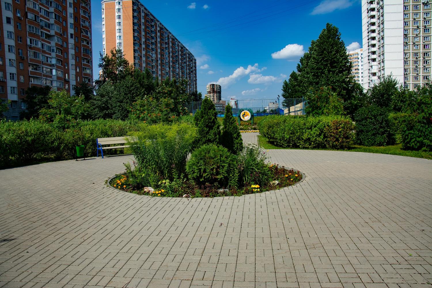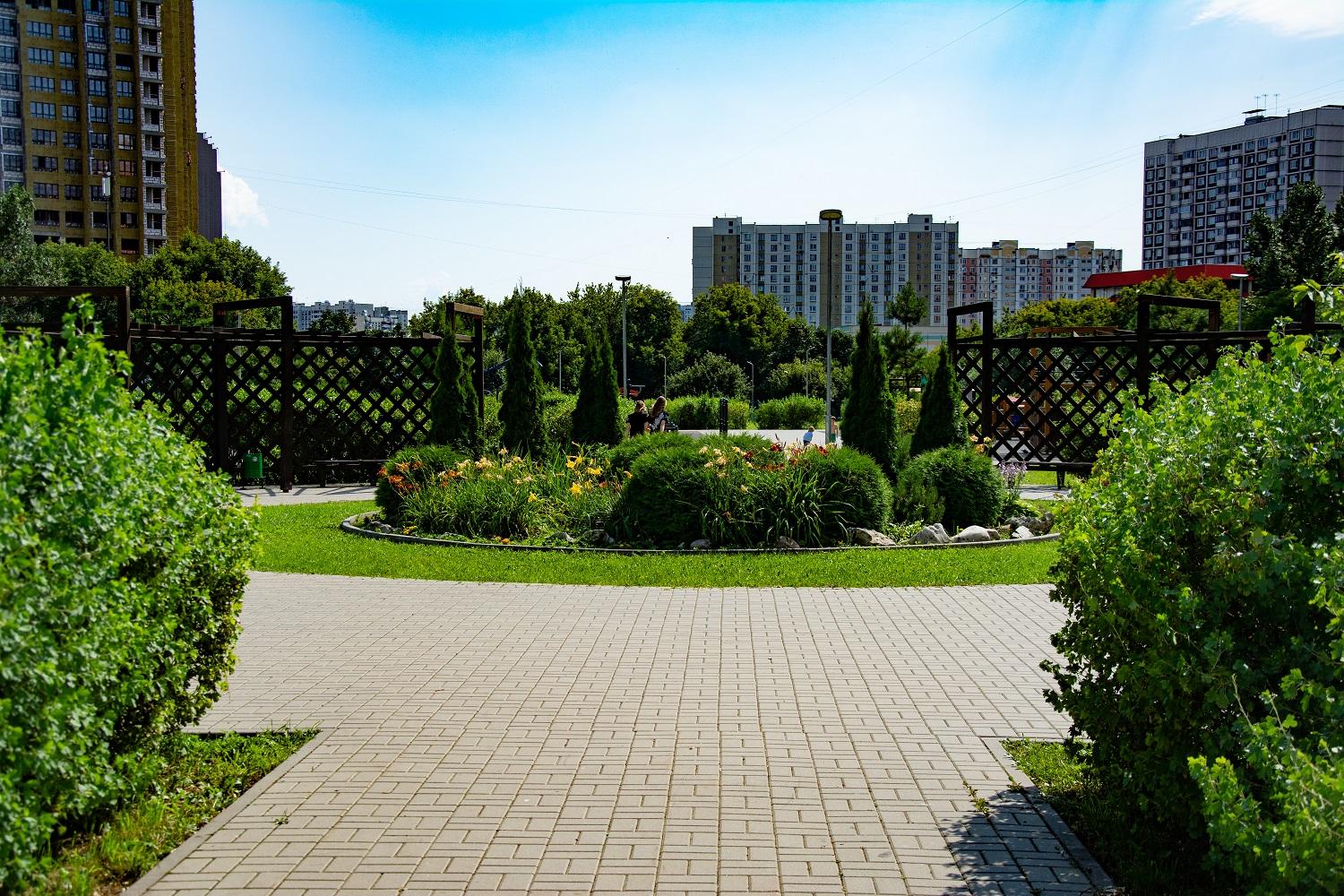 В сквере есть спортивная и игровая зоны. Они соединены с пространствами для отдыха мощеной дорожкой, украшенной ажурными арками в форме сердца. Здесь оборудован большой игровой городок для детей разного возраста с деревянными комплексами, лазалками, балансирами и горками. Напротив обустроена зона воркаута с тренажерами. Если пройти до конца аллеи в сторону улицы Верхние Поля, можно обнаружить большую площадку для собак.