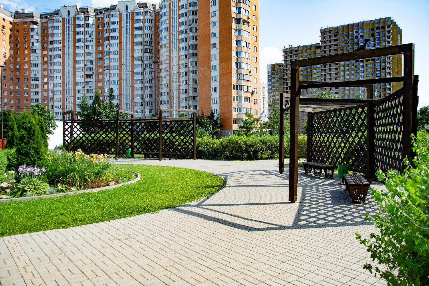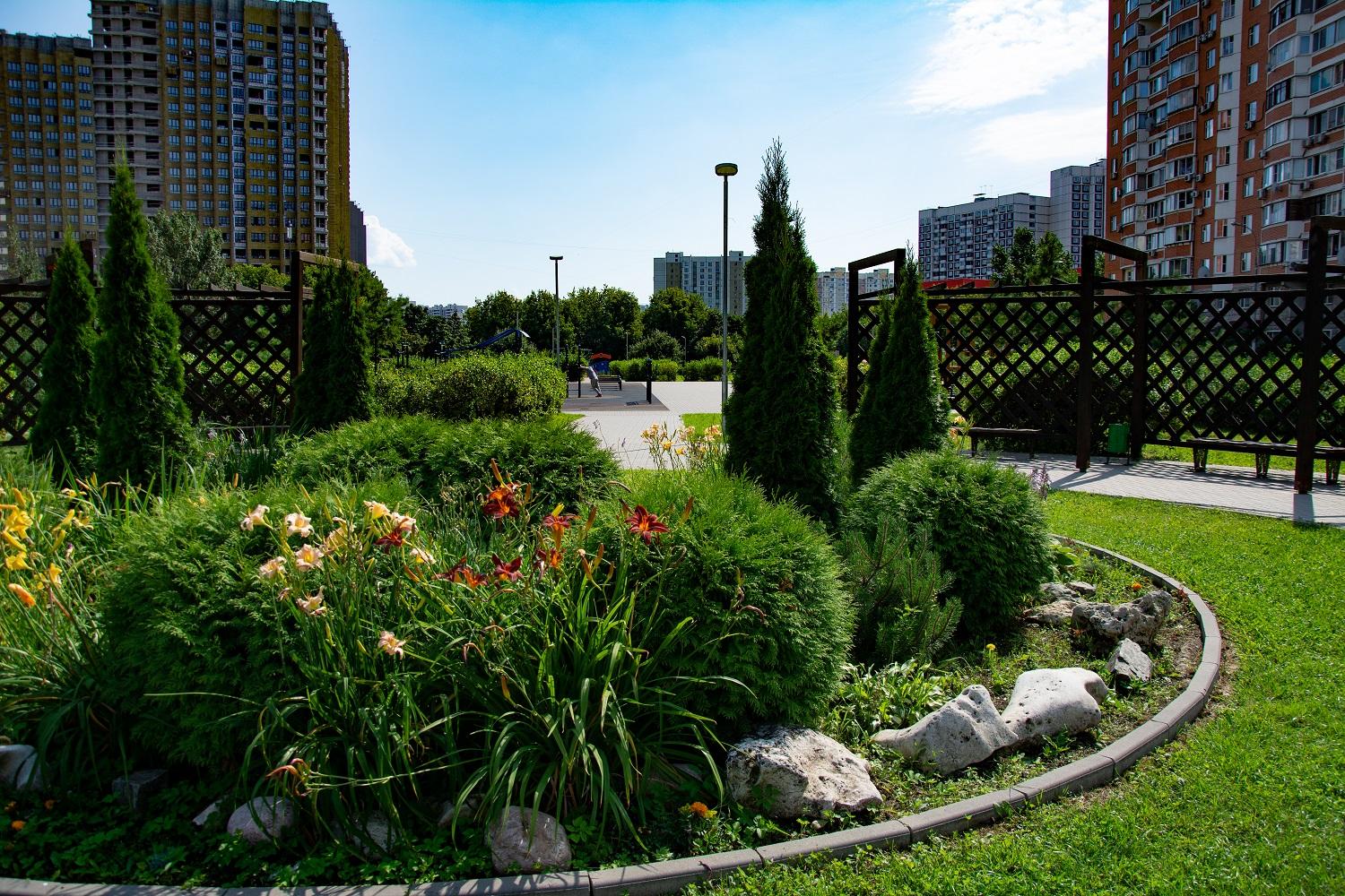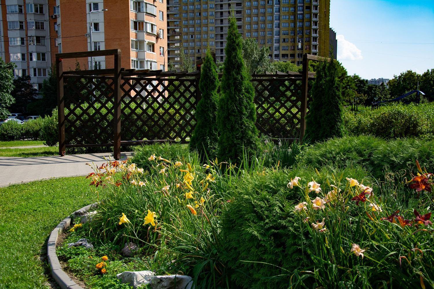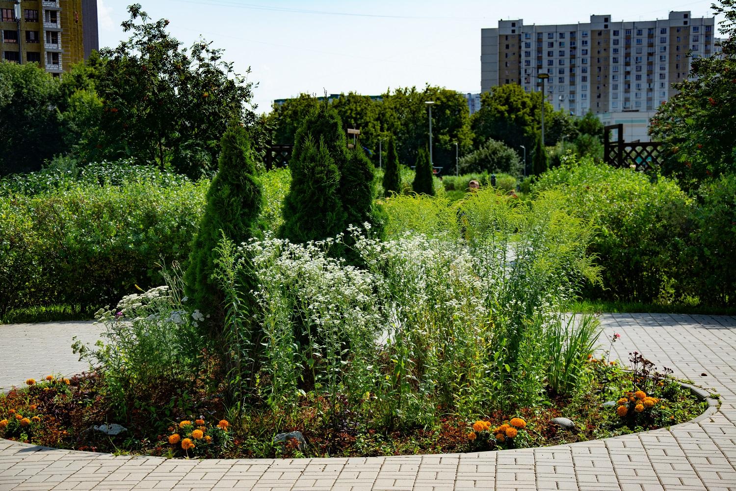В сквере есть спортивная и игровая зоны. Они соединены с пространствами для отдыха мощеной дорожкой, украшенной ажурными арками в форме сердца. Здесь оборудован большой игровой городок для детей разного возраста с деревянными комплексами, лазалками, балансирами и горками. Напротив обустроена зона воркаута с тренажерами. Если пройти до конца аллеи в сторону улицы Верхние Поля, можно обнаружить большую площадку для собак.