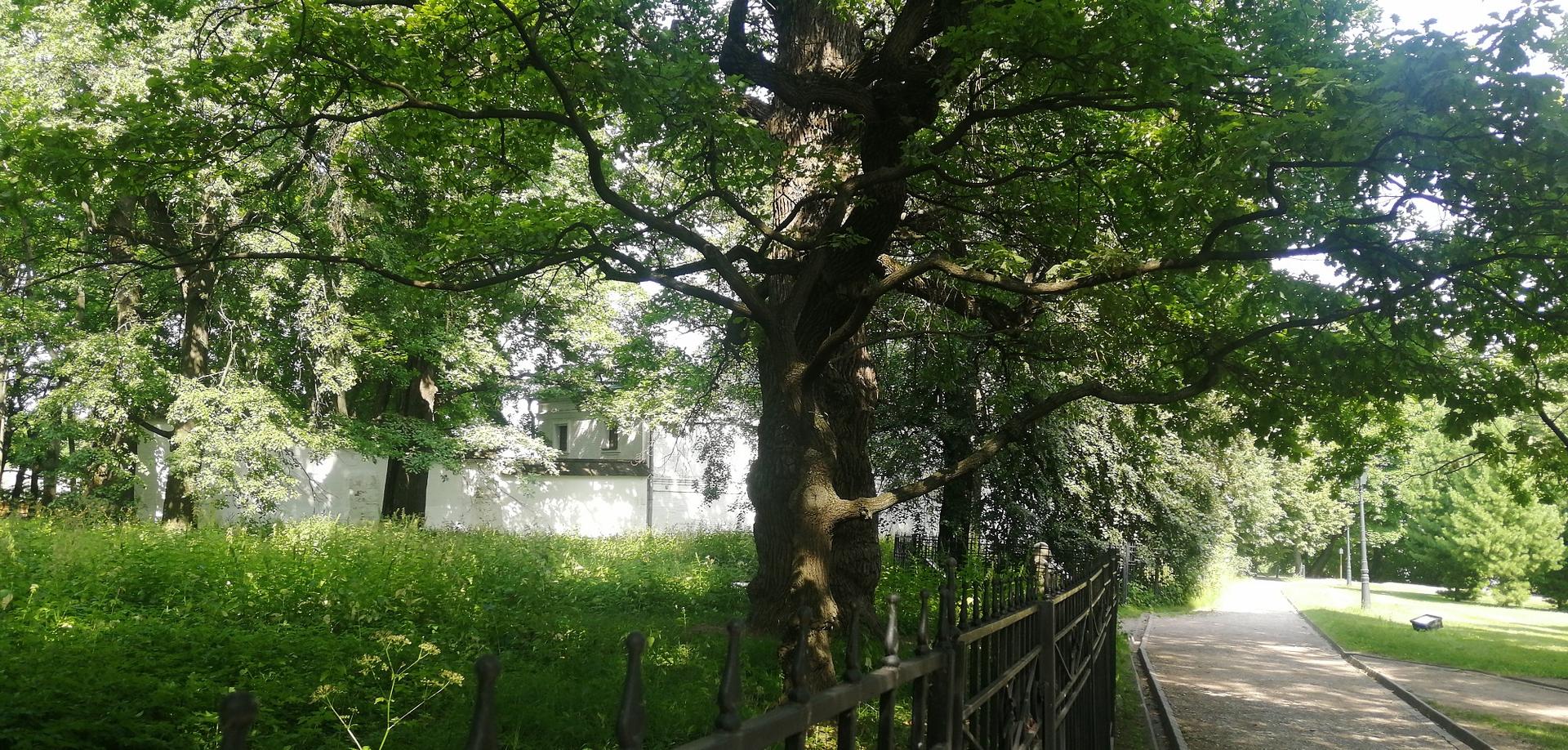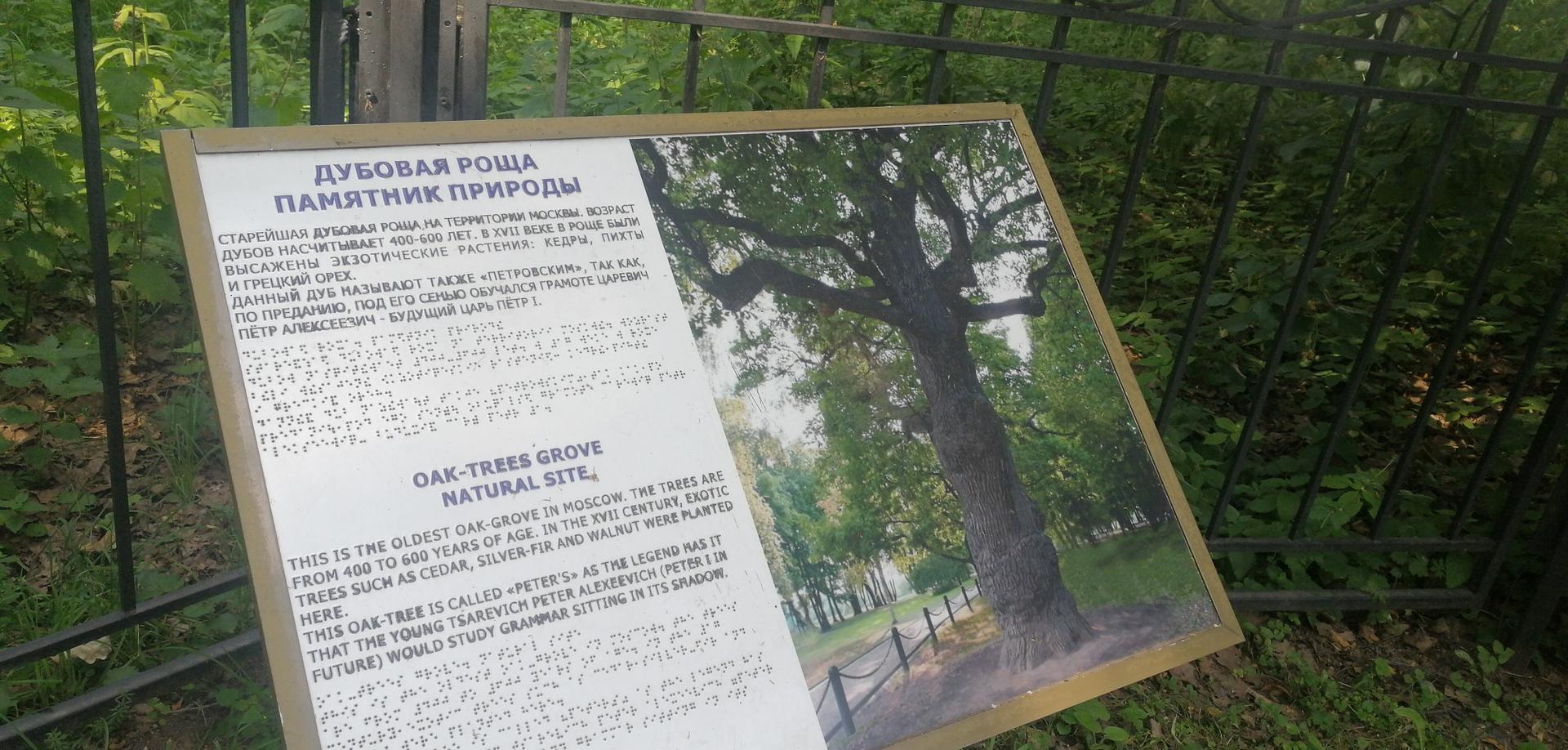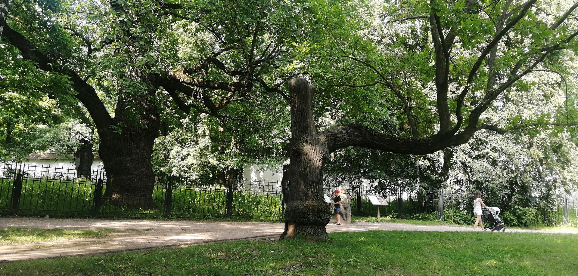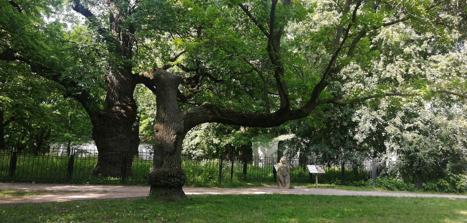 Дубовая роща находится между домиком Петра I и церковью Георгия Победоносца. Самому старшему дубу - 600 лет, его высота примерно 25 метров.