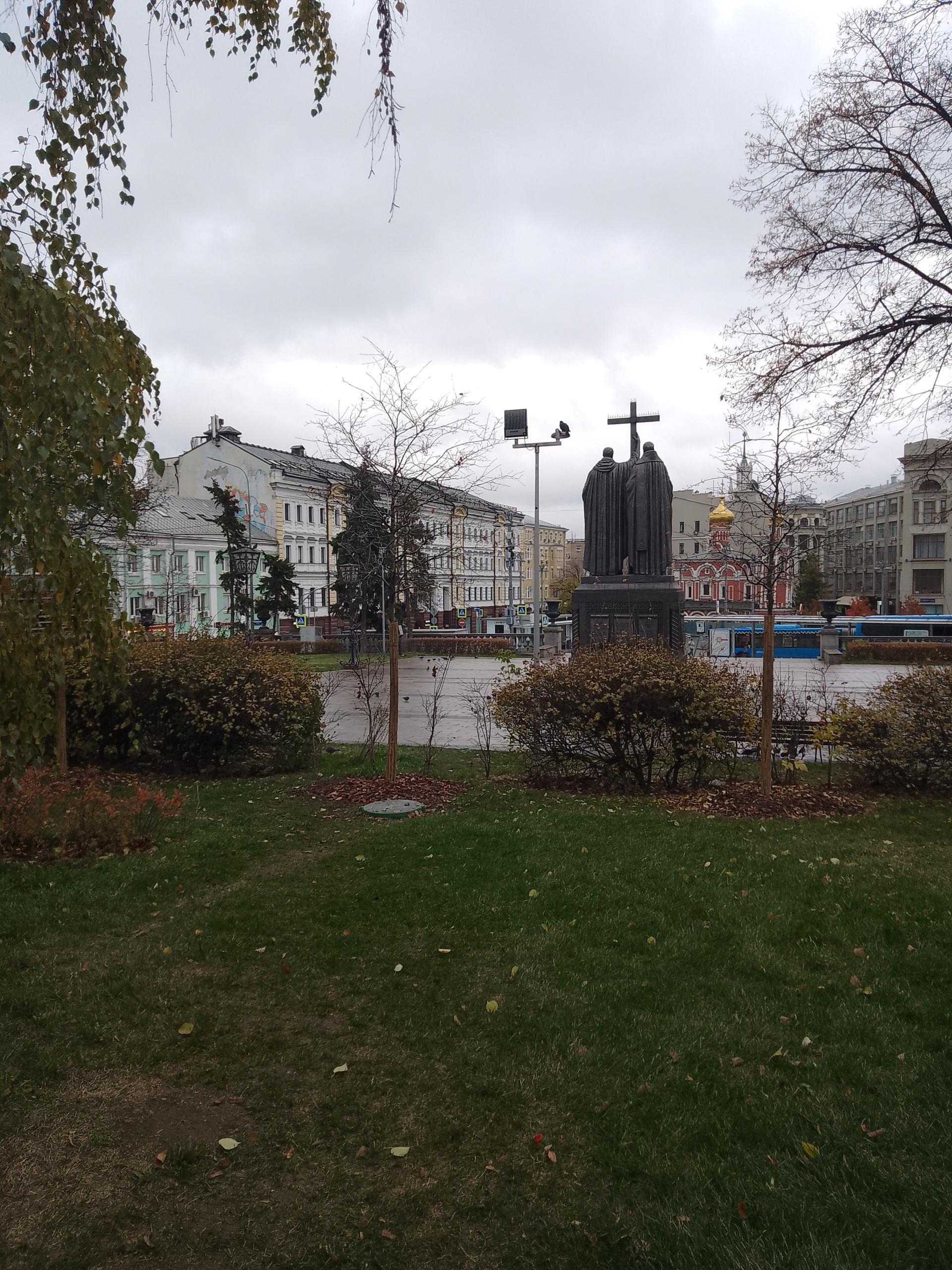 В 1991 г. в южной части сквера был поставлен памятник славянским просветителям равноапостольным Кириллу и Мефодию, и площадь, на которую выходит сквер, получила название Славянская. До этого, с 1924 г. площадь носила имя Ногина в честь революционного деятеля, заместителя народного комиссара труда Виктора Павловича Ногина. В сквере находился закладочный камень памятника революционеру.
