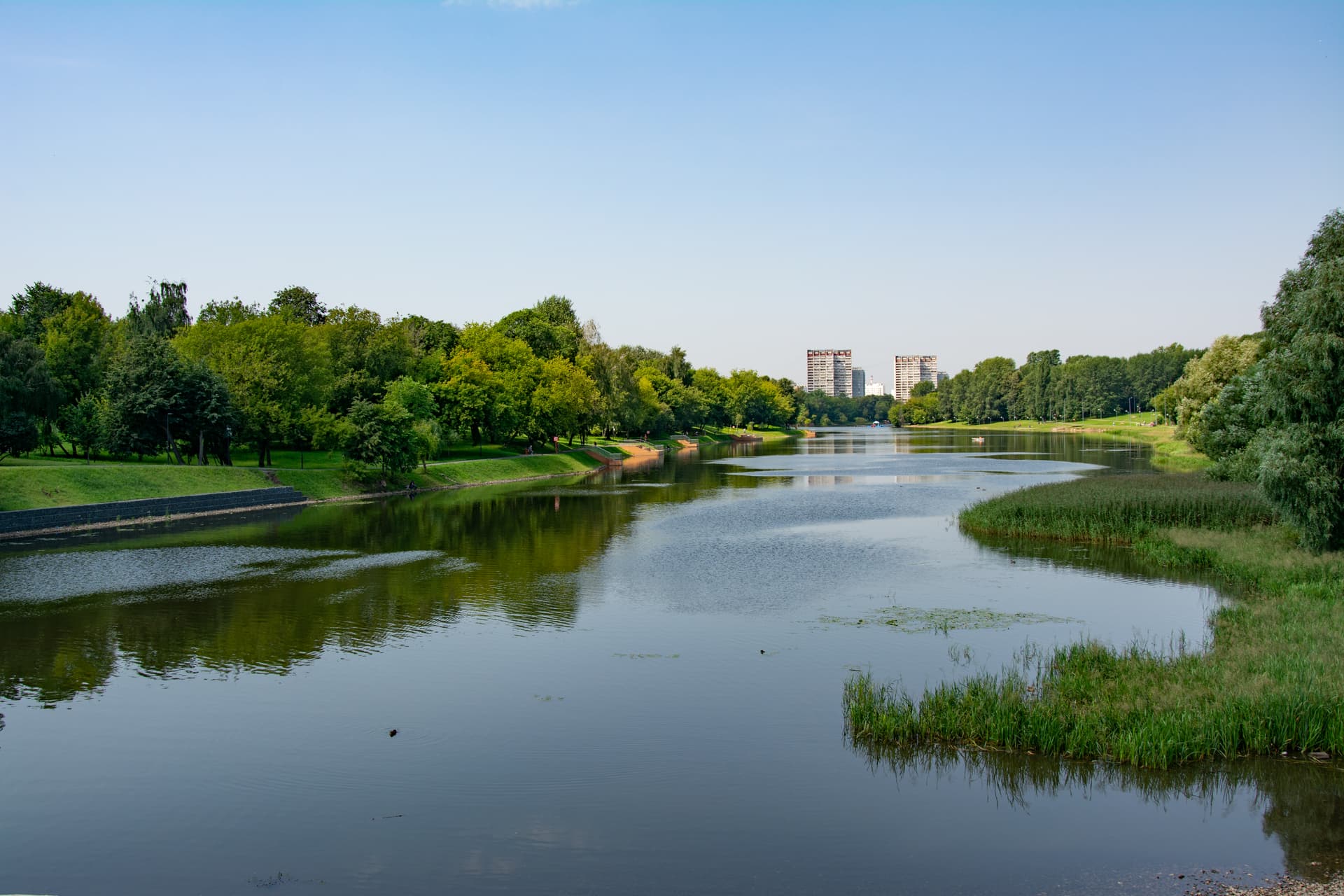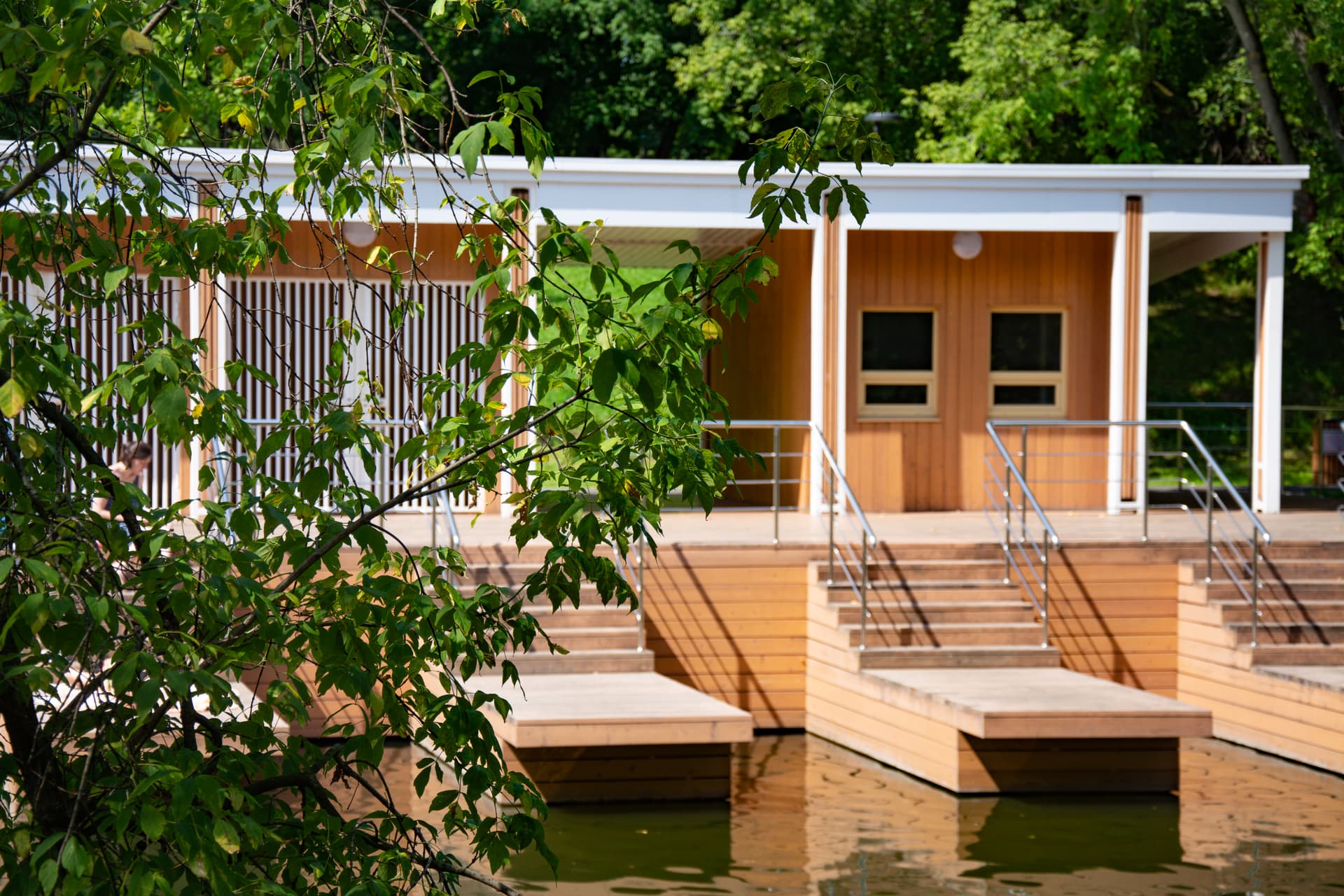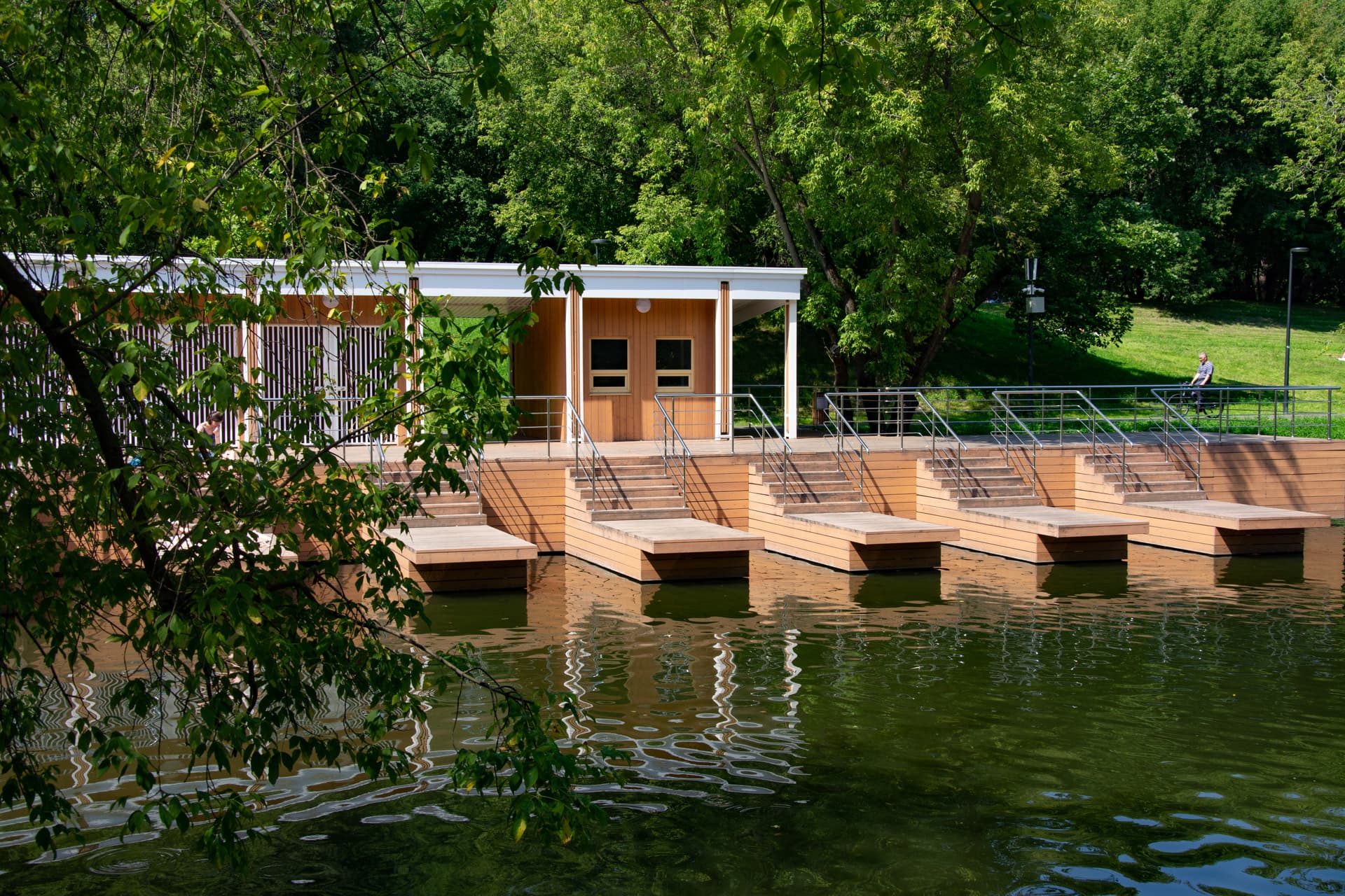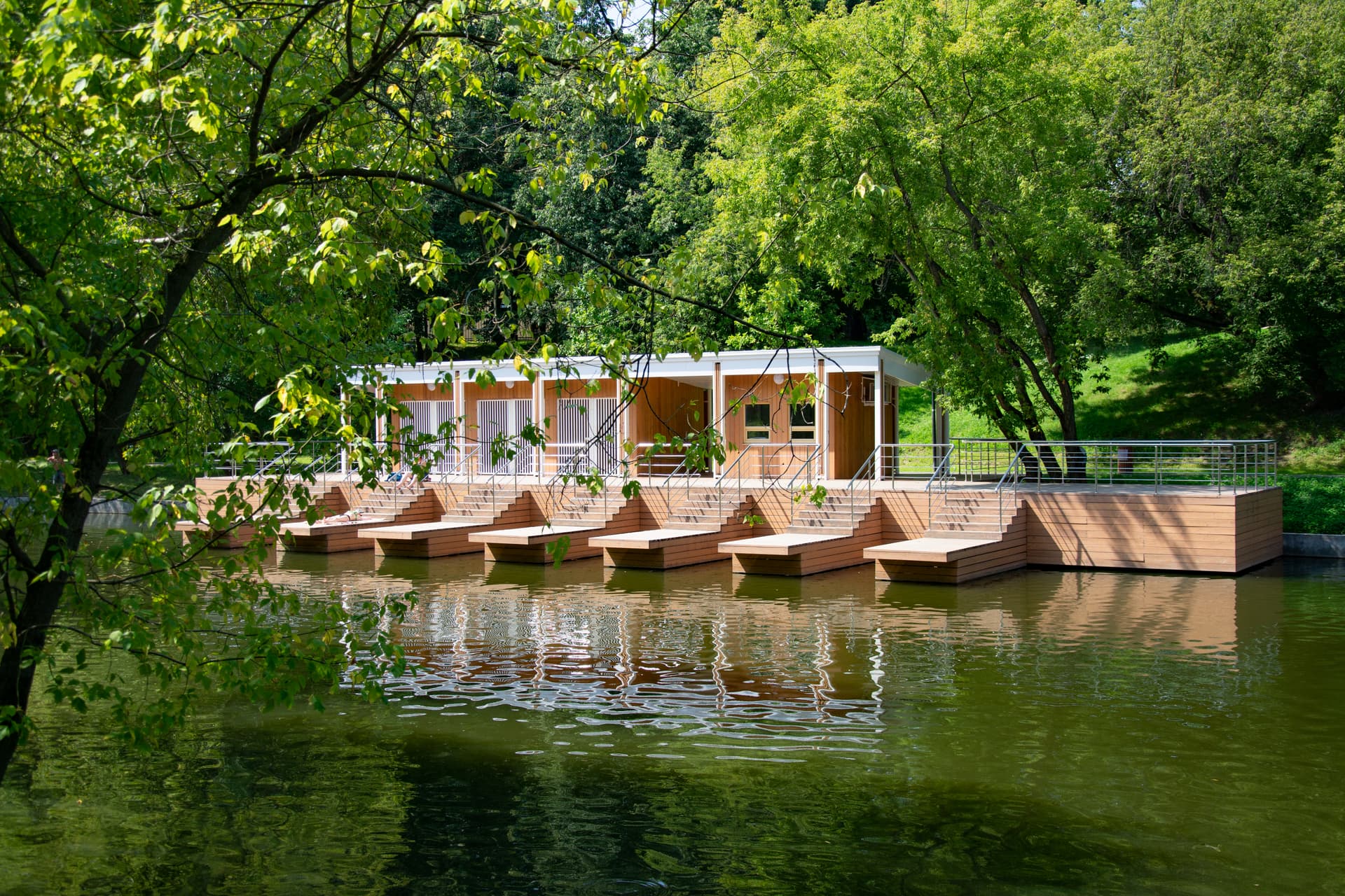На южном берегу восточного Люблинского пруда находится пляжная зона с зонтиками от солнца и деревянным настилом-спуском к воде.