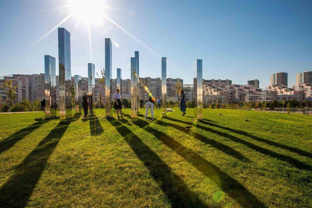 Во-первых, это красиво: на одном из холмов можно сделать уникальное селфи в «Зеркальном лабиринте» – этот арт-объект составлен из полированных до зеркального блеска столбов, тени от которых образуют запутанный маршрут. Севернее лабиринта, на другом холме, находится еще одна достопримечательность парка – большие панорамные качели, на которых действительно чувствуешь себя немного пилотом. Их отличительная черта от других подобных – установленные на каркасе сверху «колпачки»-ветроуказатели в красно-белую полоску – точно такие же используются на аэродромах.