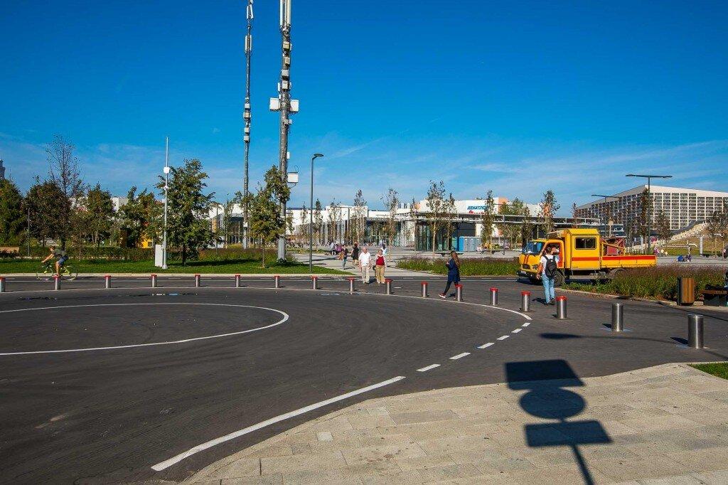 Давайте разберемся, как в парке всё устроено. Сразу у станции метро «ЦСКА» начинается транзитная зона «А». Наземные вестибюли станции выглядят необычно – в виде травяных холмов, на верху которых обустроены смотровые площадки. Благодаря такому решению современные конструкции, с одной стороны, «замаскированы» под зеленым покровом, а с другой – защищают посетителей парка от сквозняков, да что там – сильнейших порывов ветра, характерных для подобных открытых пространств.