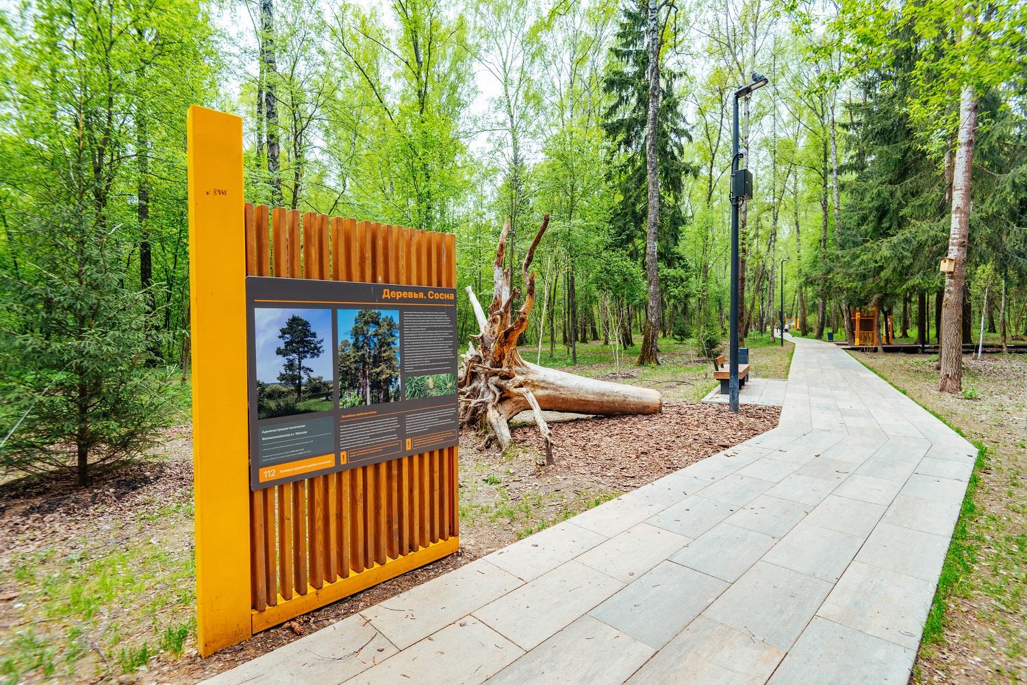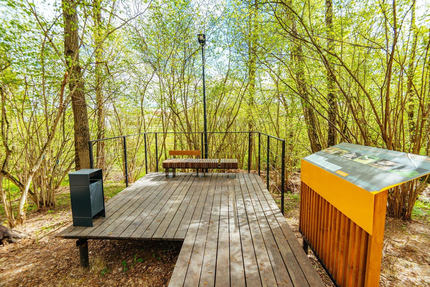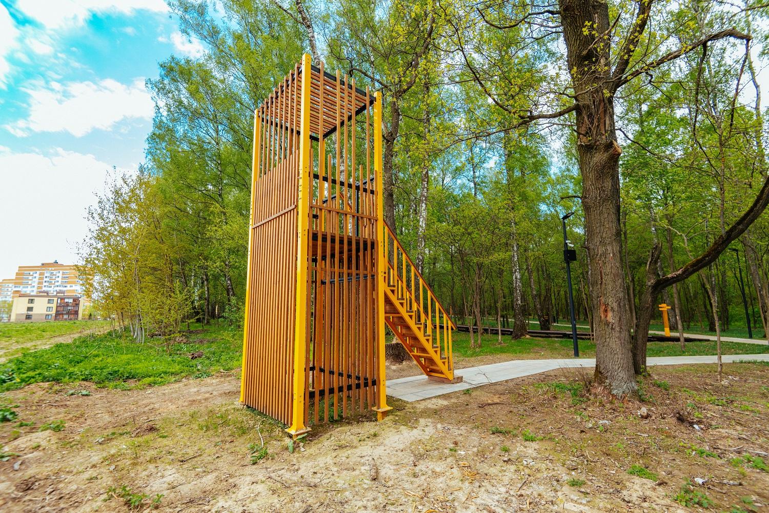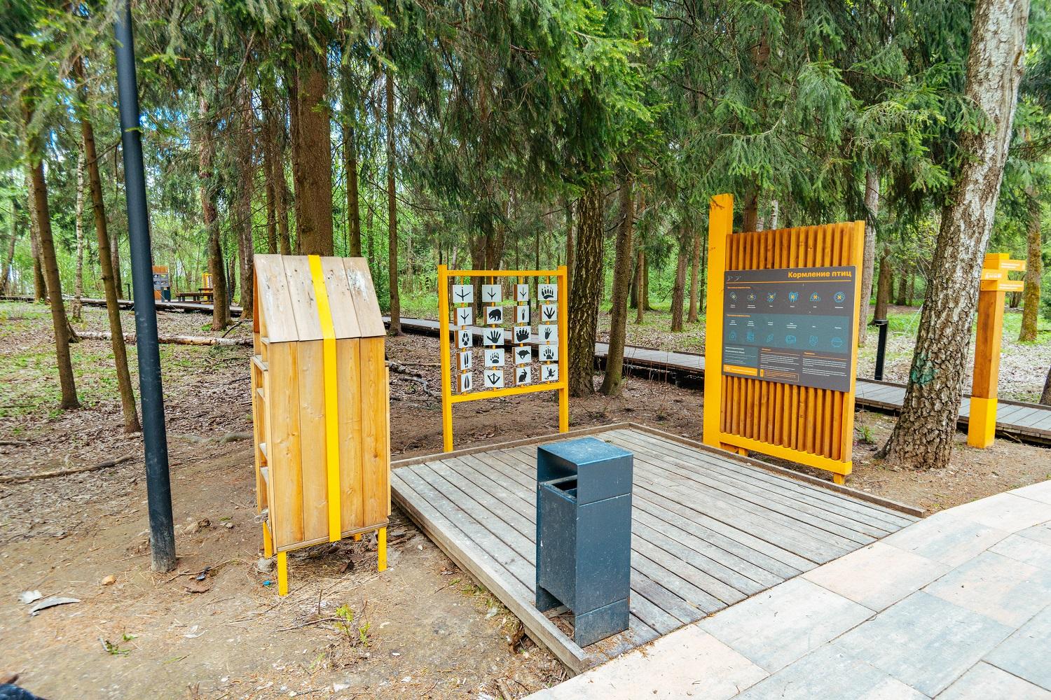 Лесной массив занимает 70% всей территории парка. Помимо детских площадок в экостиле – полностью из дерева и таких же воркаутов, здесь есть интерактивные стенды, рассказывающие о том, как отличить следы разных животных и стволы деревьев, как кормить птиц, и какие насекомые обитают на этой территории. Здесь есть две вышки для бердвотчинга – любительского наблюдения за птицами. По всему парку проложена деревянная экотропа на сваях, а для любителей скандинавской ходьбы есть индивидуальный маршрут из мульчи. Все перголы и стенды выполнены в цвете желтка или цыплячьего пера.