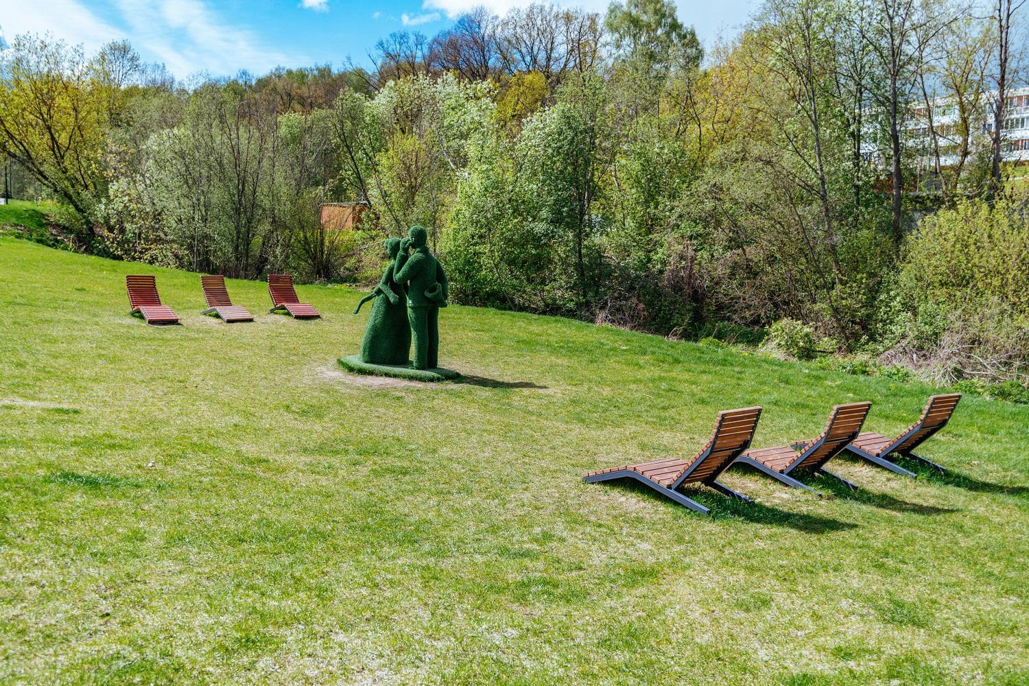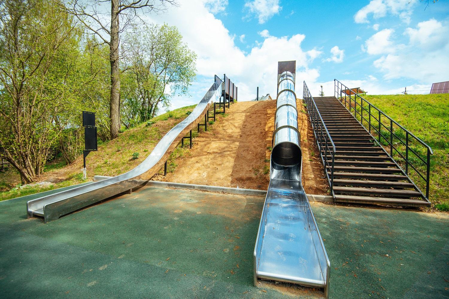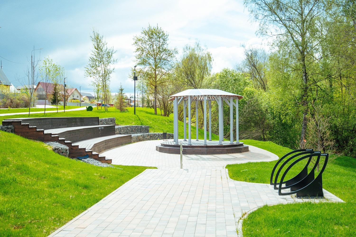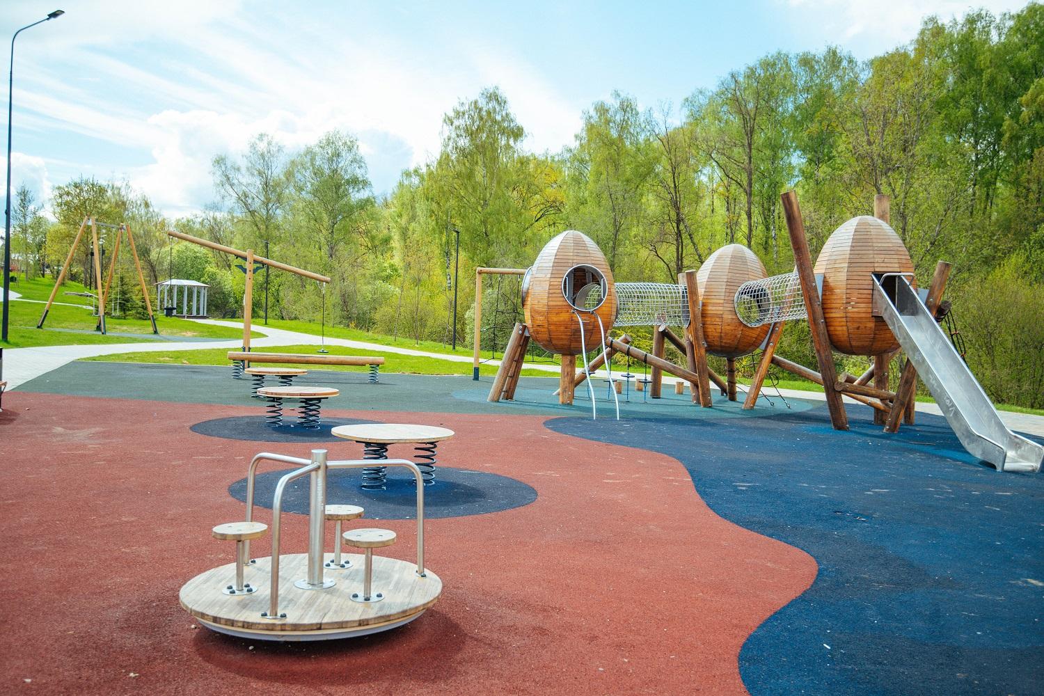 Лесной массив занимает 70% всей территории парка. Помимо детских площадок в экостиле – полностью из дерева и таких же воркаутов, здесь есть интерактивные стенды, рассказывающие о том, как отличить следы разных животных и стволы деревьев, как кормить птиц, и какие насекомые обитают на этой территории. Здесь есть две вышки для бердвотчинга – любительского наблюдения за птицами. По всему парку проложена деревянная экотропа на сваях, а для любителей скандинавской ходьбы есть индивидуальный маршрут из мульчи. Все перголы и стенды выполнены в цвете желтка или цыплячьего пера.