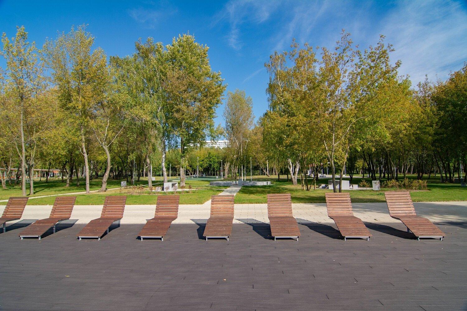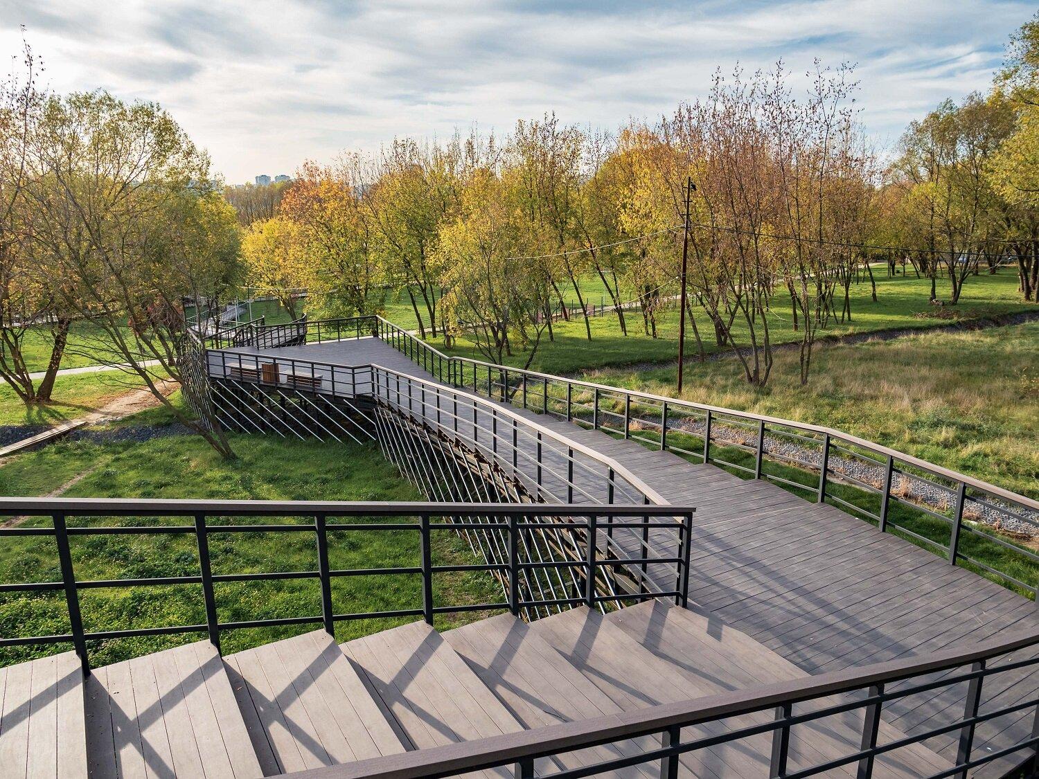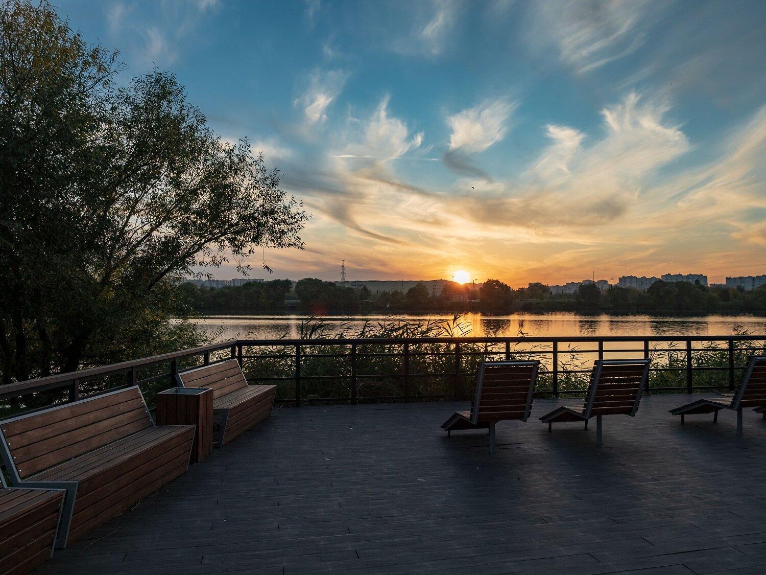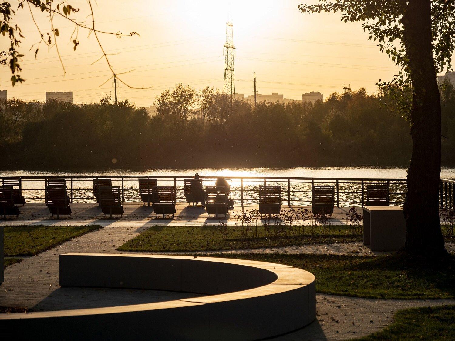 Парк на набережной площадью более 50 га стал жемчужиной обновленного района. Здесь сохранена уникальная природа берега Москвы-реки. Например, заболоченные участки не только не осушили, но и подчеркнули: высадили влаголюбивые растения и пустили эко-тропы. Одна «парящая» эко-тропа с «островками созерцания» протянулась на 800 метров, вторая – на 450 метров. Их каркас смонтирован на винтовых сваях и для удобства посетителей огражден поручнями, а для красоты – выложен террасной доской. Кроме того, на берегу создали смотровые площадки. Отсюда открываются живописные виды на запад, а следовательно, и на закаты.