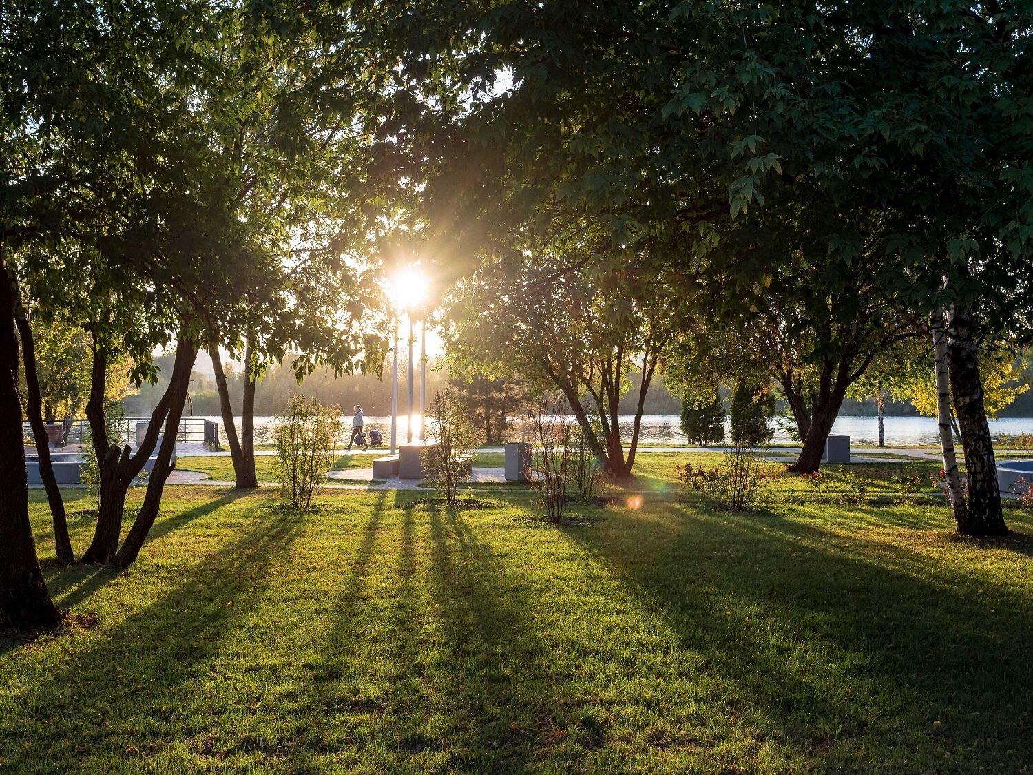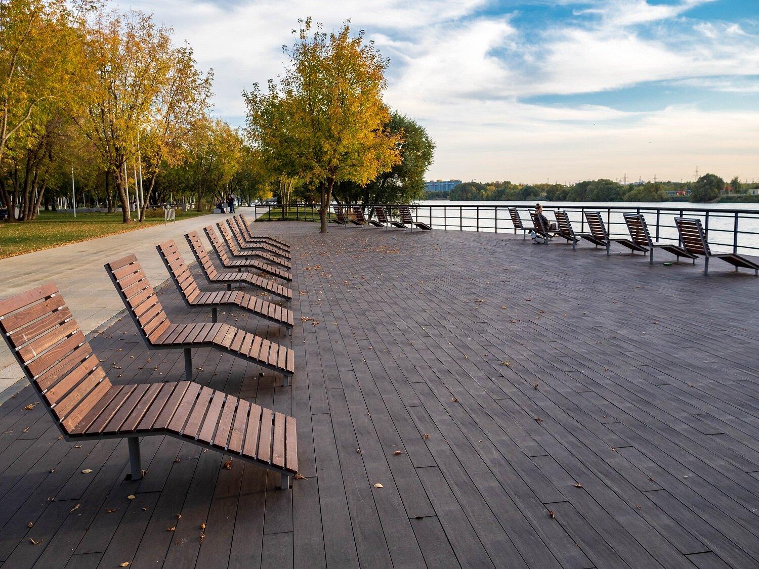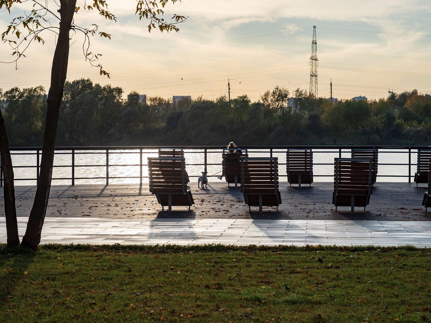 Парк на набережной площадью более 50 га стал жемчужиной обновленного района. Здесь сохранена уникальная природа берега Москвы-реки. Например, заболоченные участки не только не осушили, но и подчеркнули: высадили влаголюбивые растения и пустили эко-тропы. Одна «парящая» эко-тропа с «островками созерцания» протянулась на 800 метров, вторая – на 450 метров. Их каркас смонтирован на винтовых сваях и для удобства посетителей огражден поручнями, а для красоты – выложен террасной доской. Кроме того, на берегу создали смотровые площадки. Отсюда открываются живописные виды на запад, а следовательно, и на закаты.