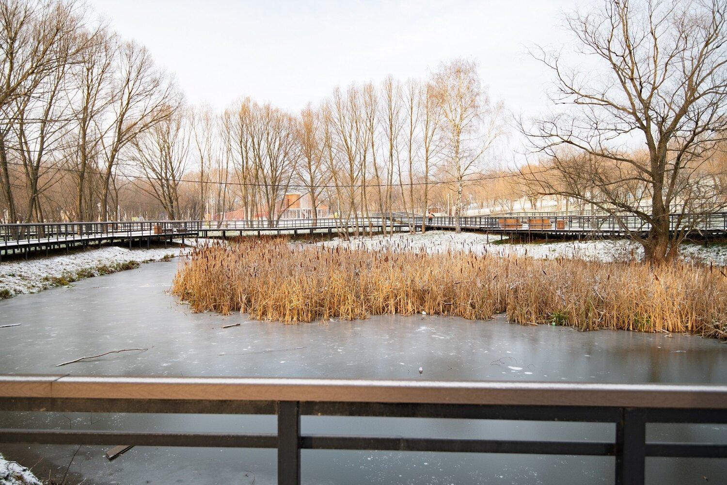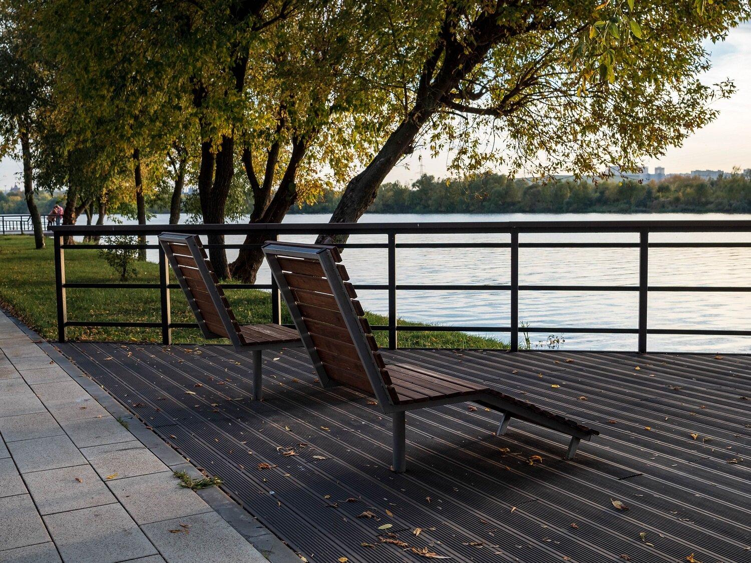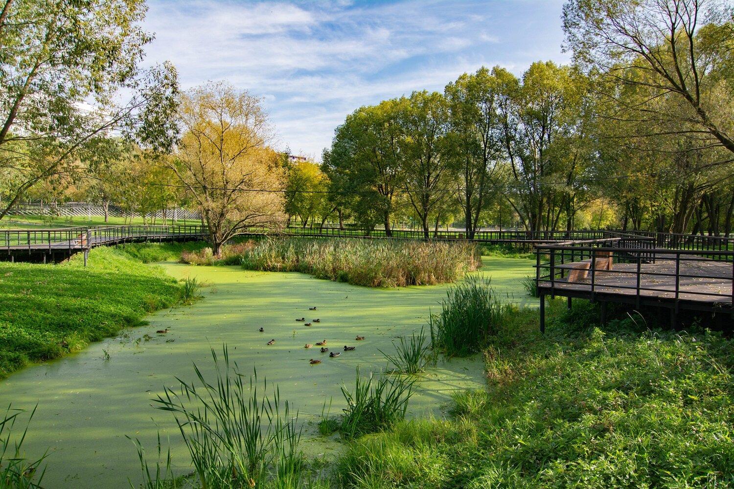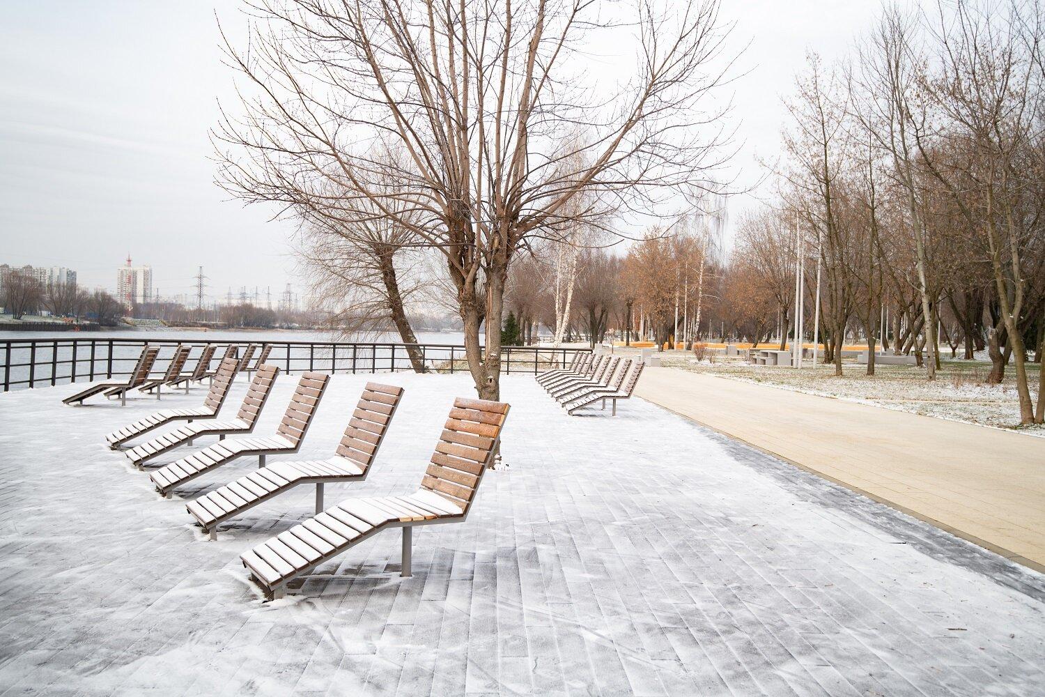 Парк на набережной площадью более 50 га стал жемчужиной обновленного района. Здесь сохранена уникальная природа берега Москвы-реки. Например, заболоченные участки не только не осушили, но и подчеркнули: высадили влаголюбивые растения и пустили эко-тропы. Одна «парящая» эко-тропа с «островками созерцания» протянулась на 800 метров, вторая – на 450 метров. Их каркас смонтирован на винтовых сваях и для удобства посетителей огражден поручнями, а для красоты – выложен террасной доской. Кроме того, на берегу создали смотровые площадки. Отсюда открываются живописные виды на запад, а следовательно, и на закаты.