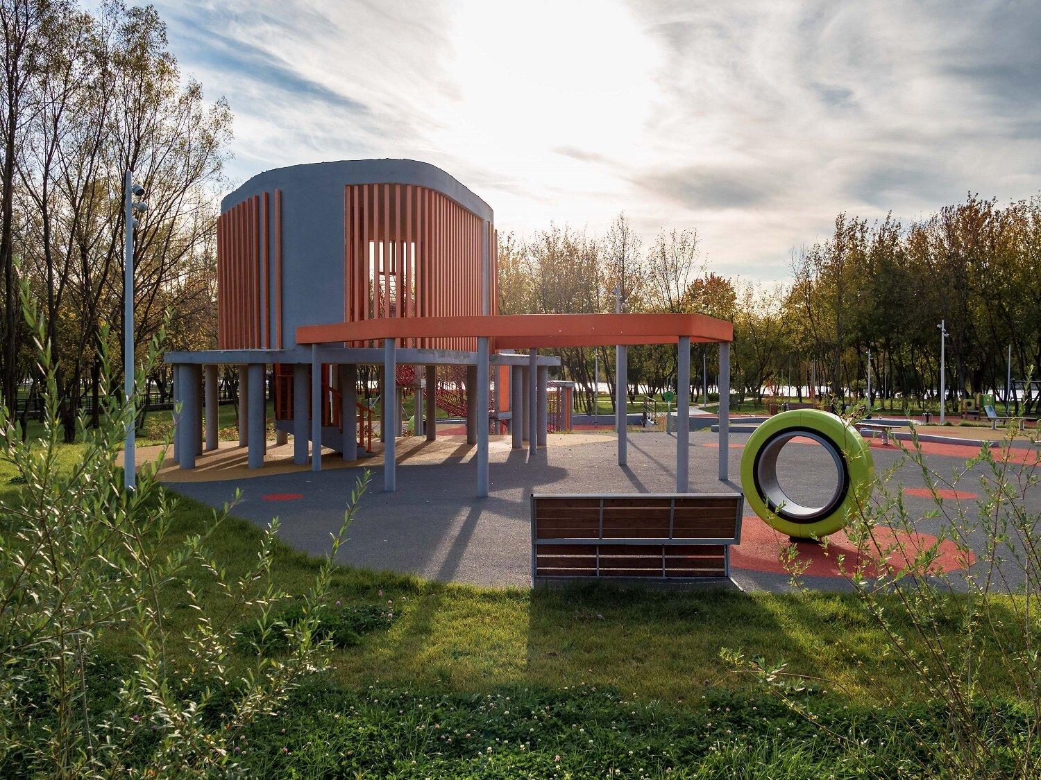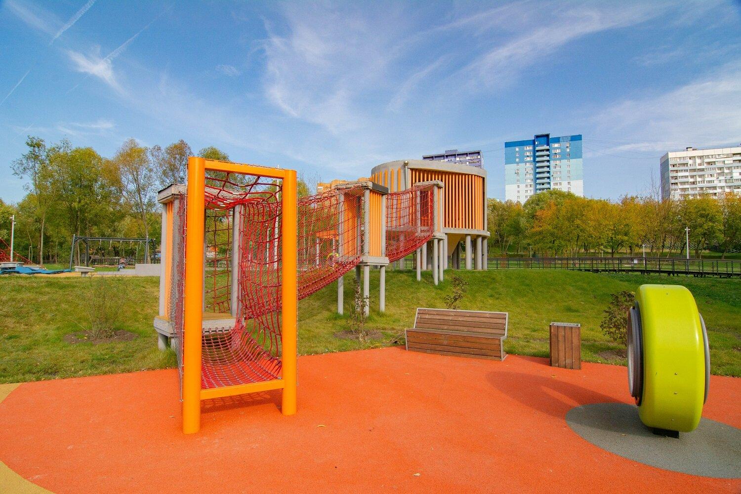 Из-за того, что естественный перепад высот от Москвы-реки до жилых домов составлял до 16 метров, парк решили делать по террасному принципу. Вот почему рельеф здесь ярусный – даже одна из детских площадок тут многоуровневая (с одного уровня на другой можно спуститься либо по лестнице, либо по веревочным конструкциям).