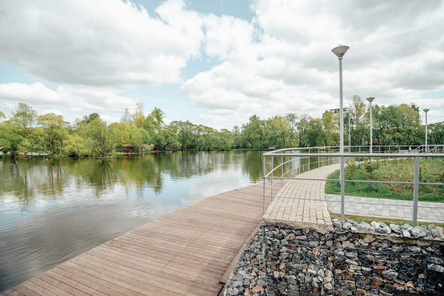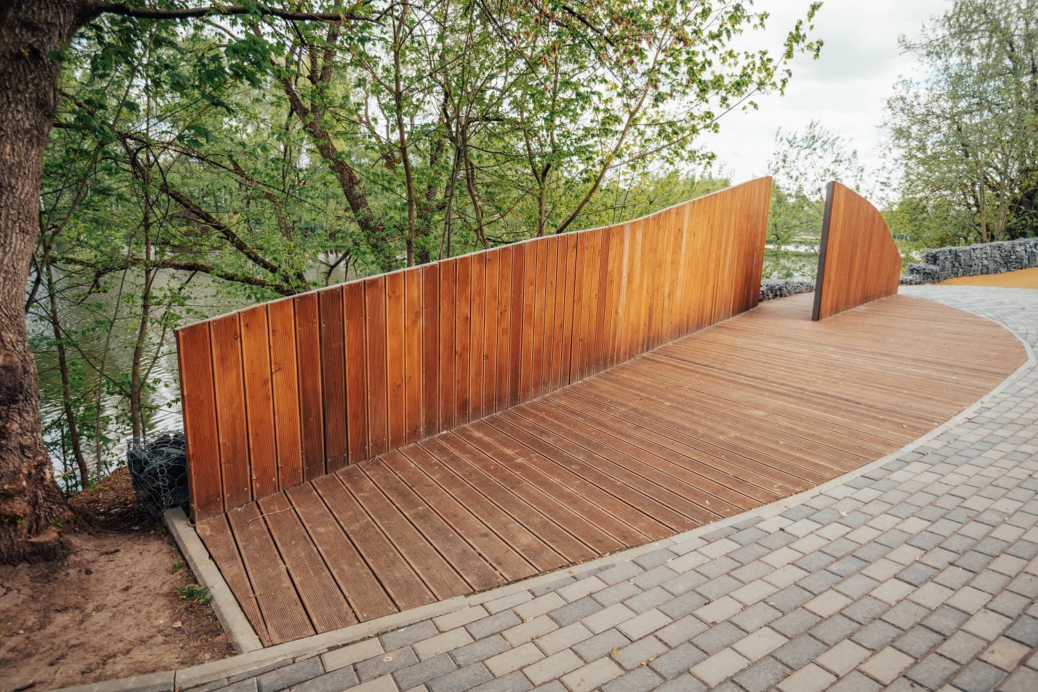 Пространство на правом берегу реки Десны – это еще один пример многофункционального экопарка. Все детские площадки выполнены здесь из дерева. При этом архитектурные решения гармонично вписаны в уже существующий ландшафт. Например, у самой воды расположена деревянная набережная, лодочная станция и смотровая площадка. Чуть выше, под кронами деревьев, установлена деревянная сцена и волнообразный амфитеатр. На возвышении левее – детские площадки и гамаки для тихого отдыха, а в большой нише установили три горки. На территории также есть множество урн для раздельного сбора мусора.