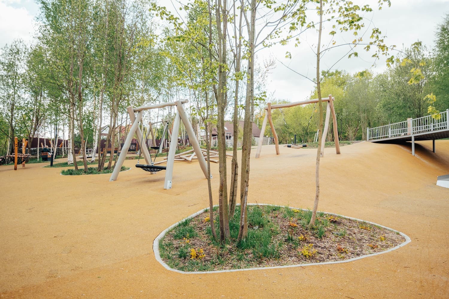 На всей территории расставлены детские игровые комплексы из дерева с канатными элементами, качелями и каруселями. Есть две тарзанки для детей разного роста и возраста. Для родителей рядом обустроены гамаки.