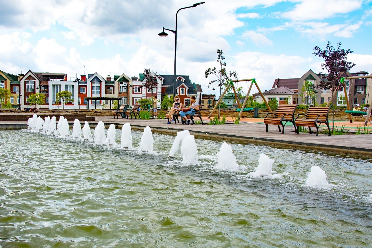 Исторической аутентичности пространству добавляют и огромные полуобтёсанные камни из архитектурного бетона, художественно «разбросанные» недалеко от, пожалуй, главной «изюминки» парка «Пальмира» – фонтана «два в одном». Форма его бассейна необычна и состоит из двух прямоугольных чаш, разделенных мостиком. В одной из них прямо из воды вверх бьют несколько десятков струй, а другая напоминает мелкую речушку где-нибудь в горах – в ней даже есть несильное течение. И пока дети с восторгом проходят увлекательный игровой квест, прыгая по выступающим валунам, родители наблюдают за ними, сидя на деревянных настилах вокруг фонтана.