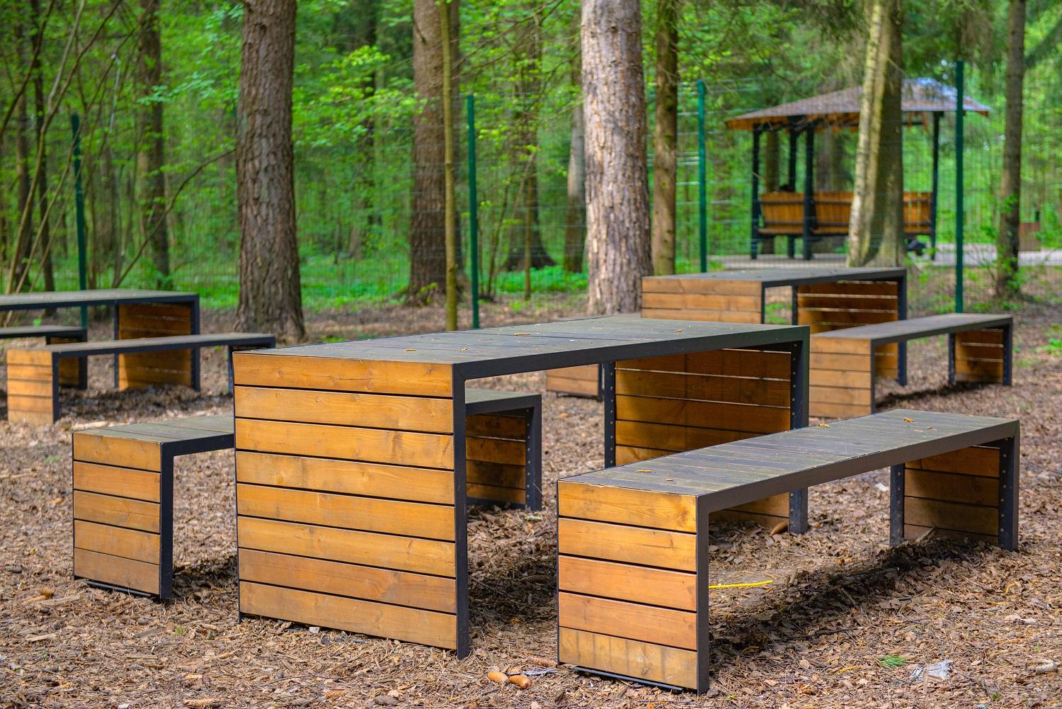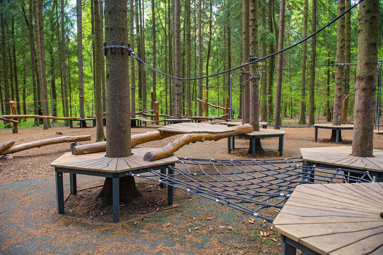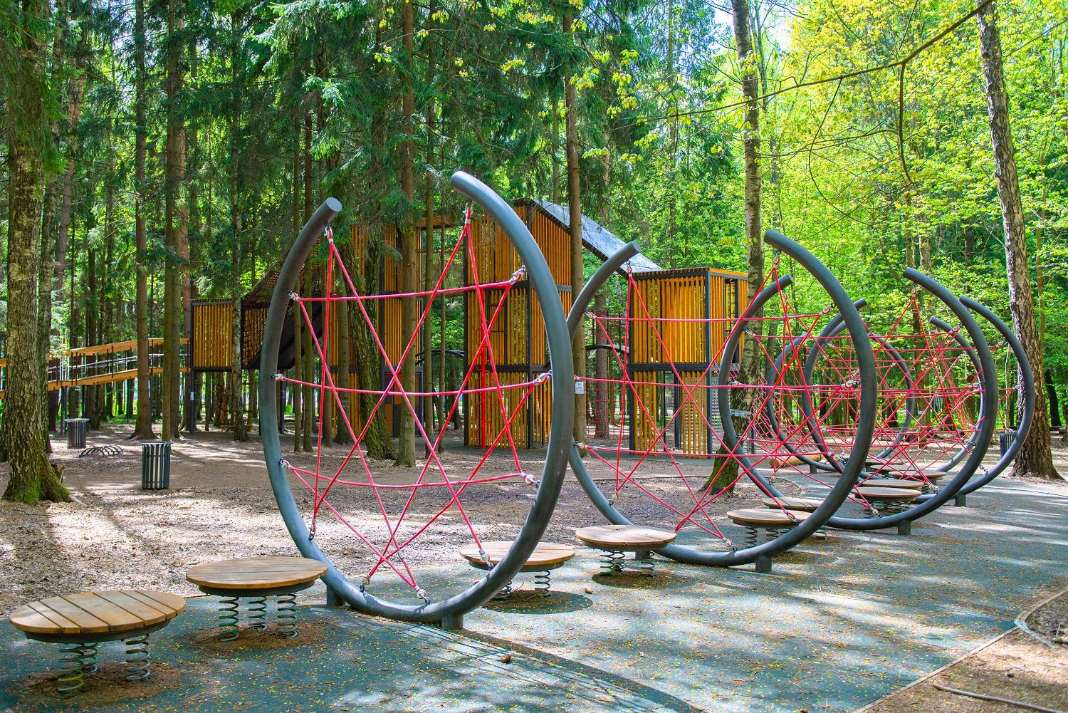 В парке оборудовано две площадки для активных игр – пространство «Палки-Елки» и «Полоса препятствий». Первая рассчитана на детей ростом от 120 см. Здесь могут играть одновременно до 30 человек. Площадь игровой зоны составила почти 1000 квадратных метров. В этом небольшом веревочном парке с различными брусьями и балансировочными тренажерами обустроена и тарзанка. Родители могут отдохнуть в ближайшей беседке или за столиками для пикника.