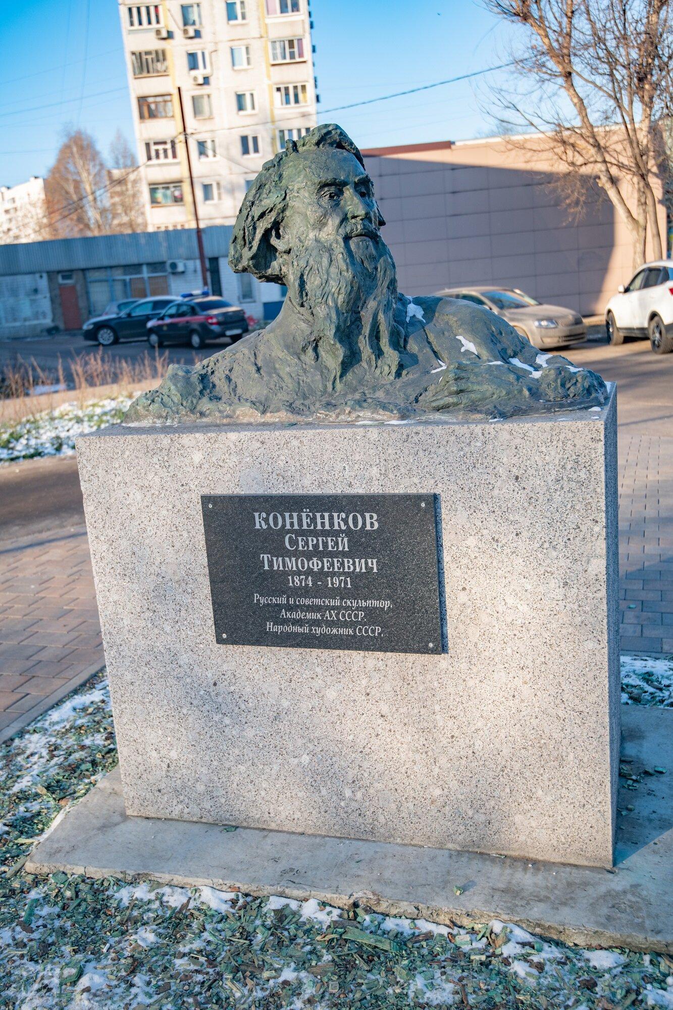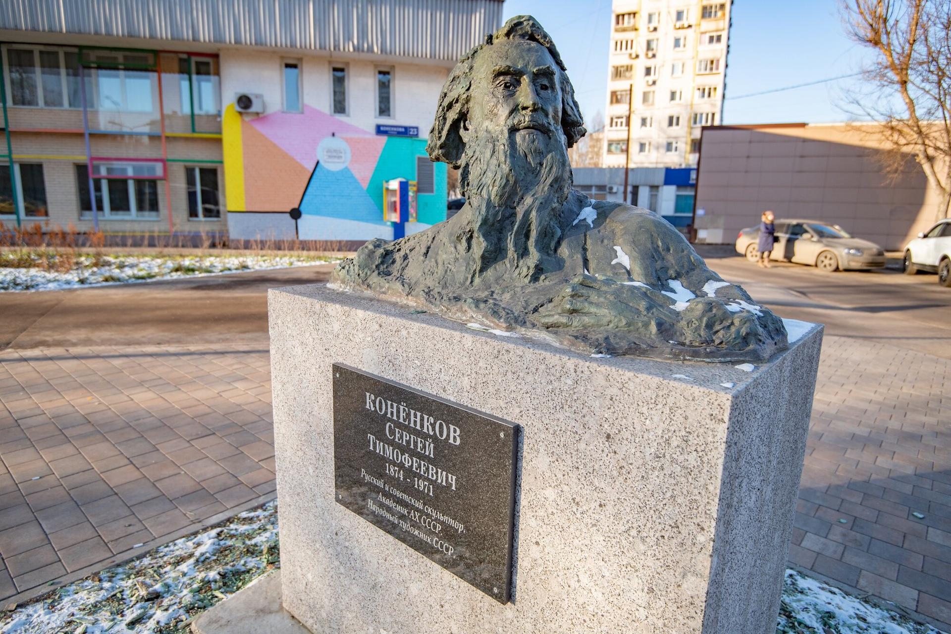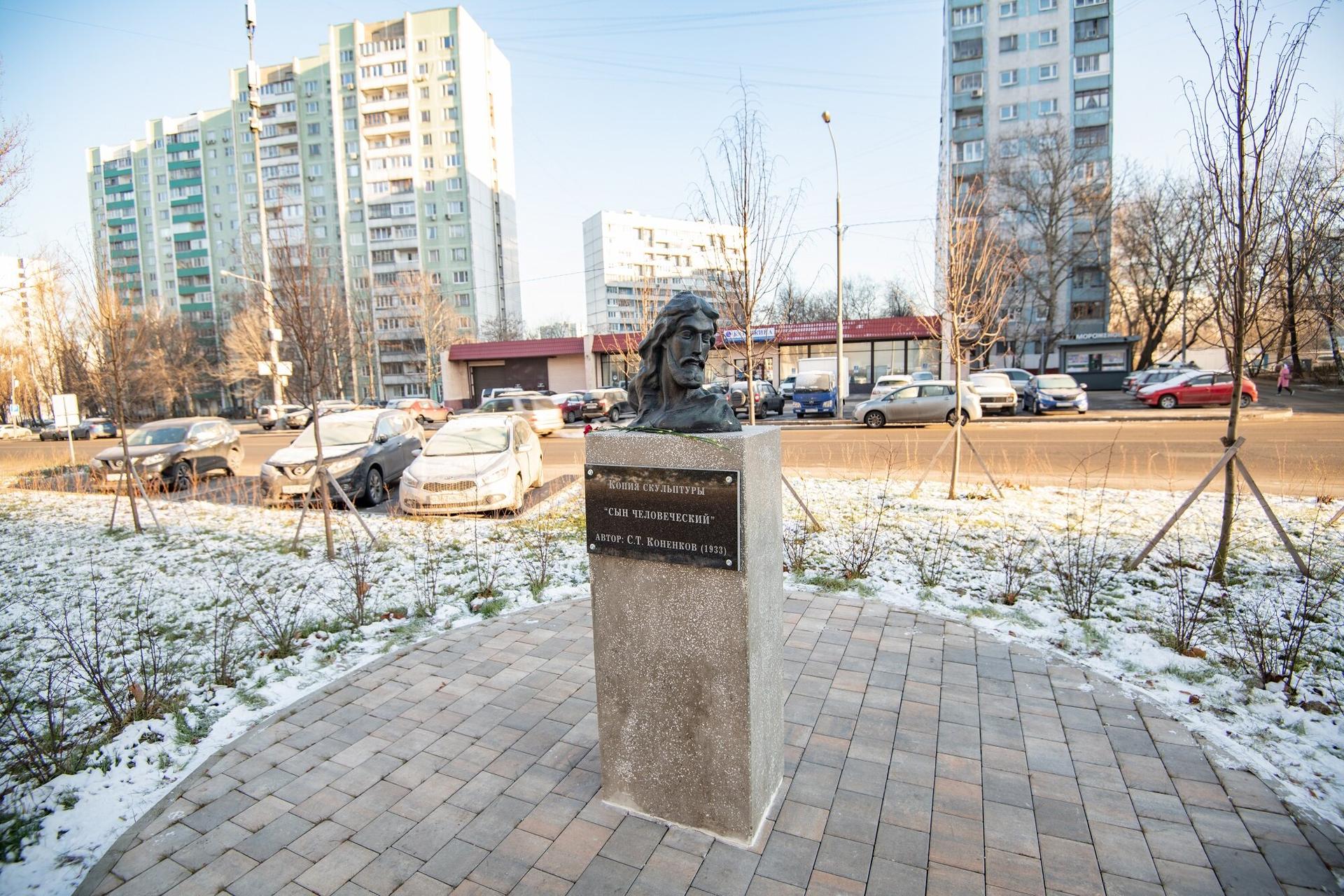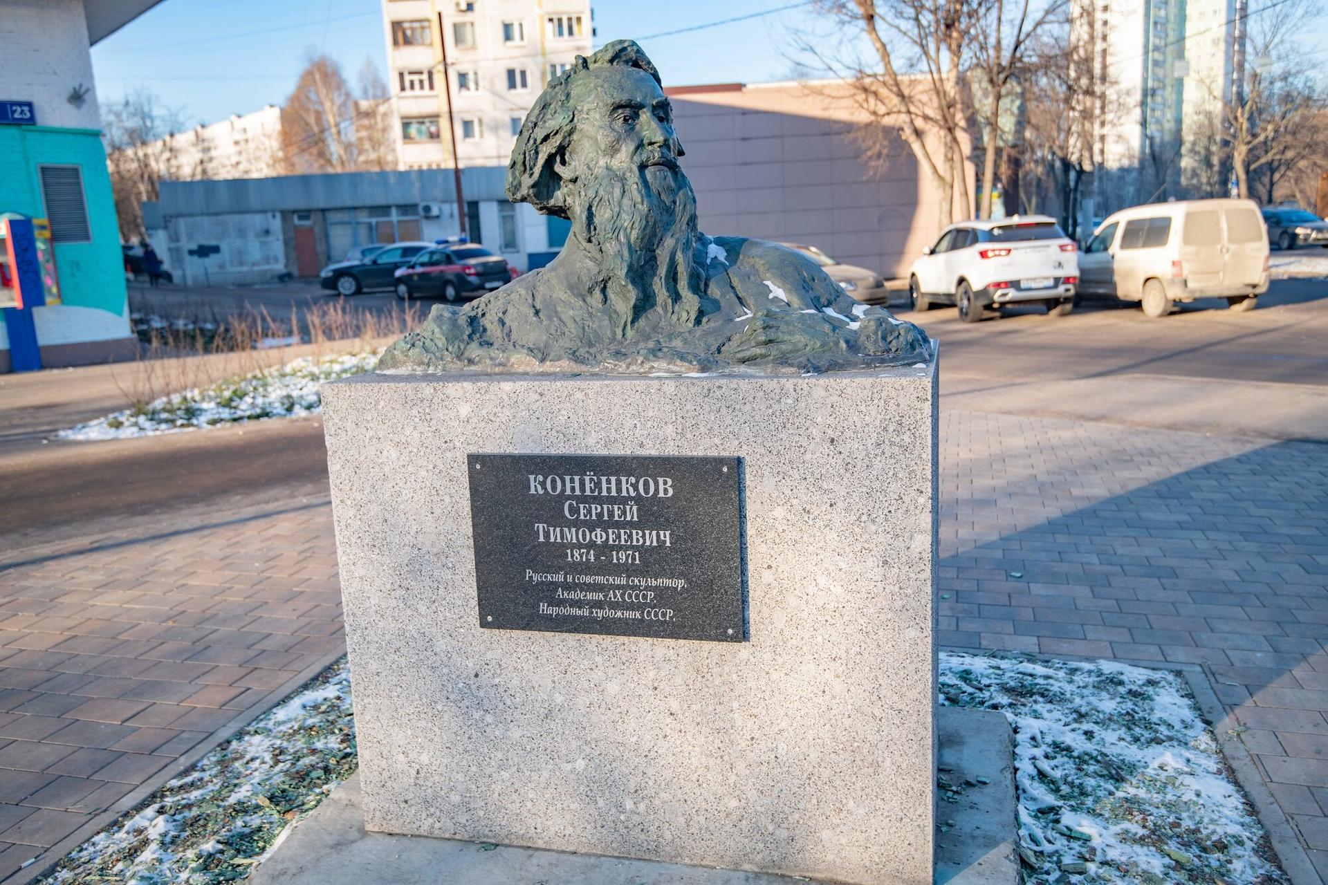 На пересечении улиц Коненкова и Лескова еще до появления парка был установлен памятный бюст Сергея Коненкова – копия с его скульптурного автопортрета.